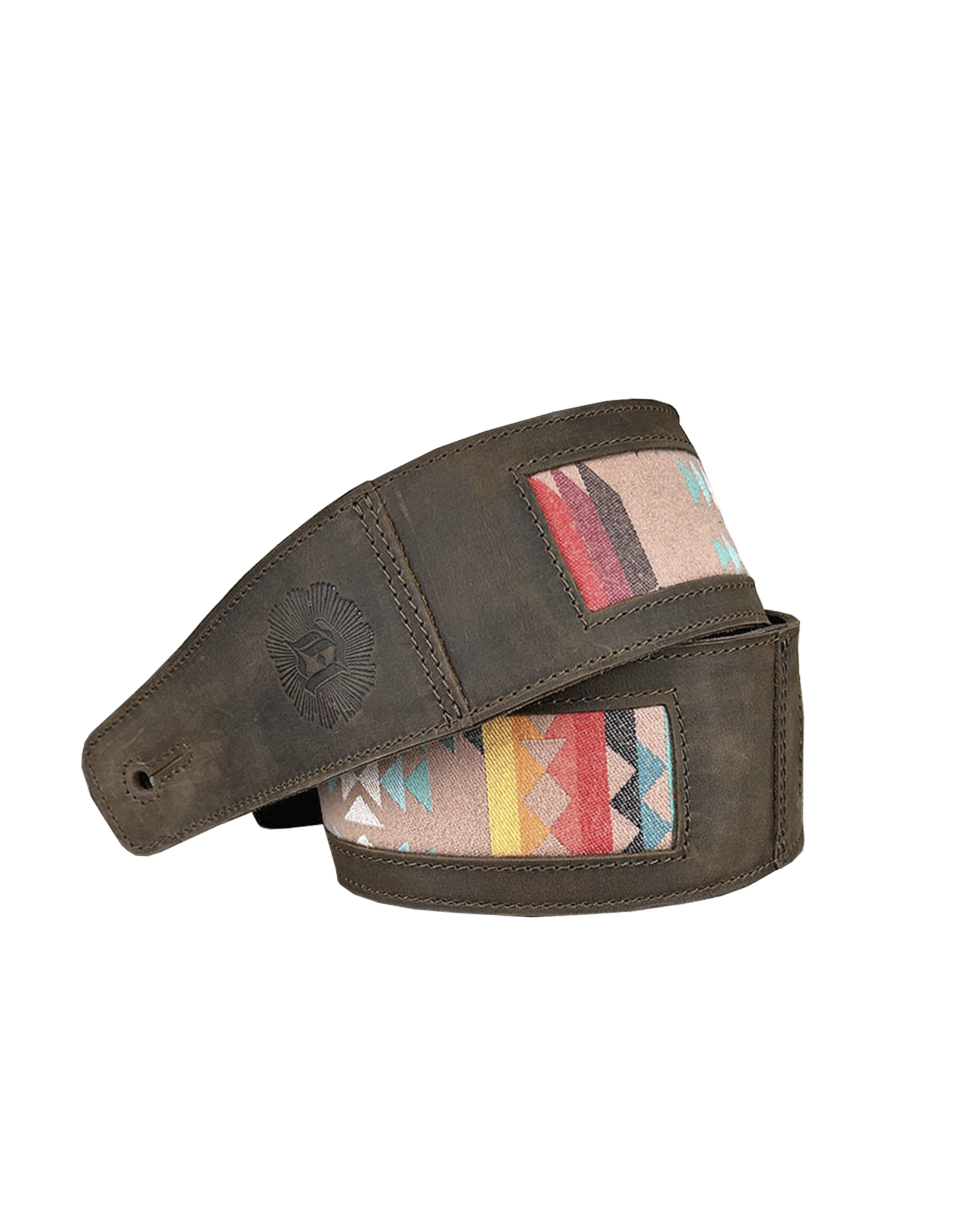 A bold, small-batch strap featuring vibrant Southwestern-inspired fabric inlays set into rich whiskey-brown full-grain leather. Each strap is part of a limited run and individually numbered (“X of Y” in gold foil). Numbers are assigned at random.