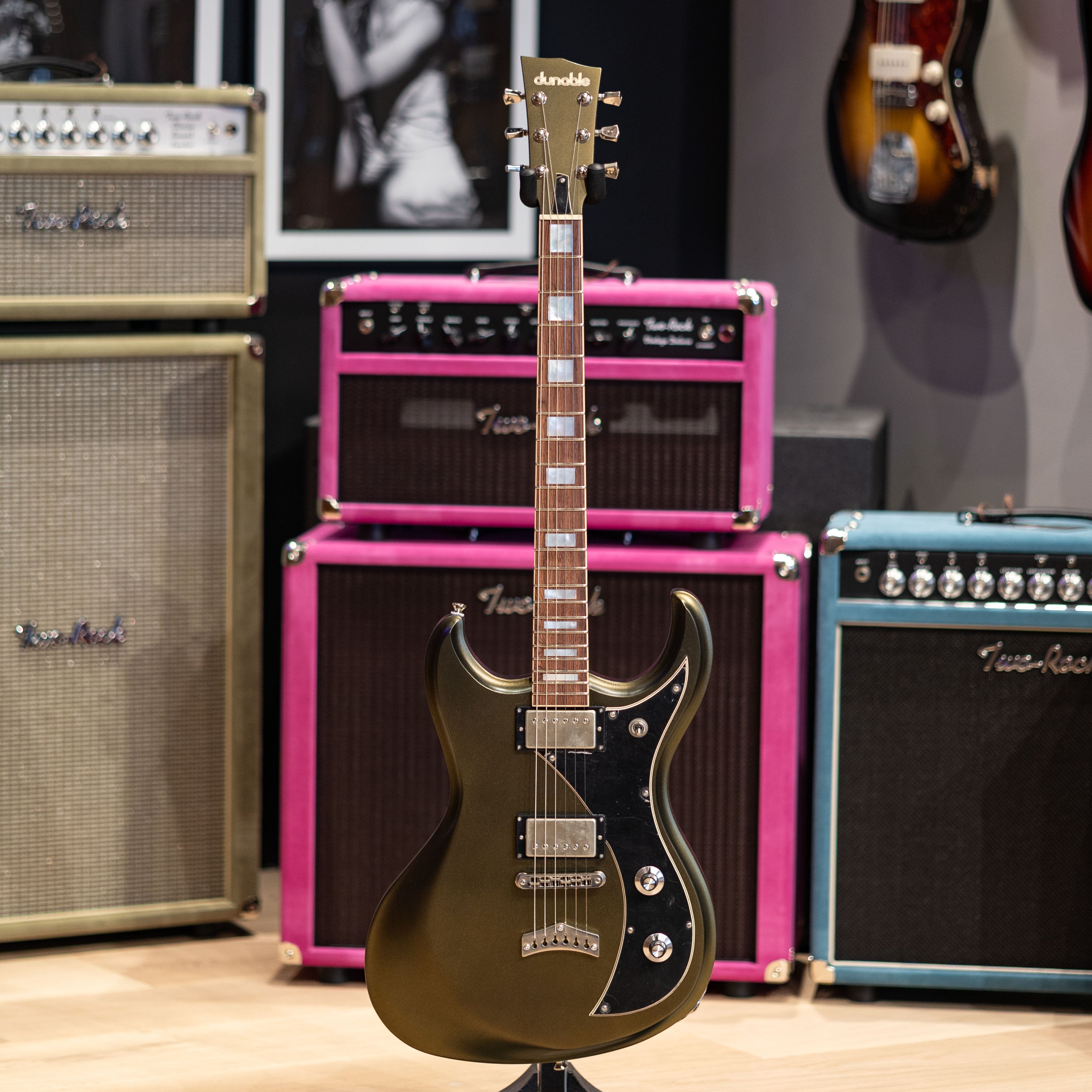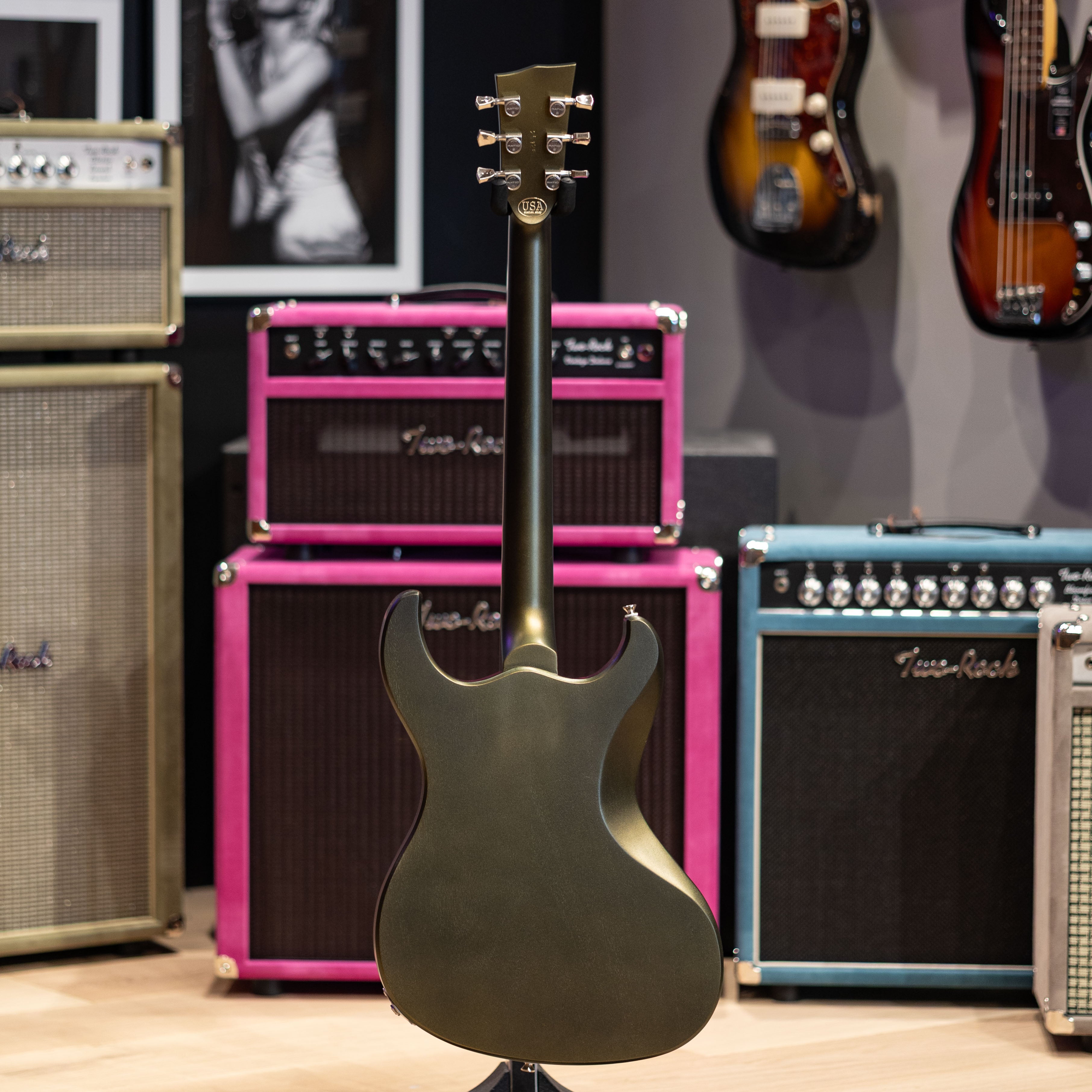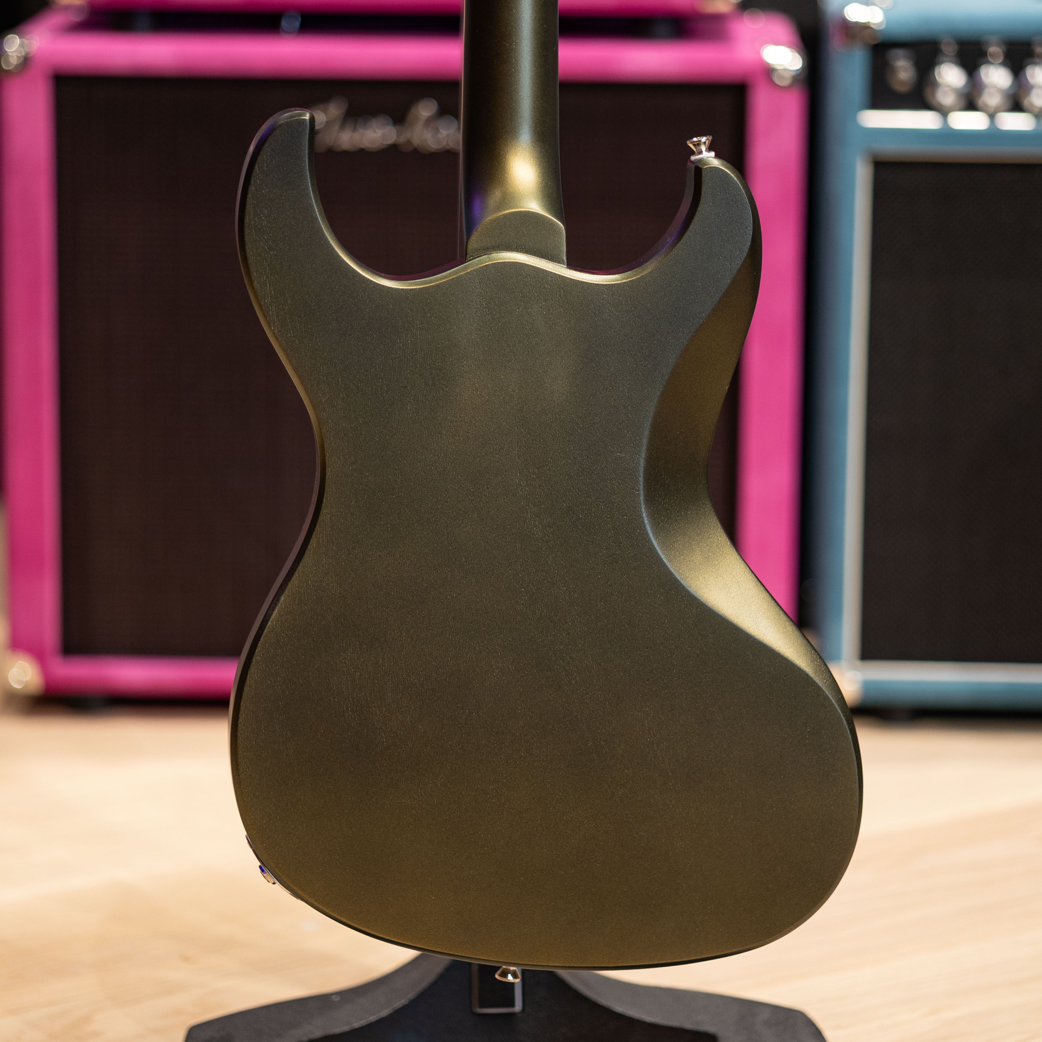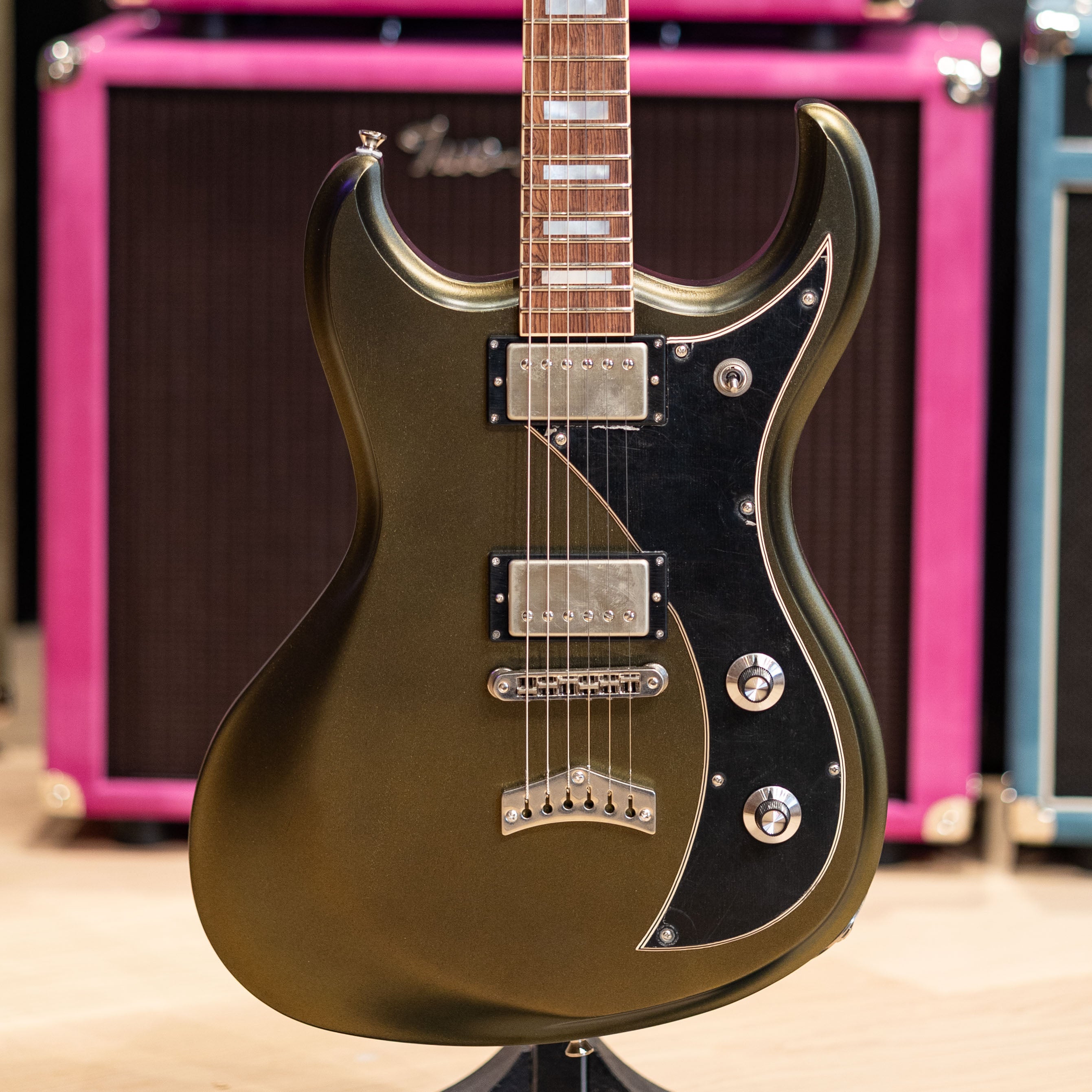 A pair of Grizzly pickups in raw nickel give this one its voice: clear, punchy, and confident under gain, with enough warmth to sit well in cleaner settings. Aged nickel hardware, a TOM/Kluson tailpiece, and Graph Tech Ratio tuners round out a setup that stays solid no matter how hard you push it.