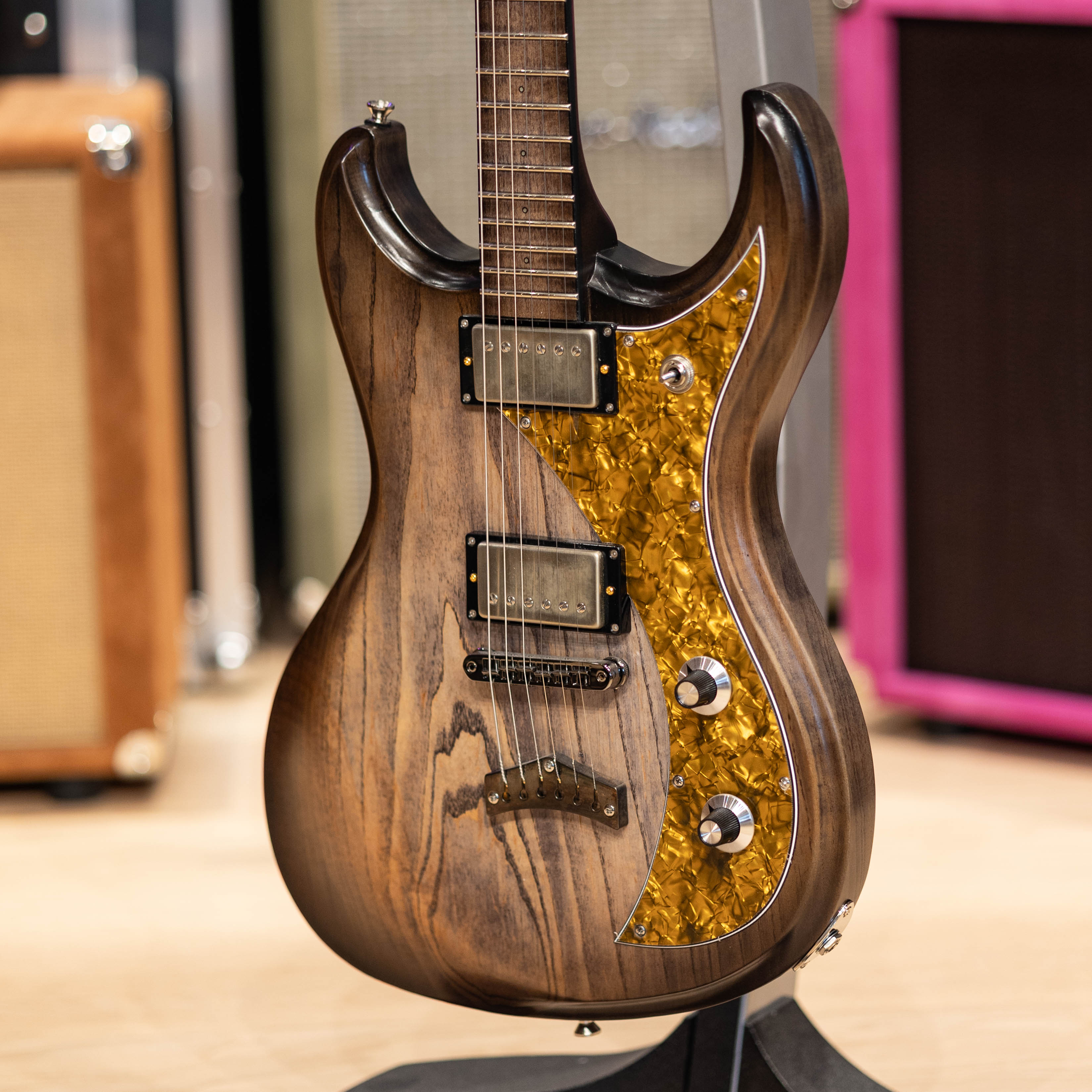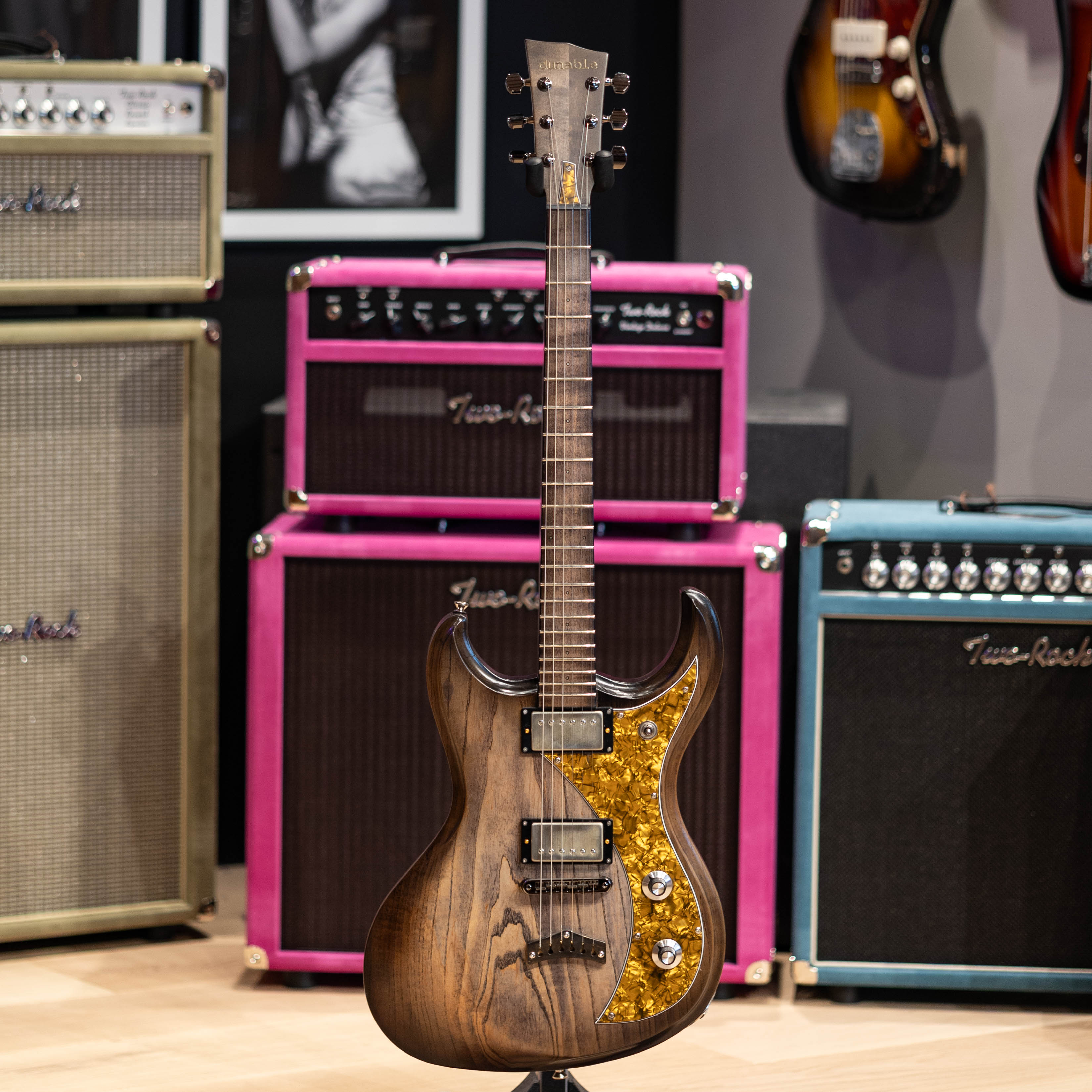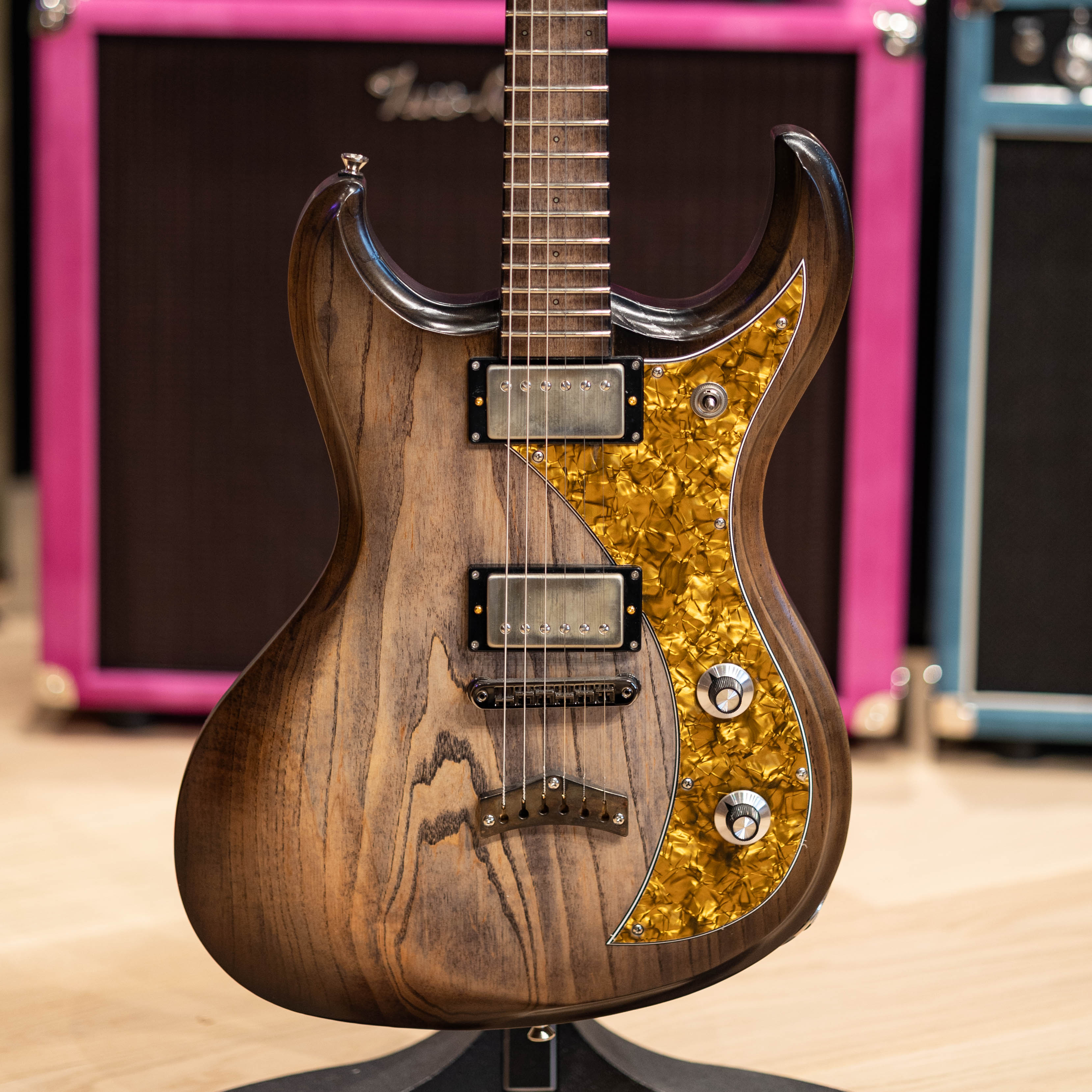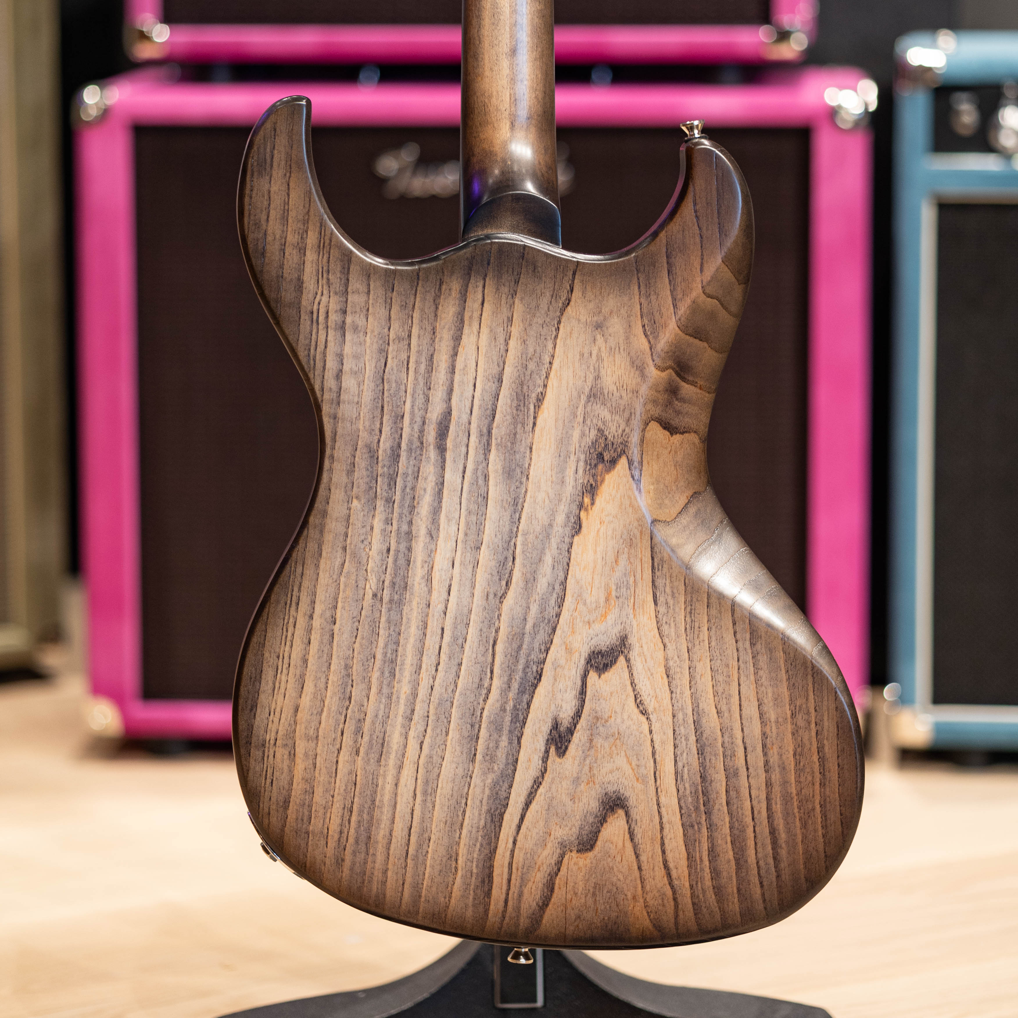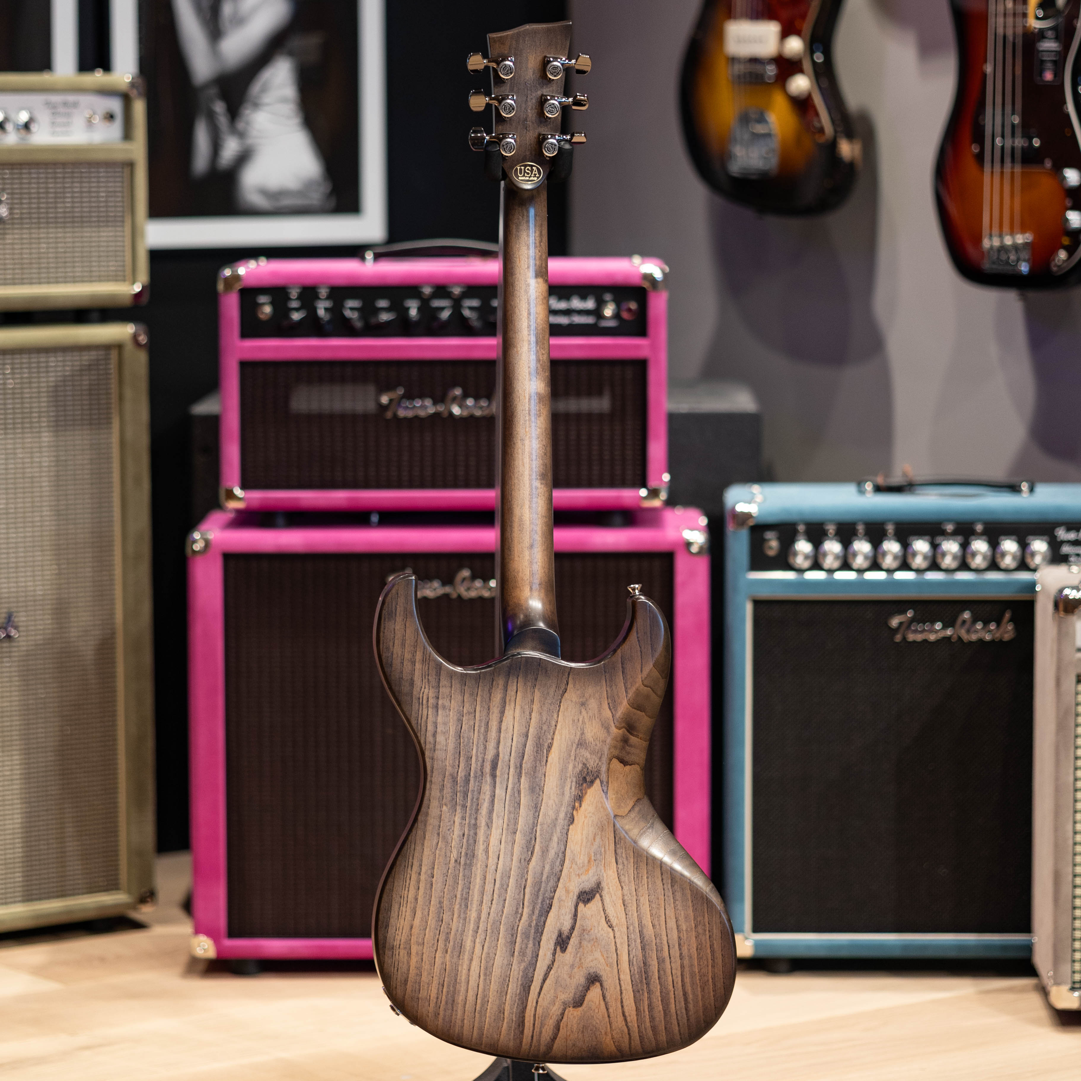 This Gnarwhal brings together Dunable’s angular design language with a finish that feels alive in the light. The swamp ash body wears an Amber Charcoal Burst that highlights the grain without overwhelming it, paired with a full maple neck and fingerboard for a bright, immediate response under the fingers. Black binding and luminlay inlays keep the look sharp and functional on dark stages.