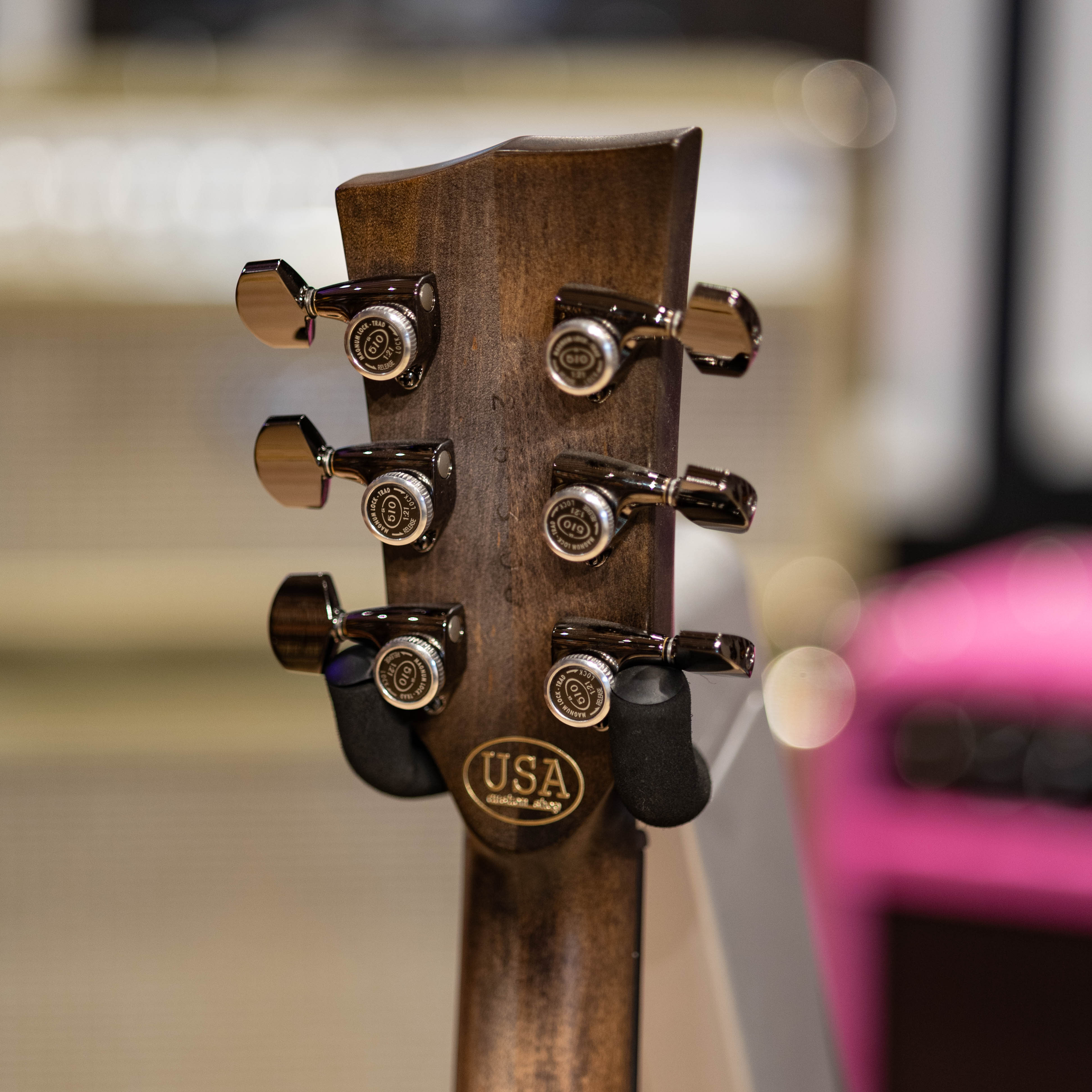 A pair of Grizzly pickups deliver the punch and clarity Dunable is known for, with enough midrange authority to cut through a mix while still staying articulate under gain. Black nickel hardware, Goth locking tuners, and a gold pearloid pickguard round out a build that balances attitude with reliability.