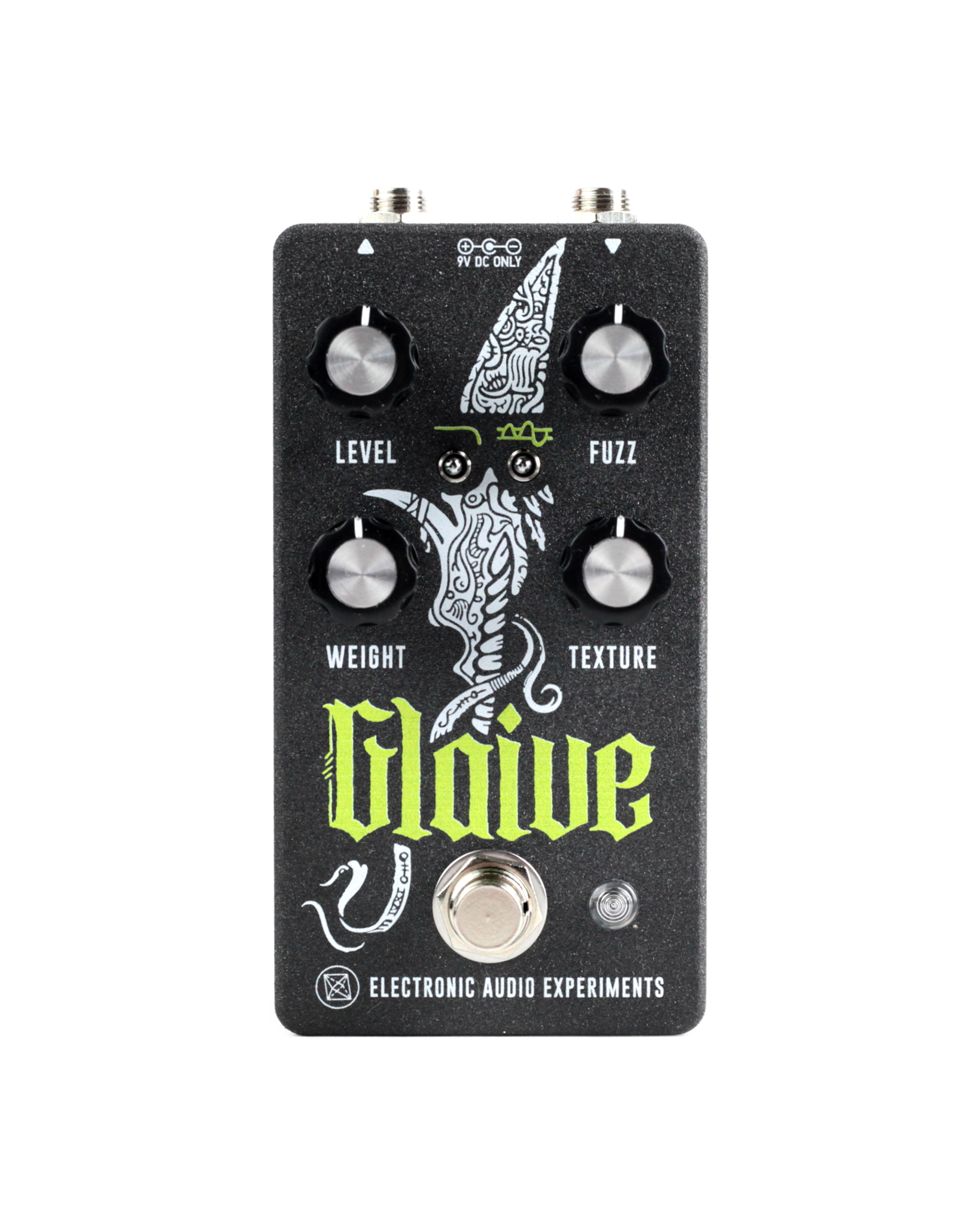 The Electronic Audio Experiments Glaive is the most dangerous gain device in the EAE lineup. This discordant yet deceptively versatile op amp fuzz is capable of over +80dB of gain. The Weight knob adjusts a lightly resonant high pass filter at the input, for tones ranging from tight, ripped- speaker grind to bass-rich sludge. Texture blends in a full-wave rectified analog signal, producing an octave up that gets fed into the fuzz input. Use it for subtle scrambling, or to generate piercing intermodulation products and sub-bass artifacts with a synthesizer-like attack. The LPF toggle can focus harsh overtones or unleash a full-spectrum cut through any mix. Finally, the Squelch toggle enables a brute-force, highly effective bias gate that can temper even the most fanatical gain levels and impart a crumbly, ripping quality to the note decay.