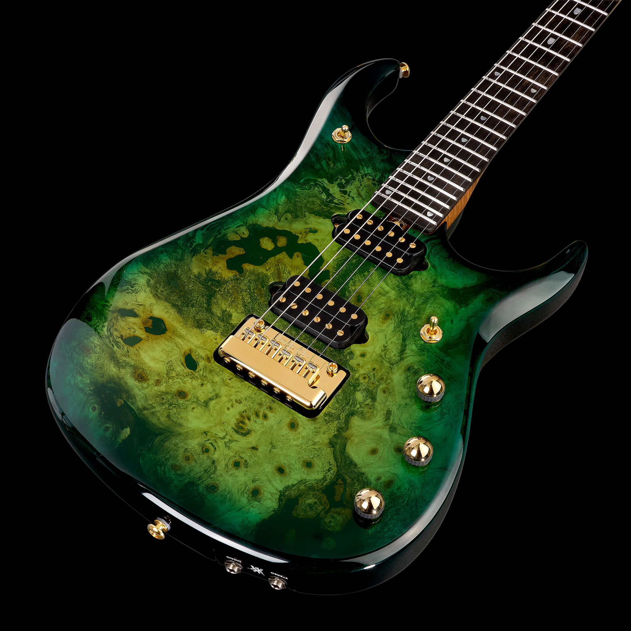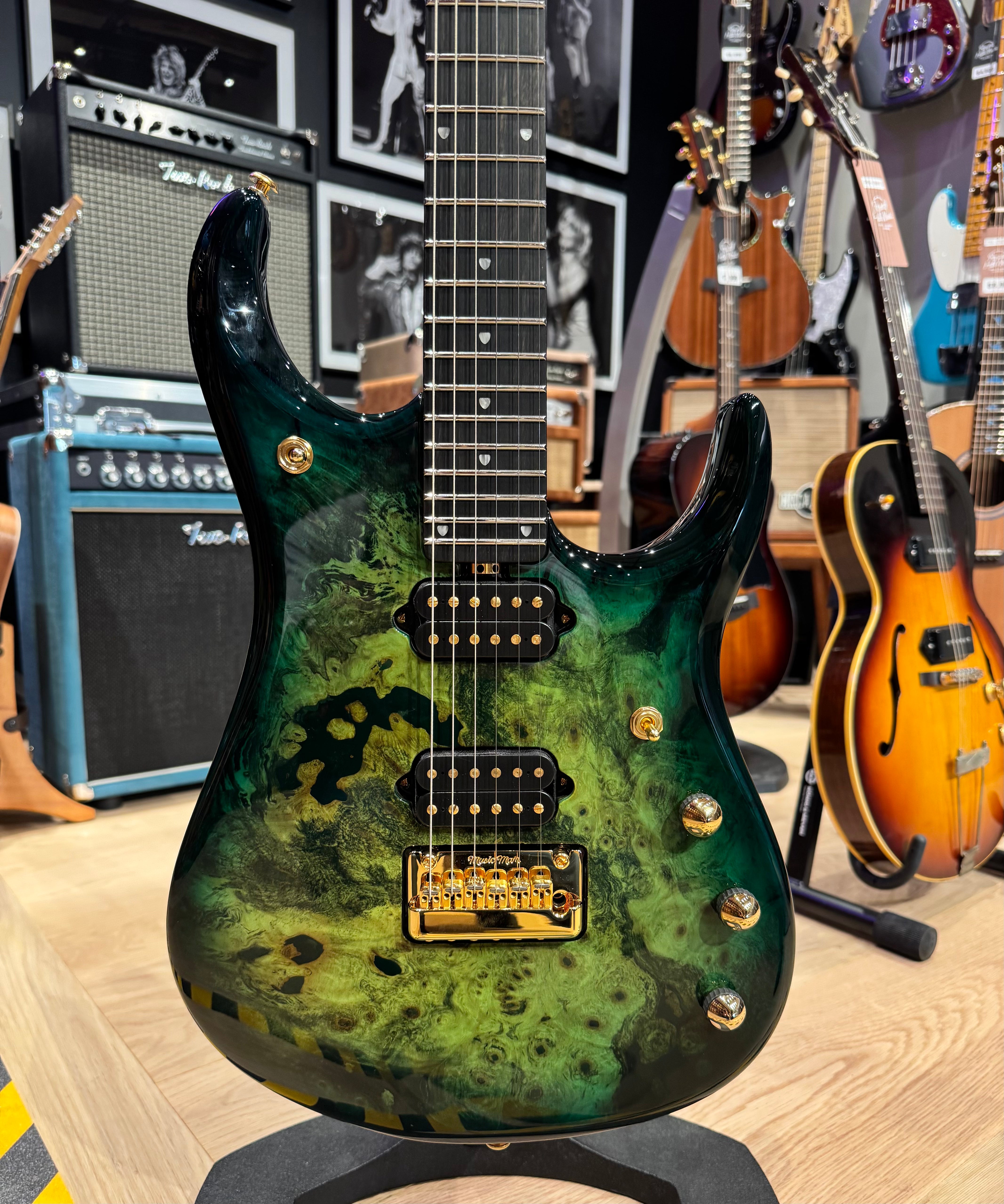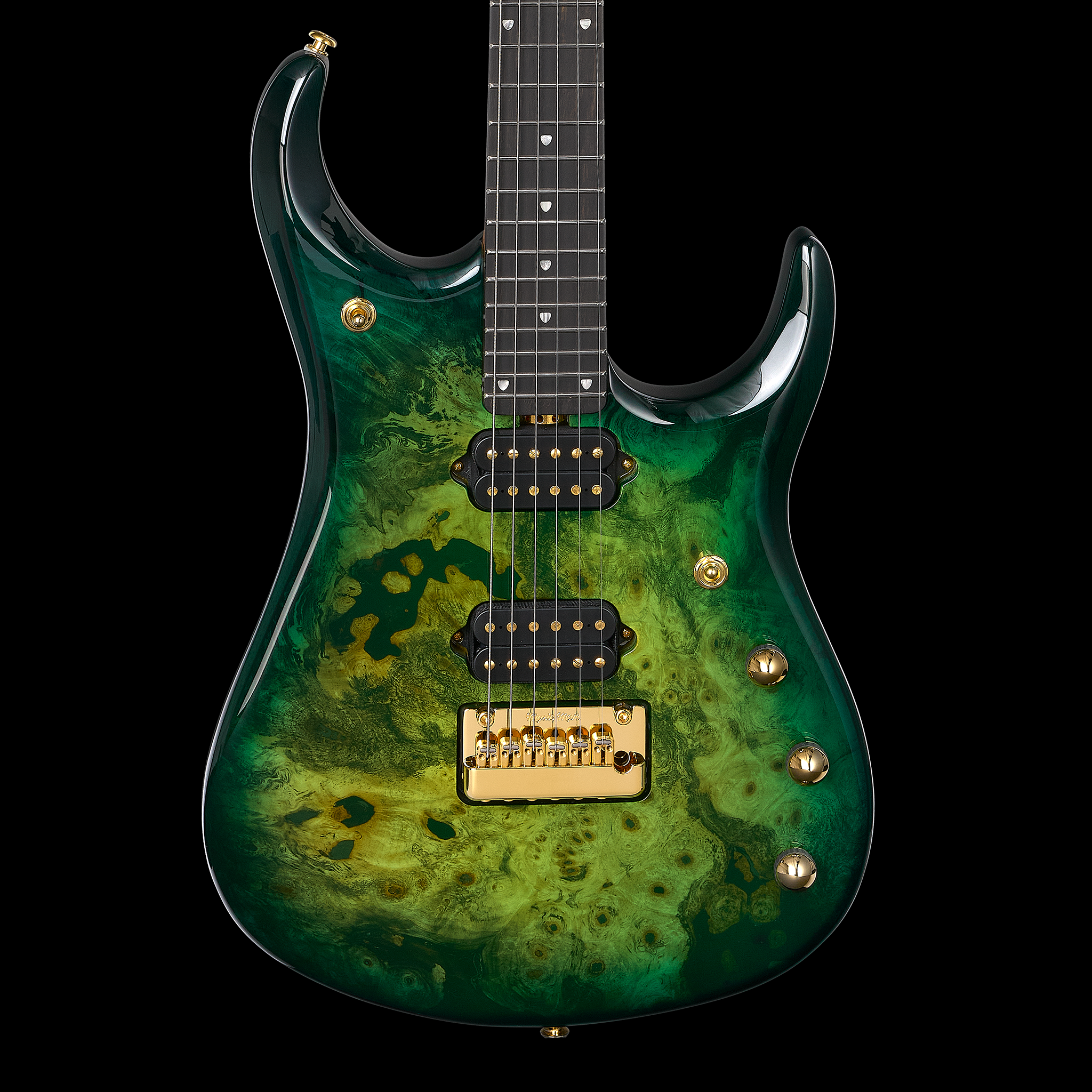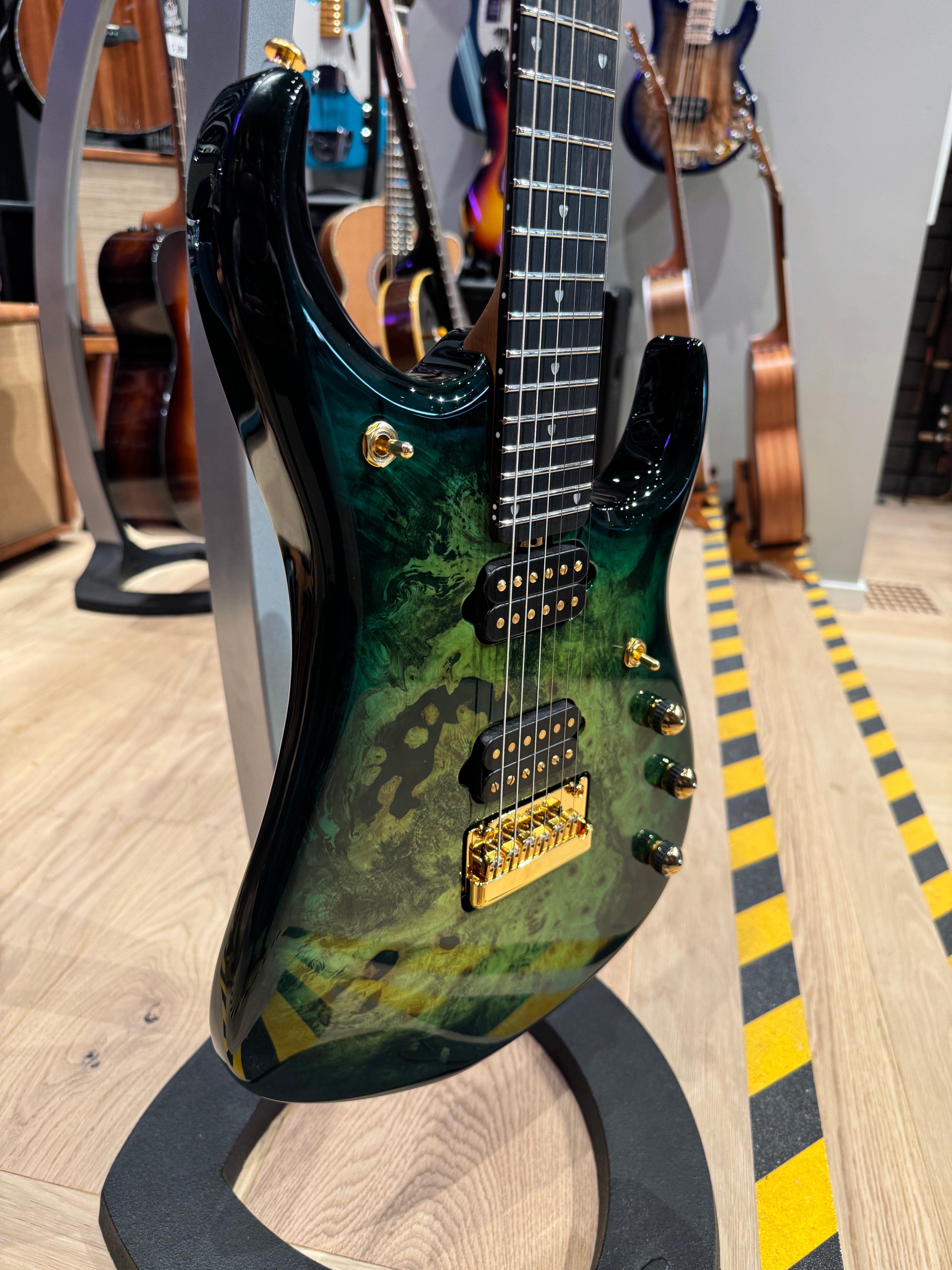 Body: Okoume with a figured maple top, finished in Toxic Sludge burst