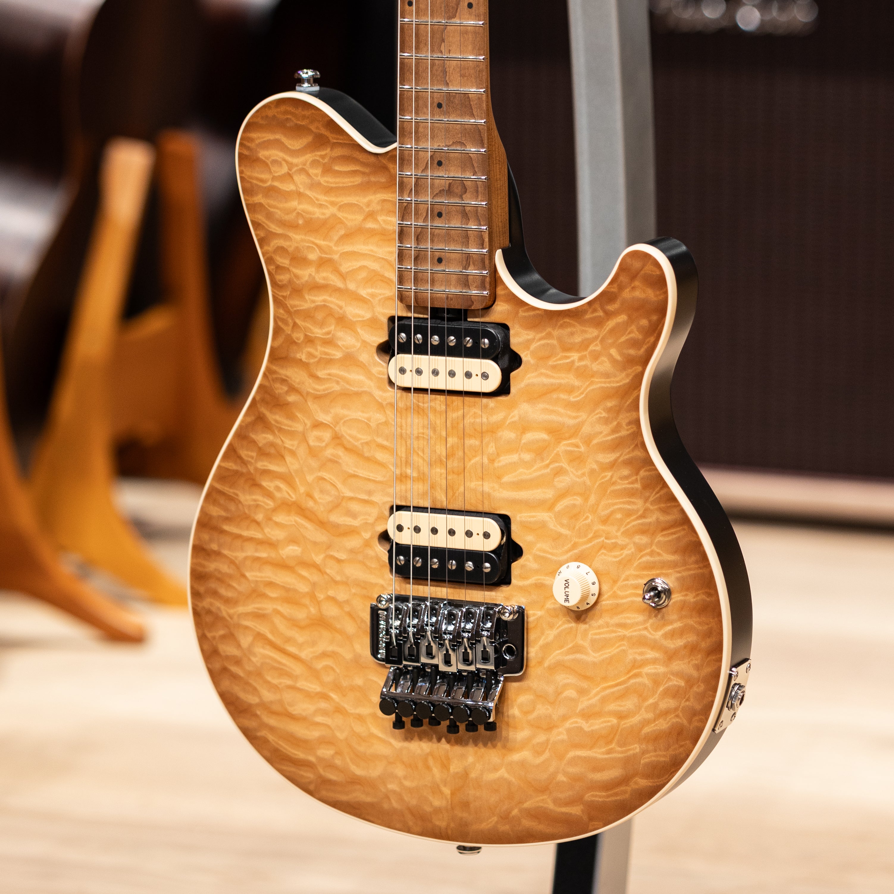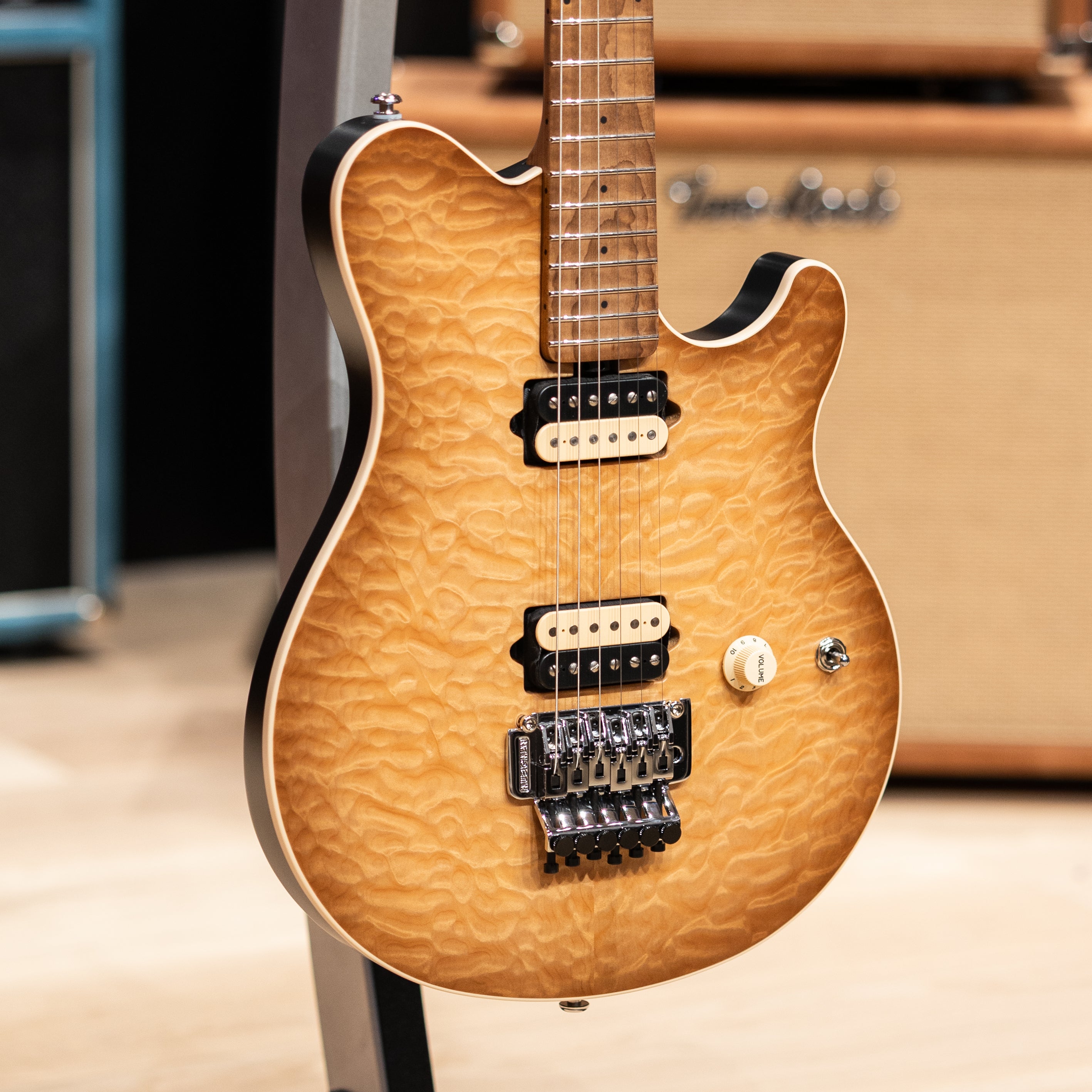 The Ernie Ball Music Man Axis pairs its striking quilted maple top with the fast, effortless feel players have loved for decades. A roasted, figured maple neck with 22 stainless steel frets delivers a smooth, stable playing experience, while the asymmetric neck carve naturally fits the hand for long sessions without fatigue.