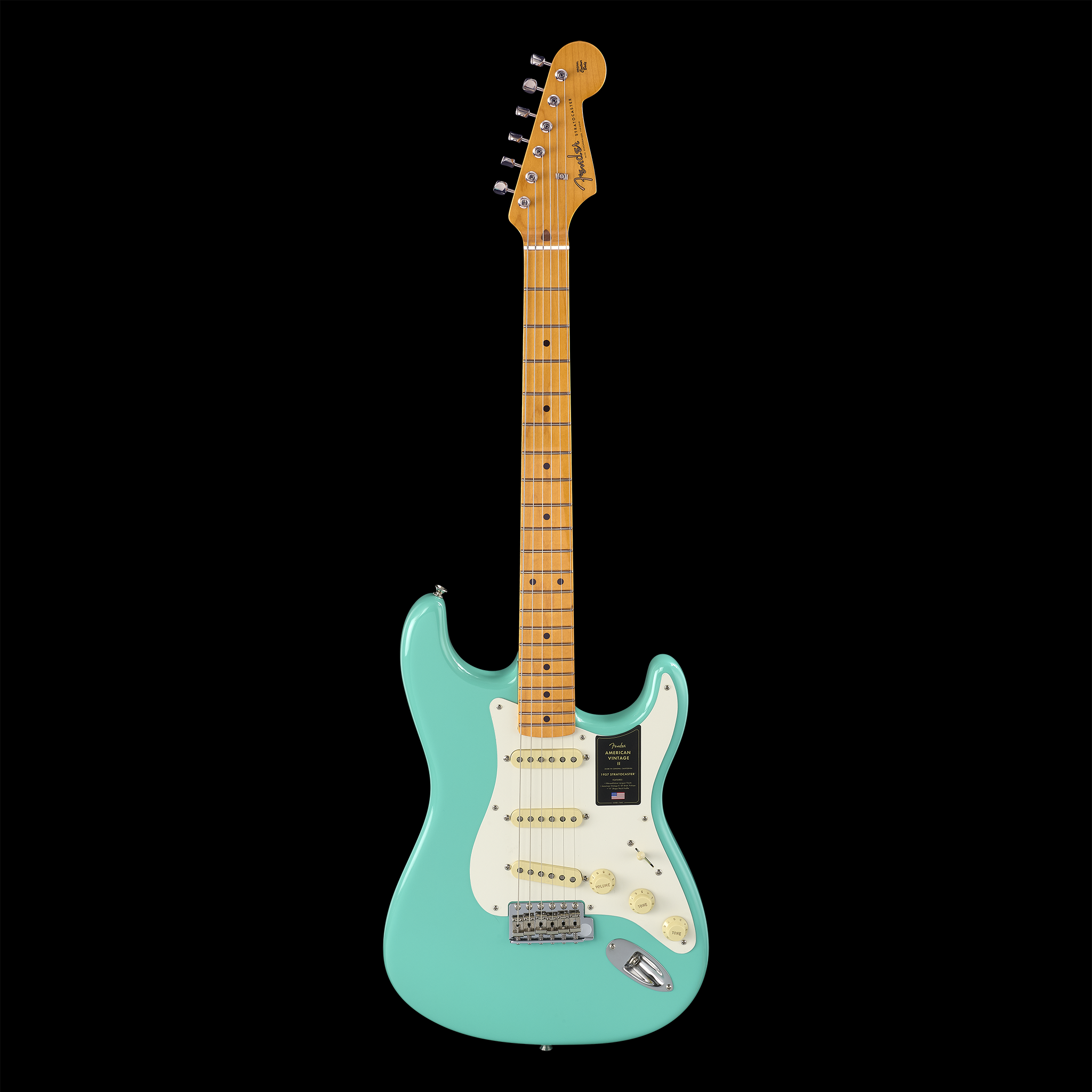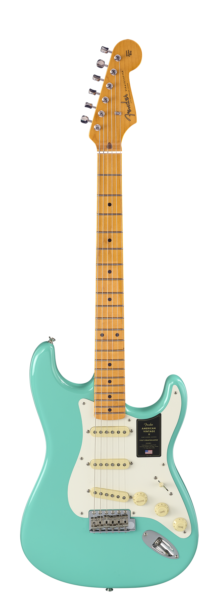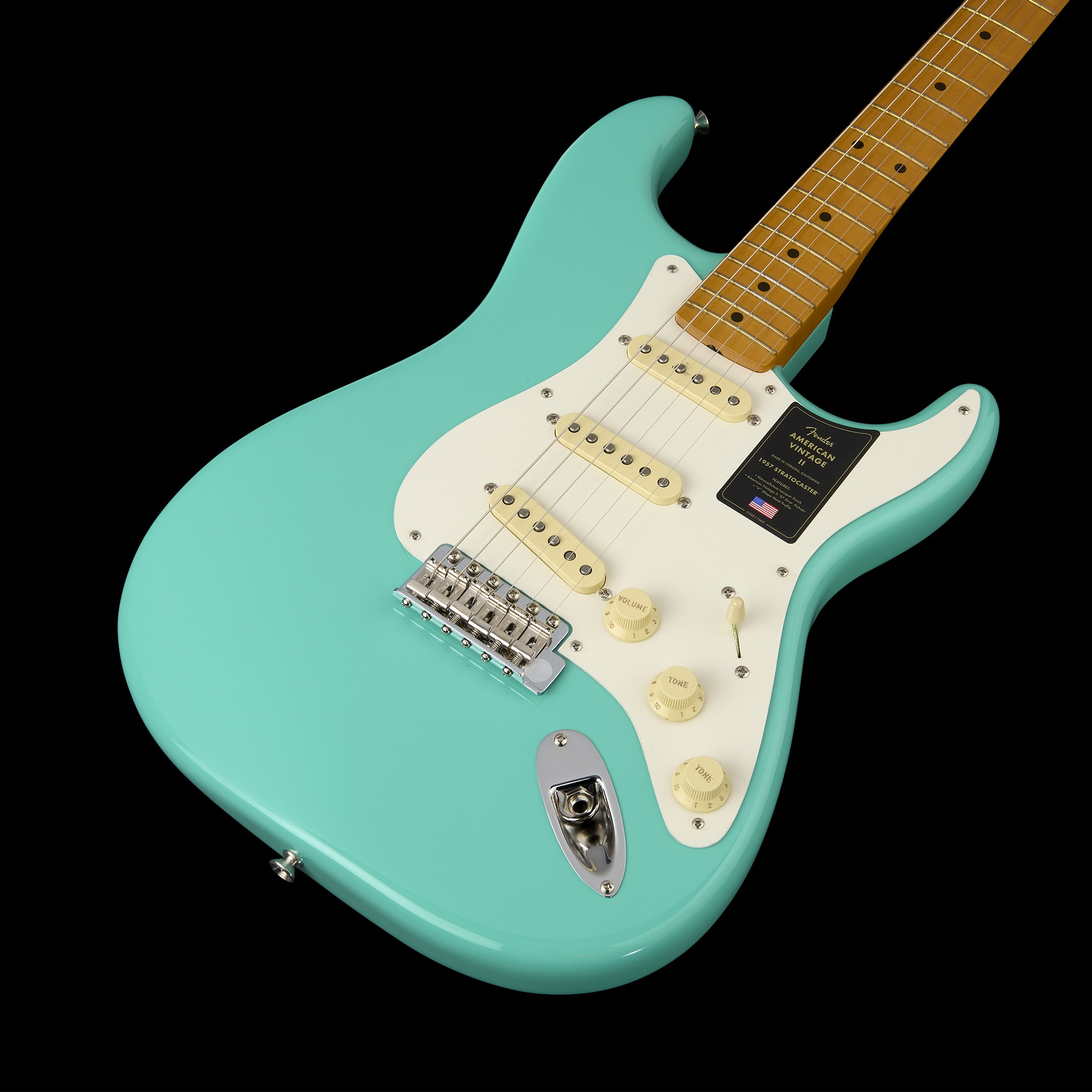 The American Vintage II 1957 Stratocaster® in Sea Foam Green captures the spirit of Fender's mid-century innovation with remarkable accuracy and craftsmanship. Its alder body, finished in gloss nitrocellulose lacquer, showcases sweeping contours that pair beautifully with a vintage-inspired "V"-shaped maple neck and 7.25" radius fingerboard for exceptional comfort and playability.