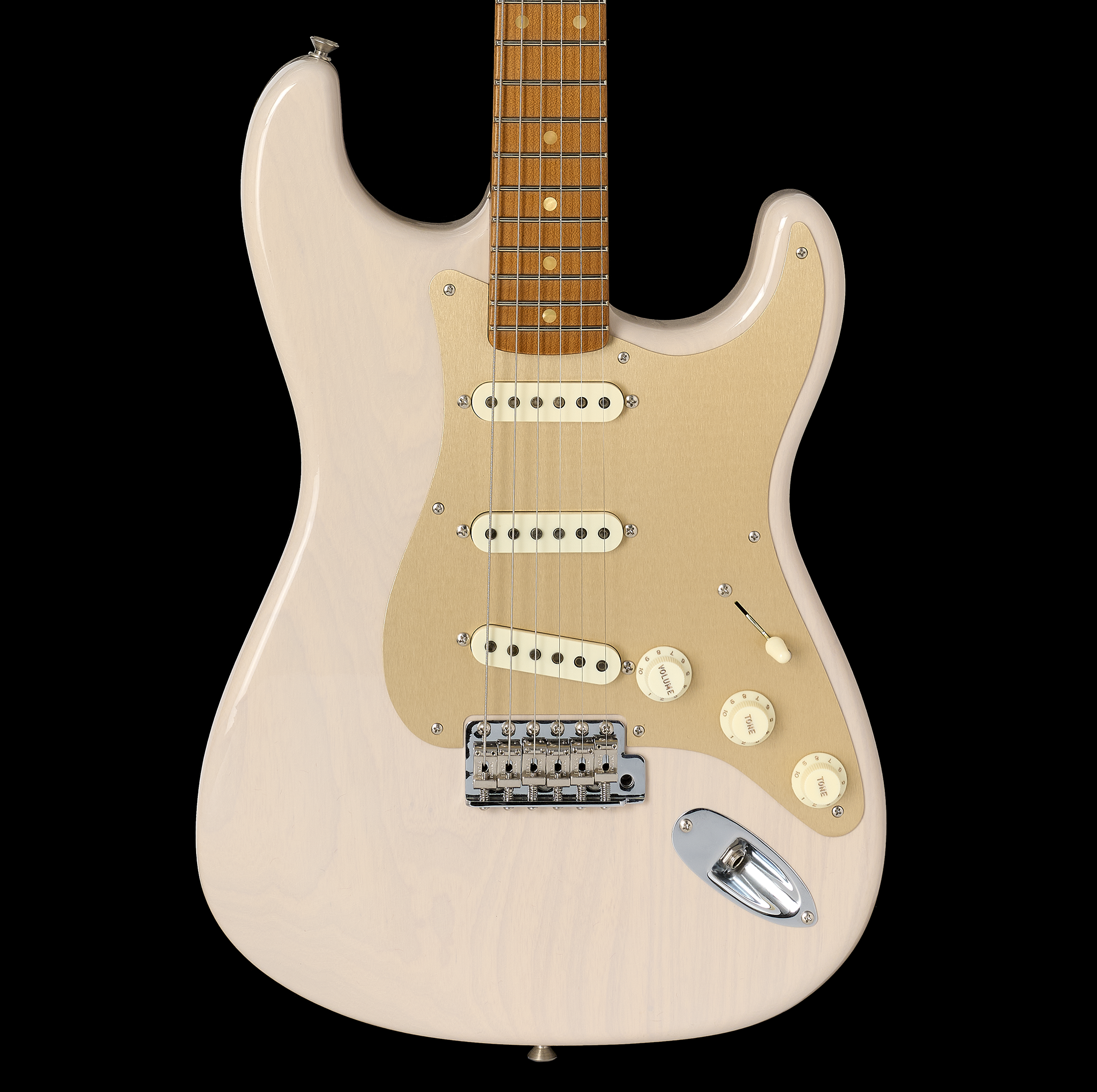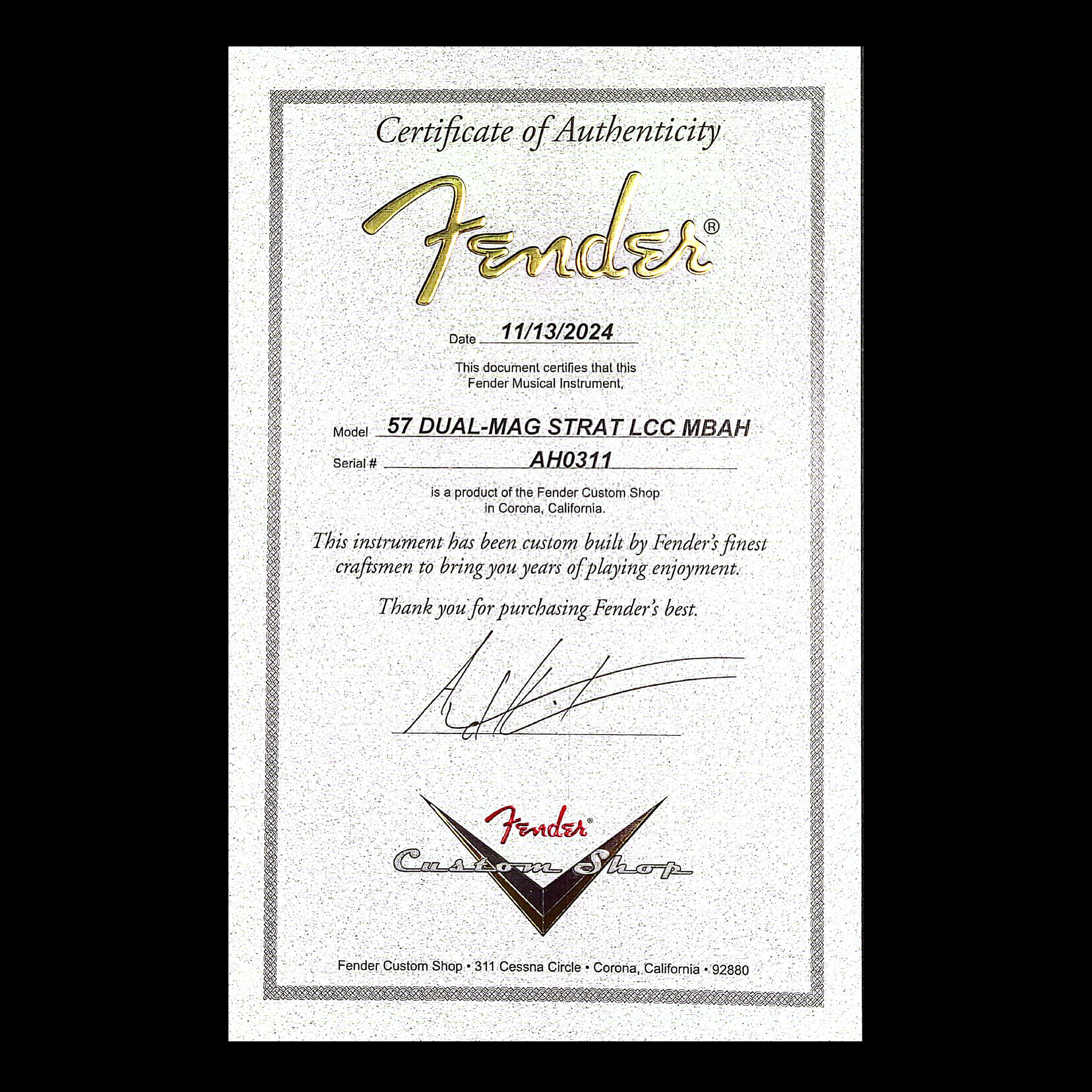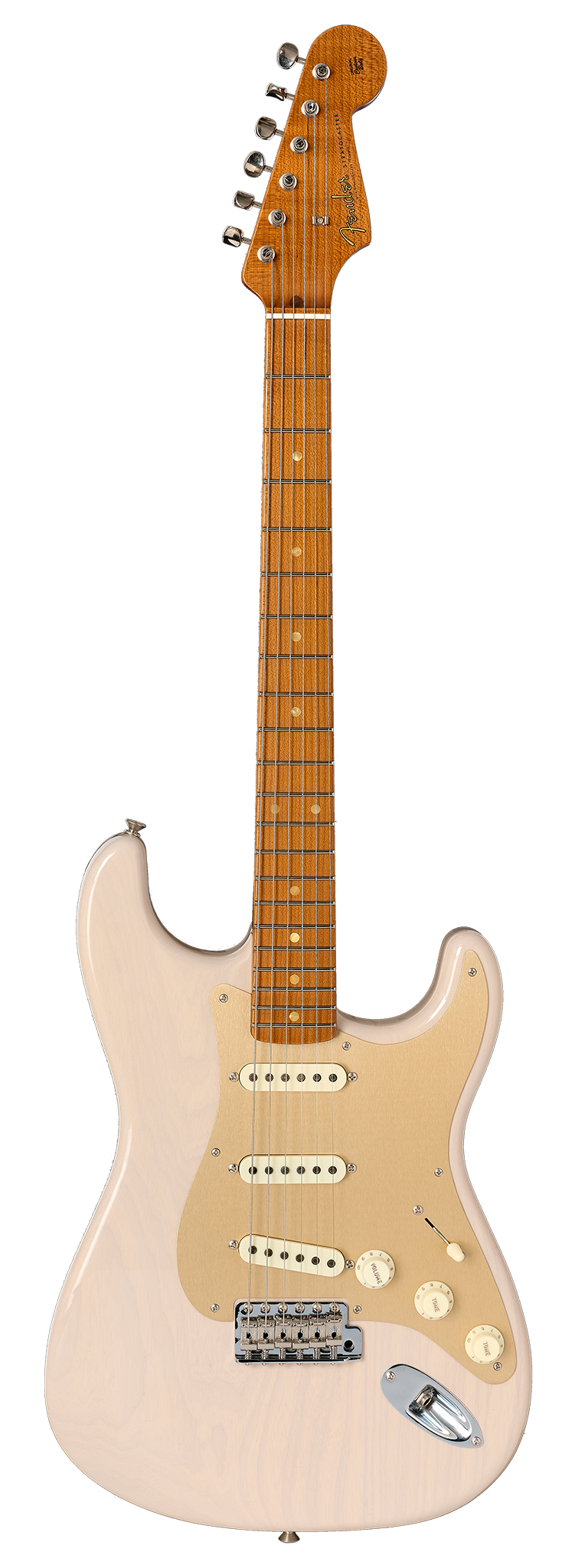 The Fender Custom Shop 1957 Stratocaster Relic – Masterbuilt by Andy Hicks in Dirty White Blonde is a stunning reimagining of a golden-era classic. Built from a carefully selected 2-piece ash body and finished in a tastefully aged lacquer, this Strat delivers timeless visual character and tonal resonance. Its hand-wound Dual Mag II pickups (with RWRP middle) offer a broad dynamic range—from glassy neck tones to throaty, articulate bridge punch—while the Fat '60s control layout and 5-way switch provide modern versatility with vintage soul. A roasted quartersawn maple neck with a soft '57-style V profile, 9.5" radius, and 6105 frets ensures rock-solid stability and smooth playability for both vintage purists and contemporary players.