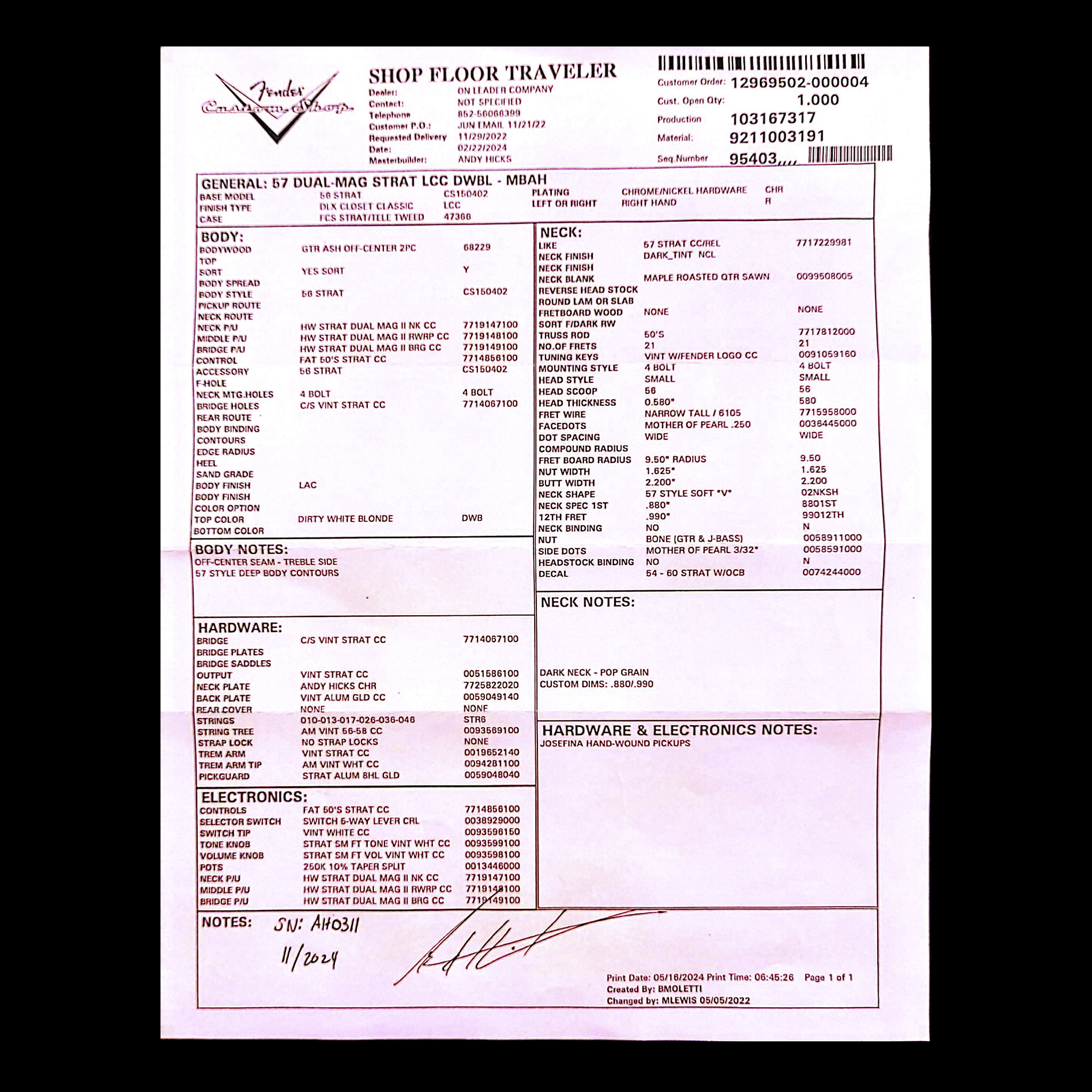 Masterbuilder Andy Hicks brings a unique blend of technical mastery and musician’s insight to every instrument he creates. From early modding experiments to advanced luthiery training at the Guitar Craft Academy, Hicks' path to the Fender Custom Shop has been guided by passion and precision. His time with Gretsch Master Builder Steve Stern, including work on the Malcolm Young “Salute” Jet, and his leadership at boutique brands like James Tyler Guitars, have all contributed to his detail-oriented approach. This Stratocaster reflects his belief that great guitars come from true collaboration with players—an heirloom-quality instrument built to inspire.