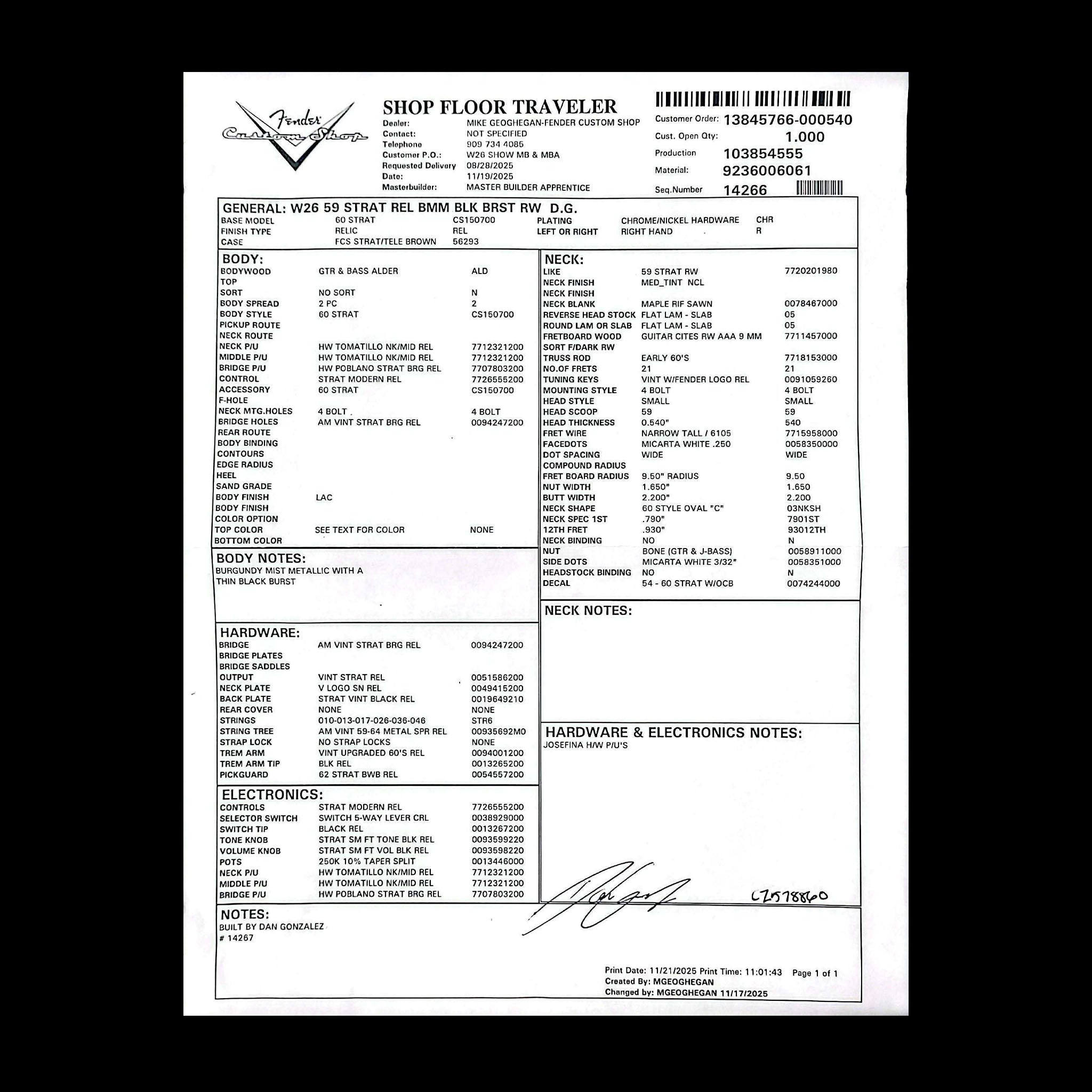 This exceptional Stratocaster was acquired by Round Hill Music Co at the NAMM 2026 Fender Custom Shop VIP event. A true one-of-a-kind creation, it was masterfully built by apprentice luthier Dan Gonzales and finished in a striking Burgundy Mist Metallic Black Burst.