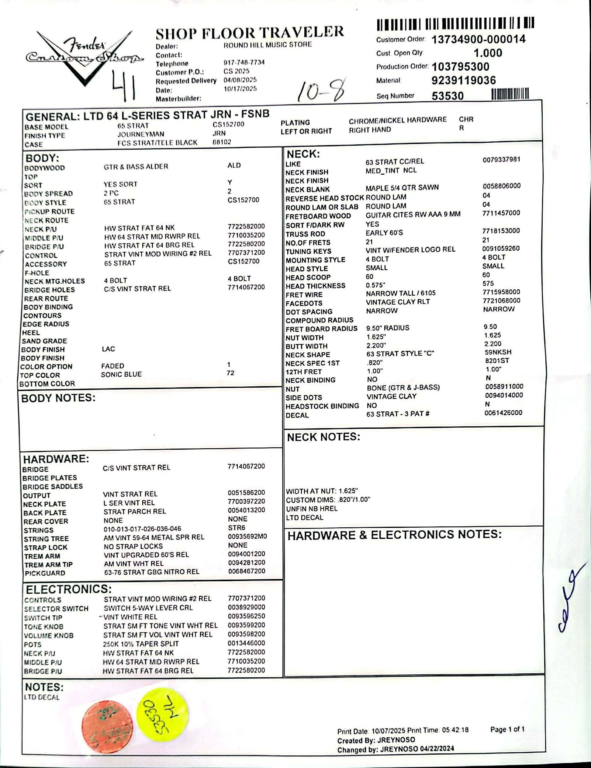 This Limited Edition 1964 L-Series Stratocaster blends vintage feel with refined detail. The body is lightweight alder, sorted for resonance and finished in lacquer with a soft Faded Sonic Blue that wears naturally without looking forced.