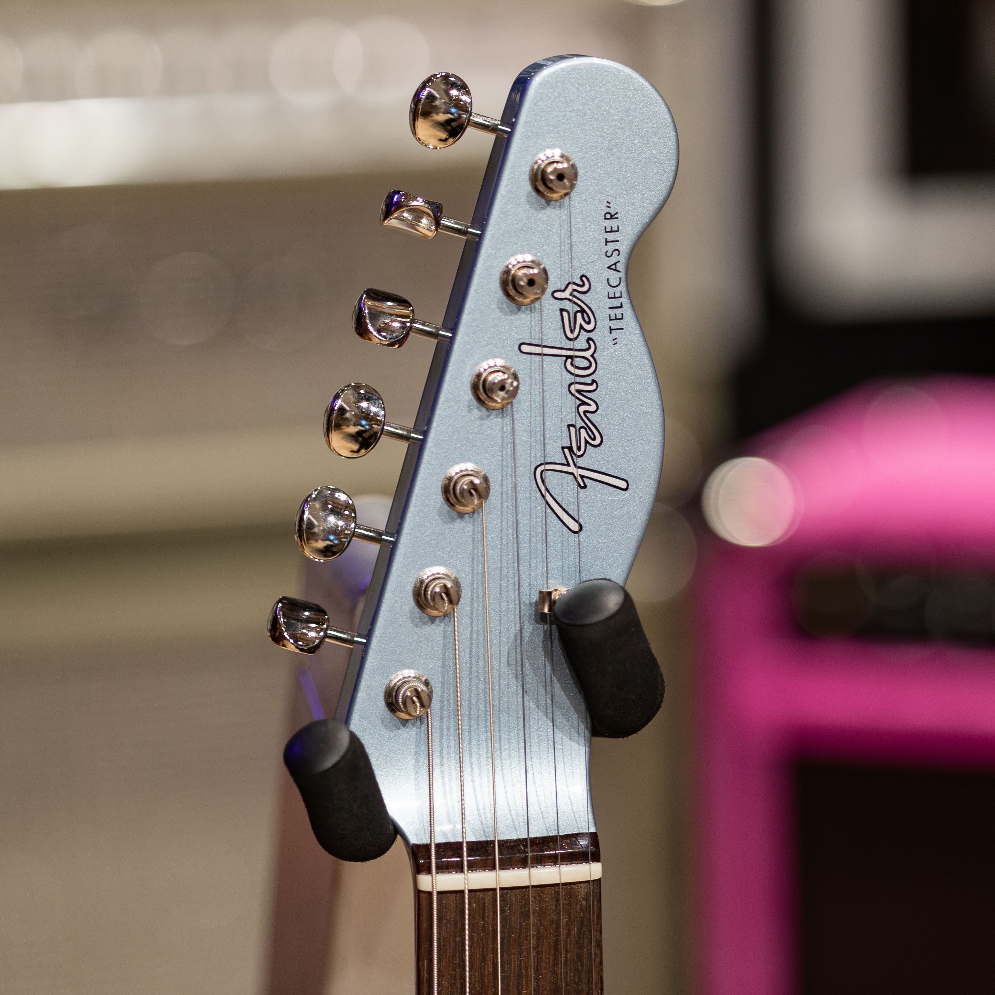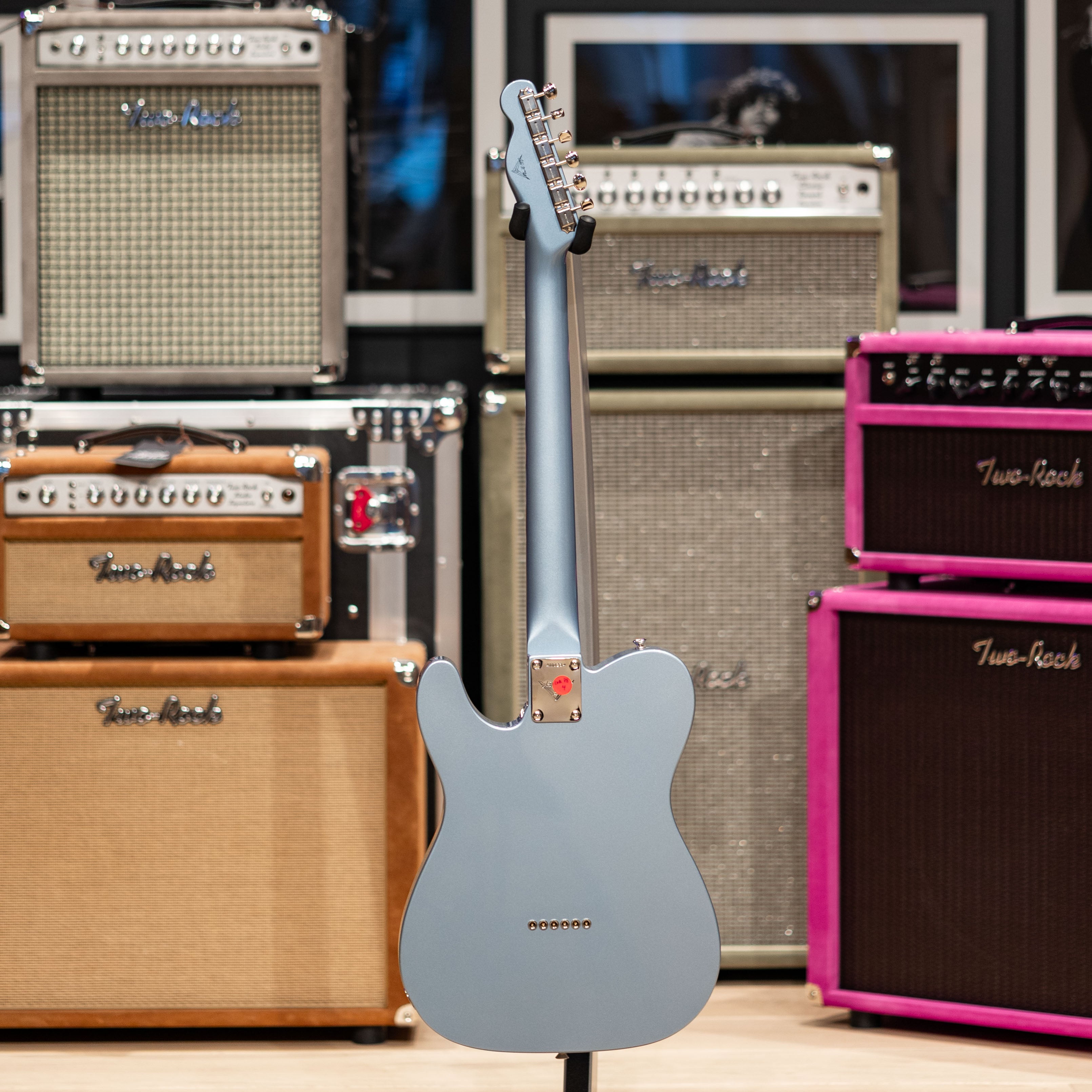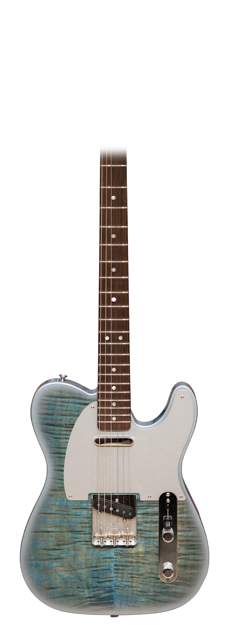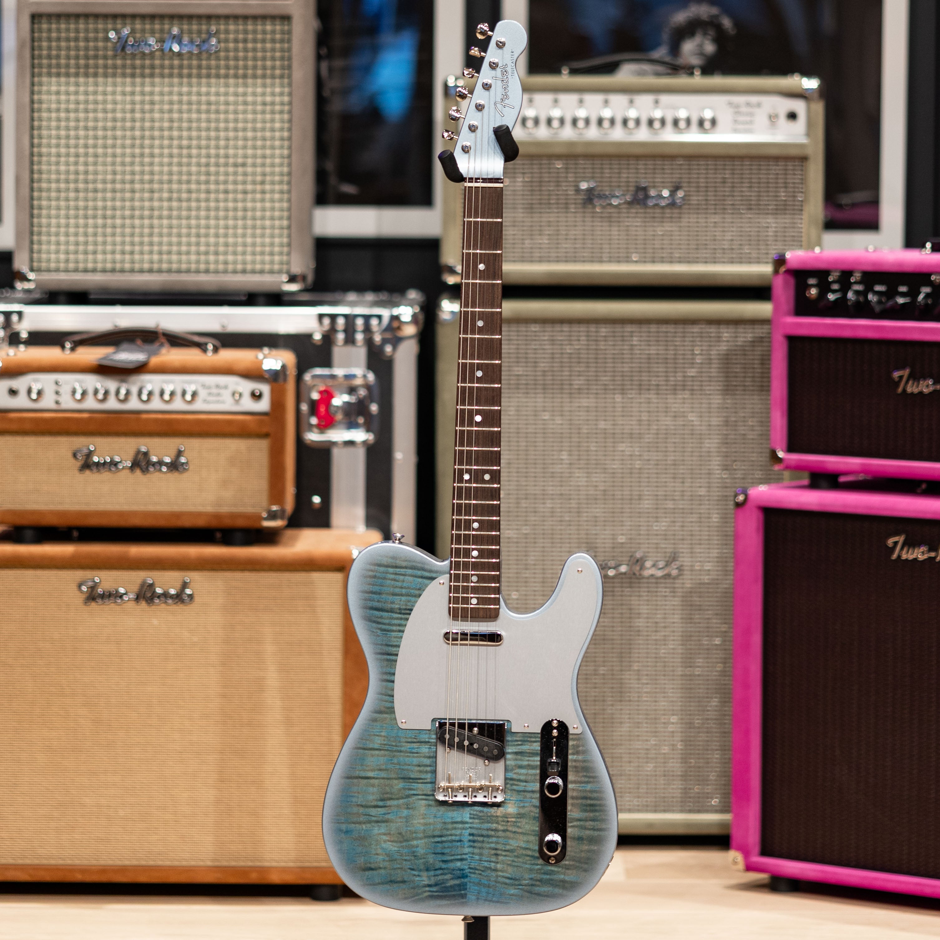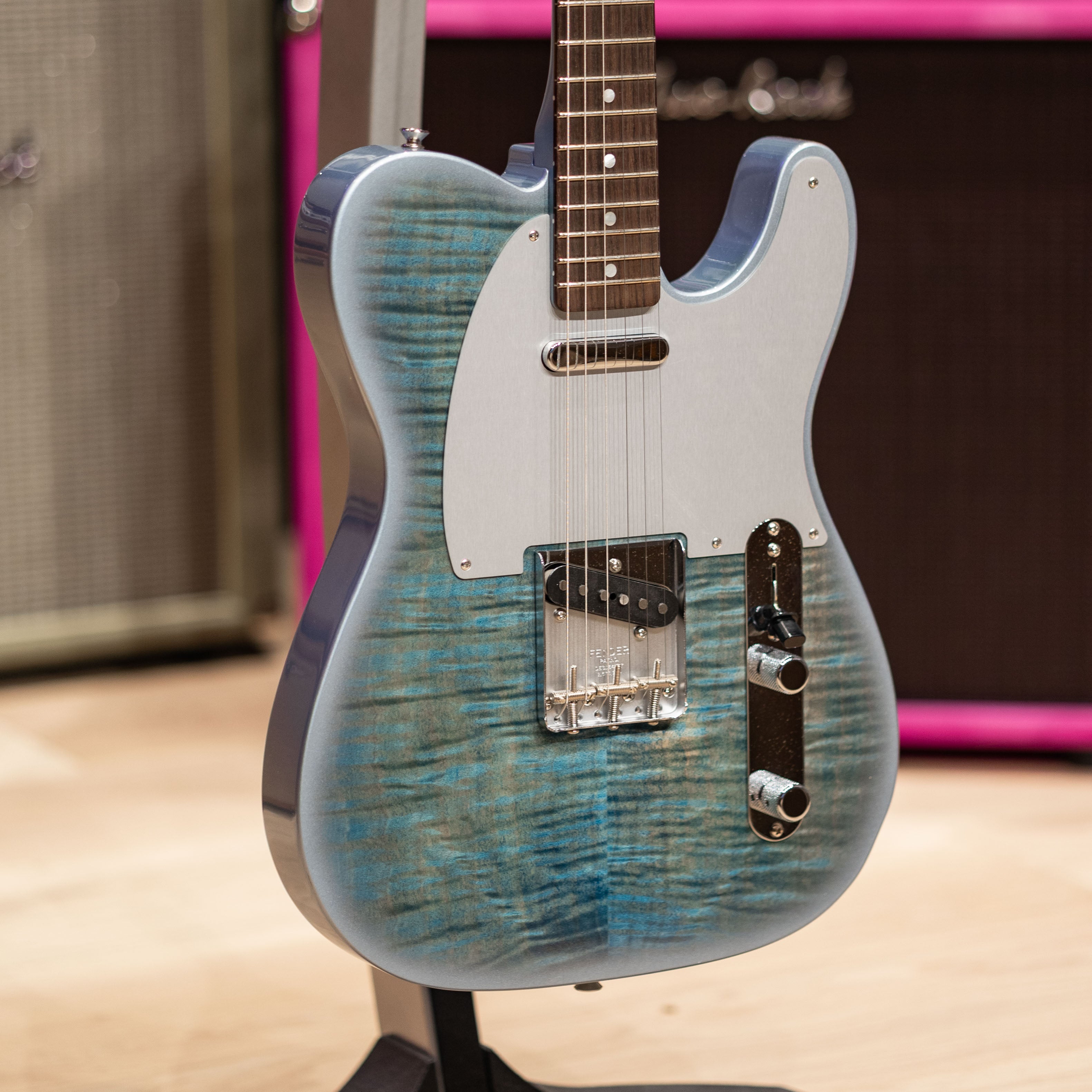 There is something special about a Tele that carries both elegance and attitude, and this Masterbuilt 60s Telecaster from Austin MacNutt captures that balance beautifully. The 5A flame maple top is finished in a Blue Stain treatment with an Ice Blue Metallic Burst, creating a deep and shifting look that feels alive every time the light moves across it. Paired with an alder body and a thin lacquer finish, the guitar has an open and expressive voice that brings out the best qualities of early 60s Fender instruments.