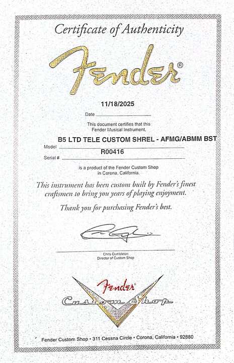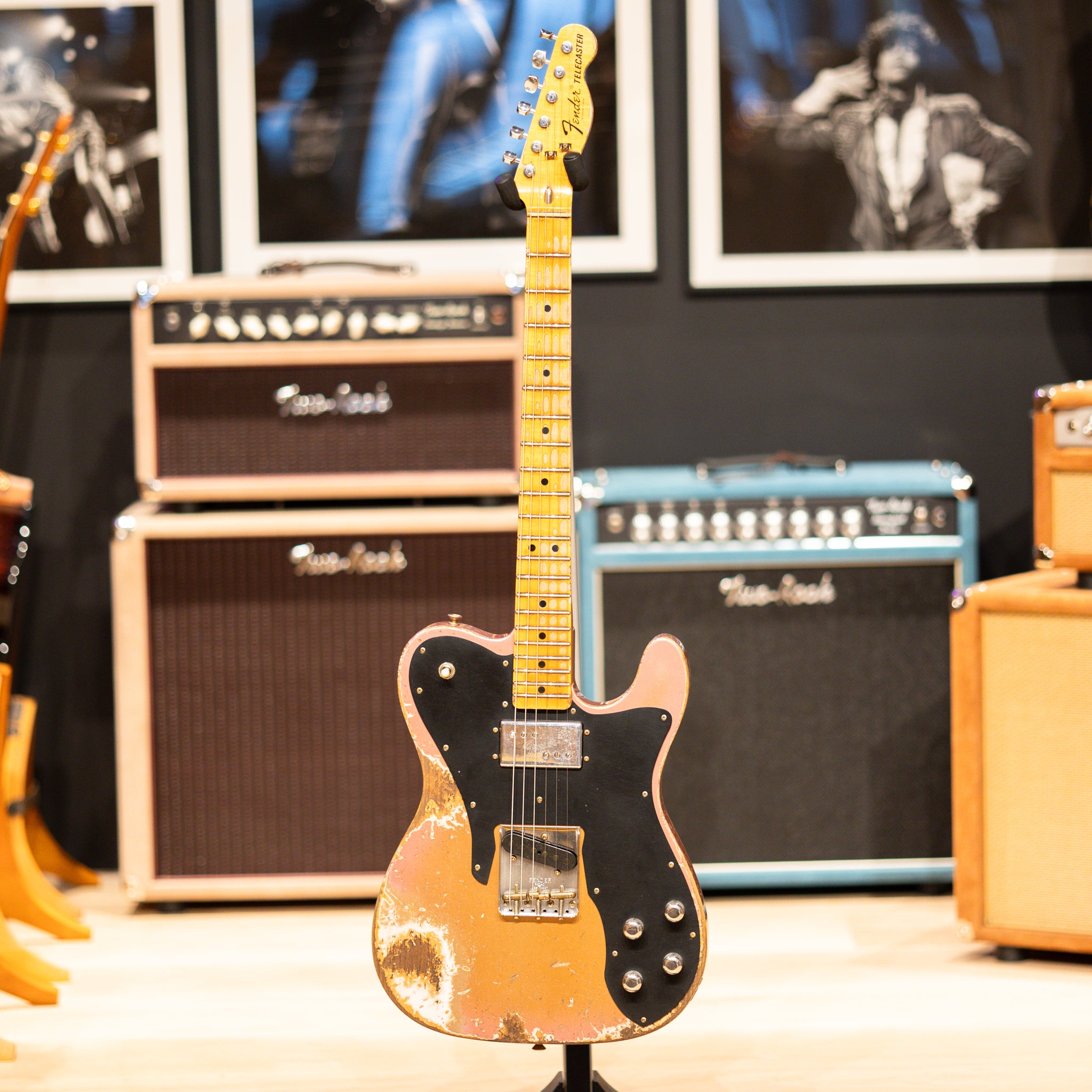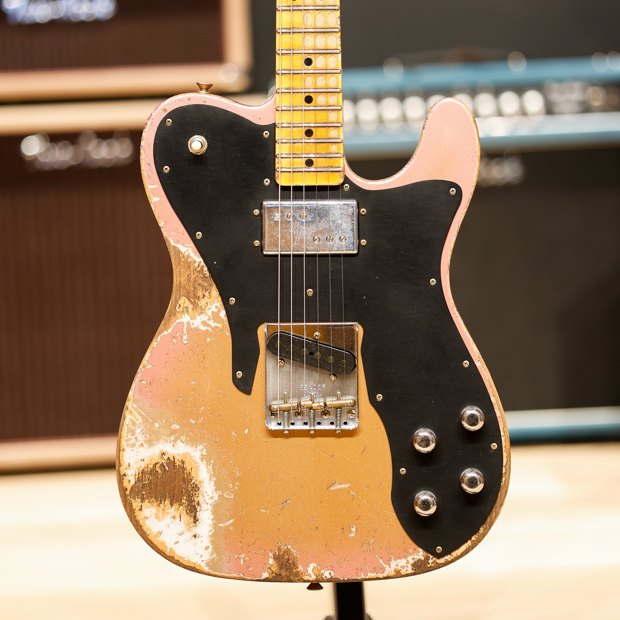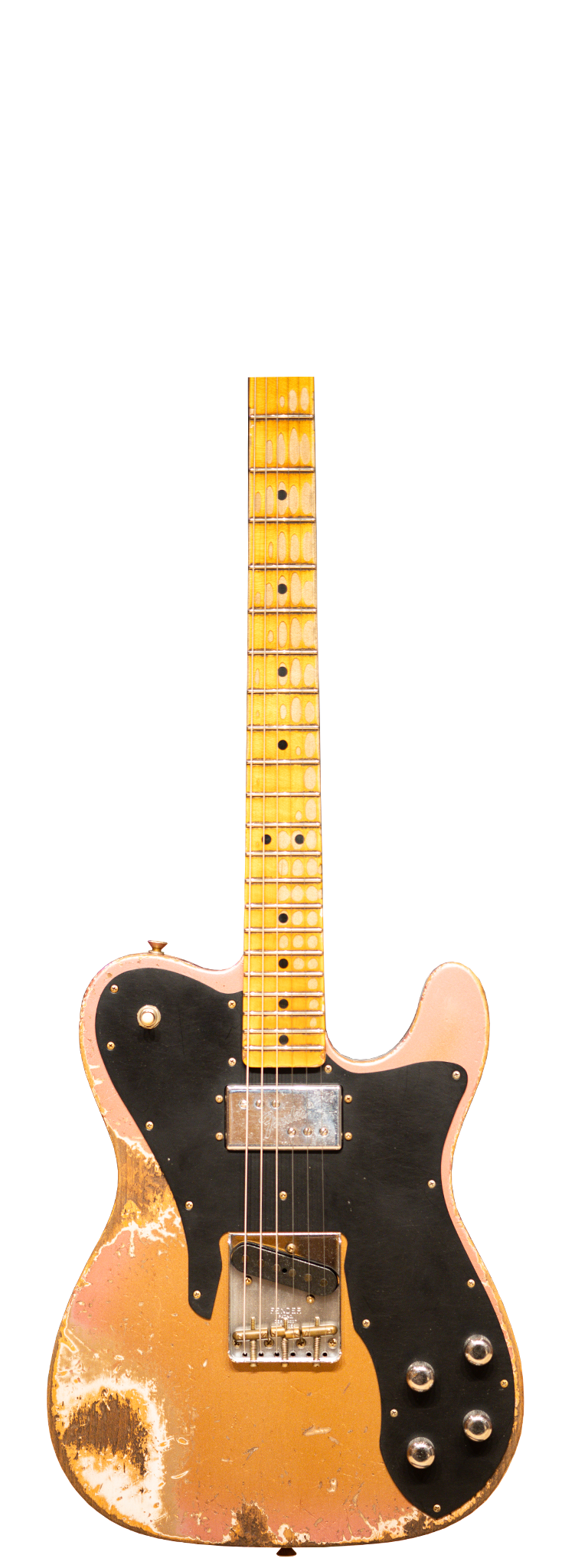 This Telecaster is a bold blend of vintage spirit and modern craftsmanship, finished in Firemist Gold over Burgundy Mist Metallic. The relic work is extensive and deeply convincing, the kind of wear that takes master builders countless hours to achieve. Every scuff, worn edge, and faded burst feels natural, as if the guitar has lived decades of stages and studios before finding its way to you.
