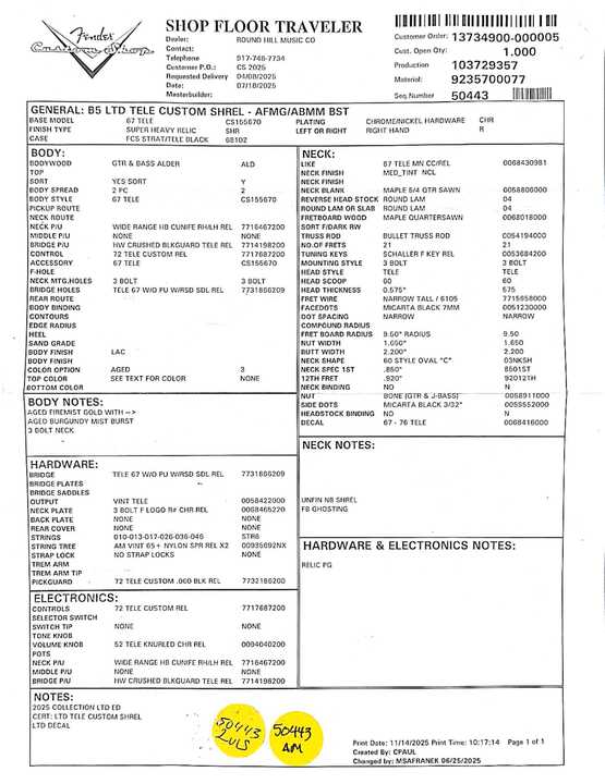 Neck shape: 1960s Oval “C” (.850 in at 1st fret, .920 in at 12th fret)