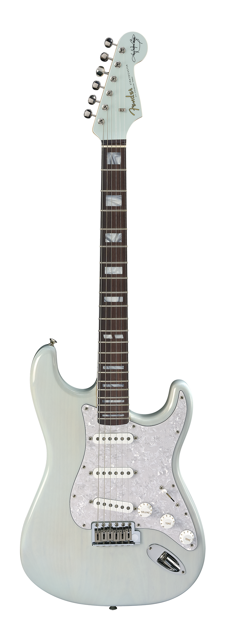 The Kenny Wayne Shepherd Stratocaster® in Transparent Faded Sonic Blue blends vintage inspiration with modern upgrades to capture the soulful blues-rock tone of Kenny Wayne Shepherd. Its chambered ash body delivers resonant and vibrant sound, complemented by a striking lacquer finish that showcases the ash wood grain and features a matching painted headcap.