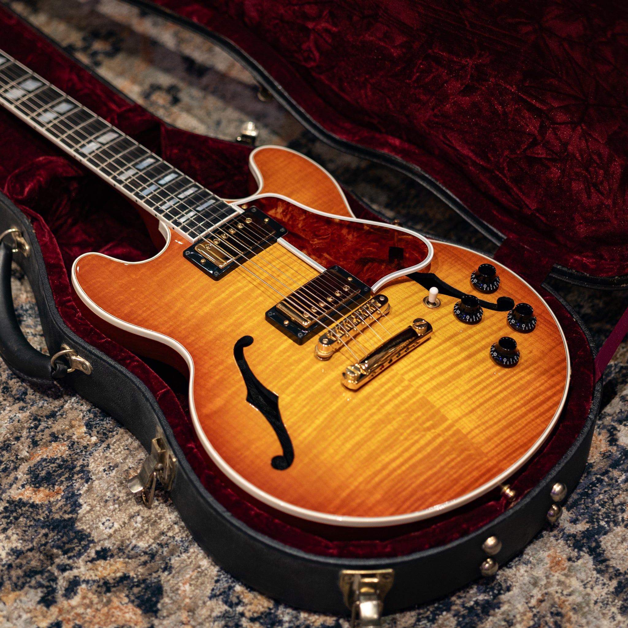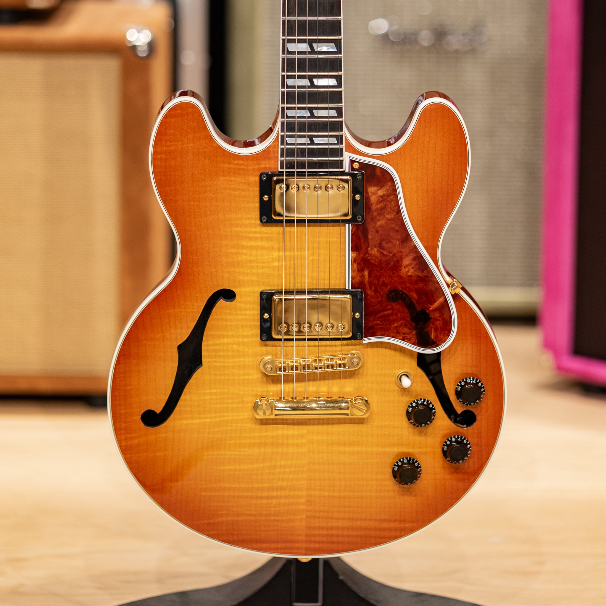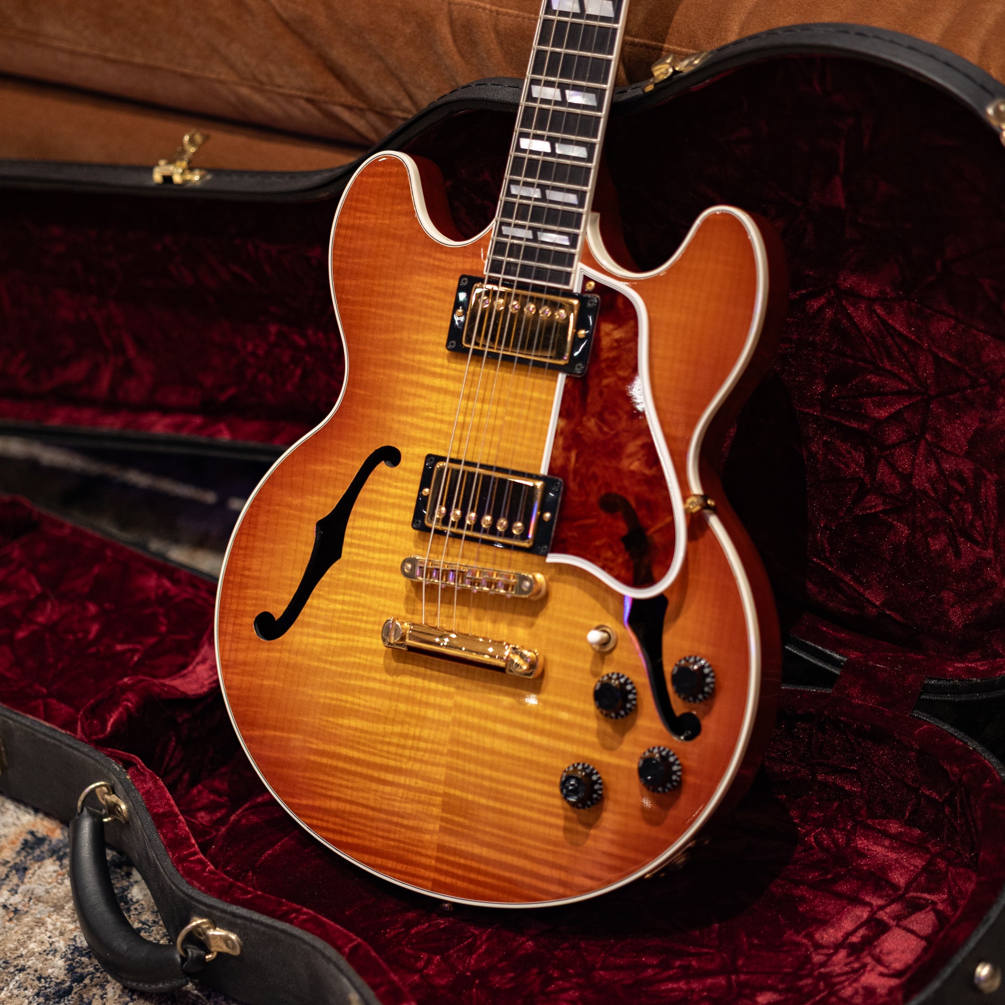 This Paul Jackson Jr. signature model is in exceptionally clean condition, featuring a truly outstanding figured maple top that sets this example apart. The flame and depth in the top are striking in any light and give the guitar a high-end, boutique presence. This semi-hollow beauty delivers the warm, articulate tone the ES-346 is known for, with excellent resonance and clarity thanks to its carved maple top and mahogany back construction. Equipped with ’57 Classic humbuckers, gold hardware, an ebony fingerboard, and premium Custom Shop appointments throughout, it’s a versatile instrument equally at home in jazz, R&B, pop, blues, or fusion settings.
