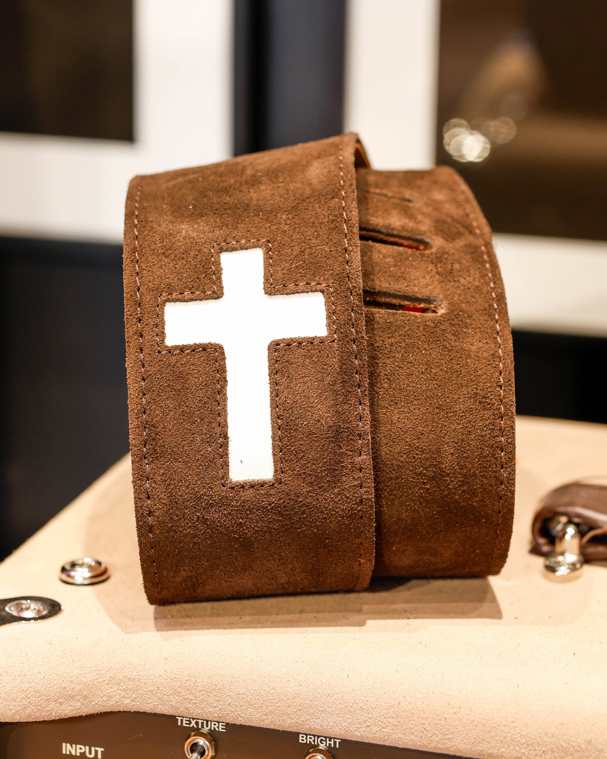 Elevate your playing experience with this Henry Heller 2.5-inch wide garment leather guitar strap, designed for both comfort and stage presence. Featuring a bold cross cut-out pattern and a premium suede backing, this strap delivers durability, stability, and visual impact. Its wider profile offers excellent weight distribution, making it perfect for extended sessions with electric, acoustic, or bass guitars. Fully adjustable up to 58 inches in length, this strap combines functionality, comfort, and striking design—an ideal choice for musicians who want dependable performance with standout style.