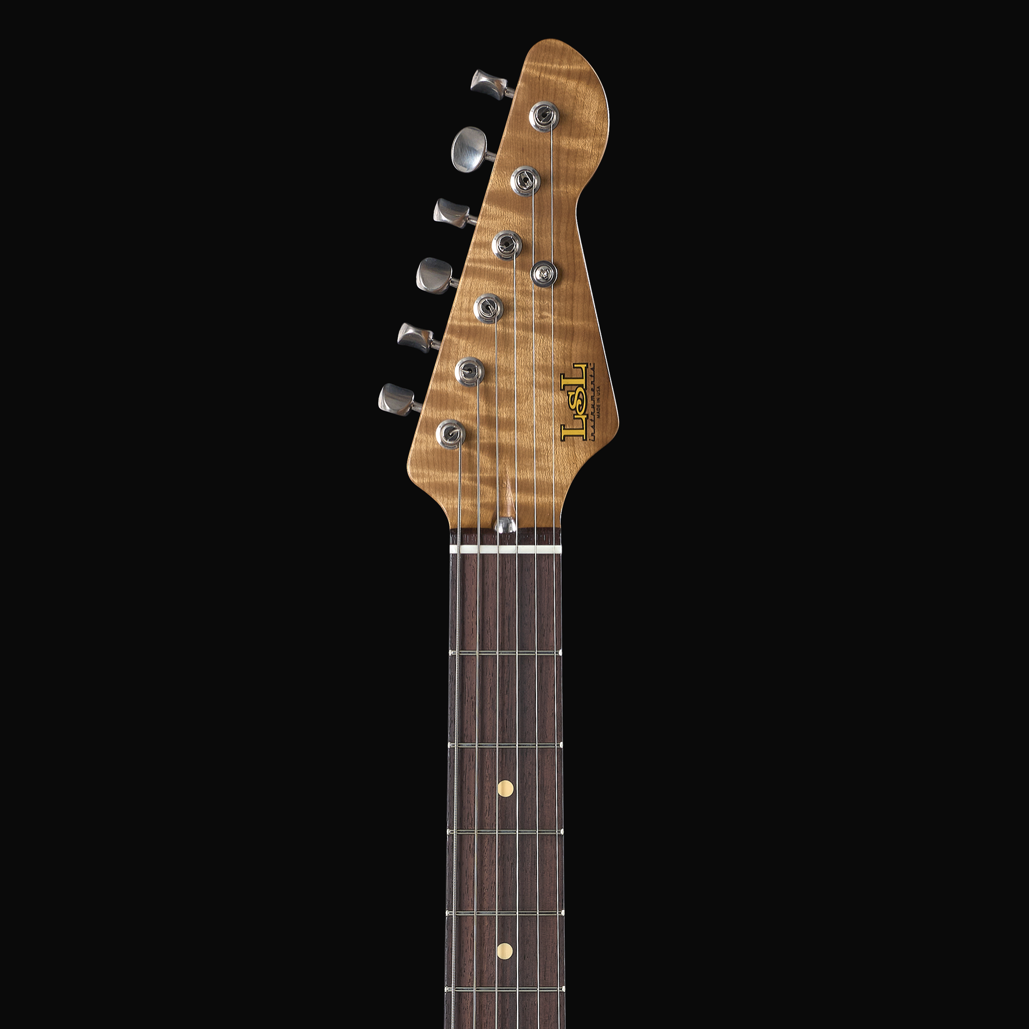 The LsL Saticoy HSS in Lake Placid Blue offers a perfect blend of vintage charm and modern versatility. Its alder body, finished in a captivating Lake Placid Blue with light aging, showcases subtle wear for a touch of understated character. A mint pickguard and chrome hardware complement the sleek aesthetic, while the roasted 3A flame maple neck with a satin finish adds a touch of luxury. Paired with a dark Indian rosewood fingerboard, a Medium C neck profile, 9.5" radius, and 22 6105 frets, this guitar is designed for smooth and effortless playability.