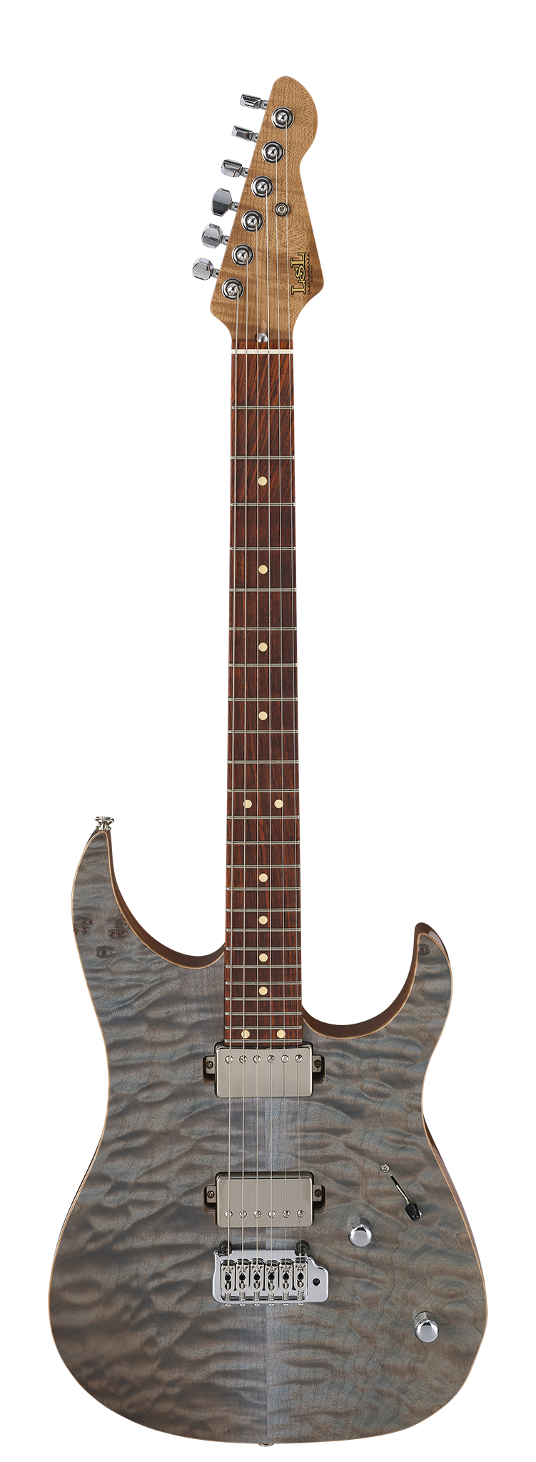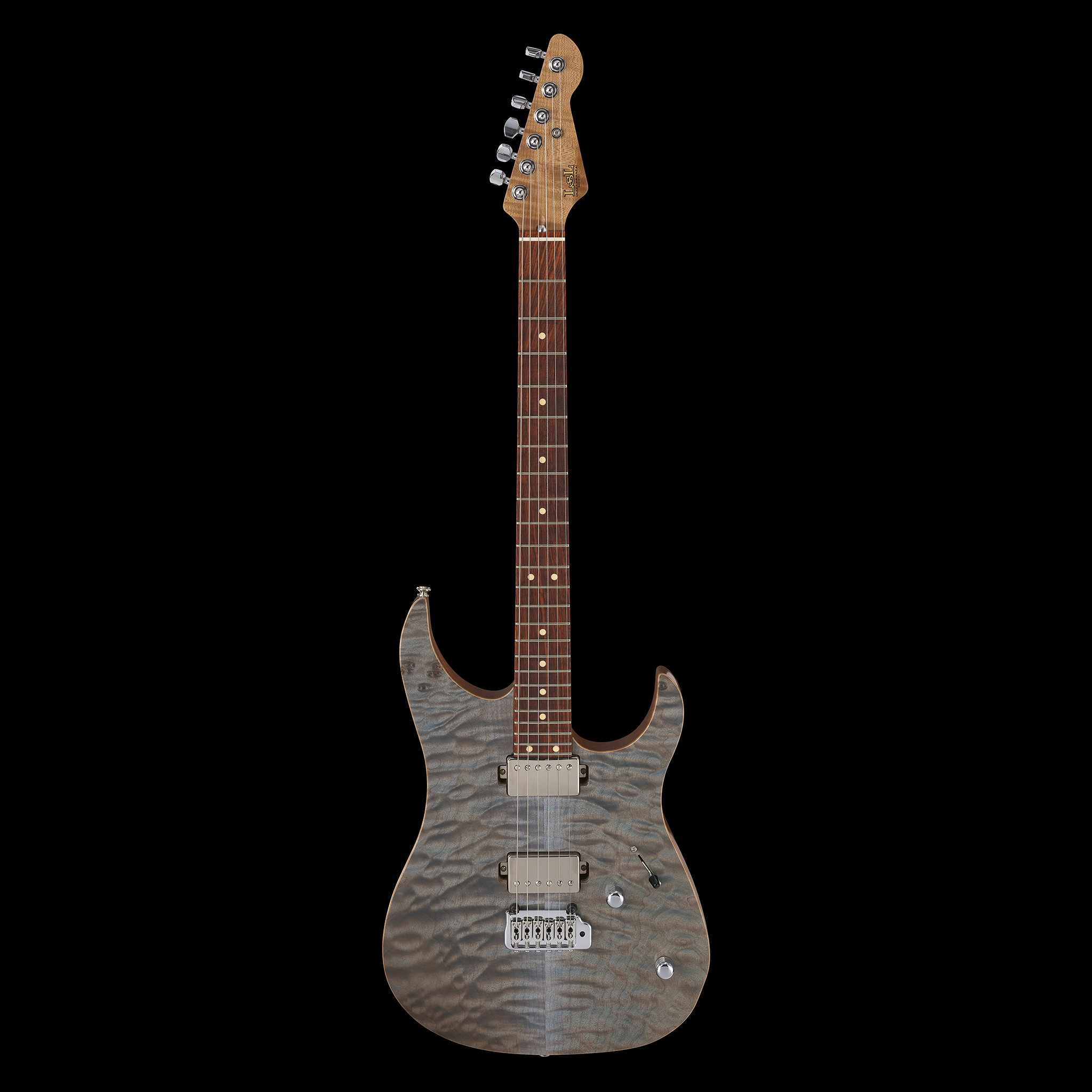 The LsL XT4 DX in Faded Whale Blue is a striking modern guitar that delivers premium aesthetics and exceptional performance. Its African mahogany body features a breathtaking Chevron Angel Quilt top finished in Faded Whale Blue with a natural nitro gloss back, all enhanced by meticulously scraped binding. A sleek satin-finished roasted 3A flame maple neck, paired with a cocobolo fingerboard, offers a refined playing experience with a 16" radius, 24 jumbo frets, and a slim Modern D profile designed for effortless speed and comfort.