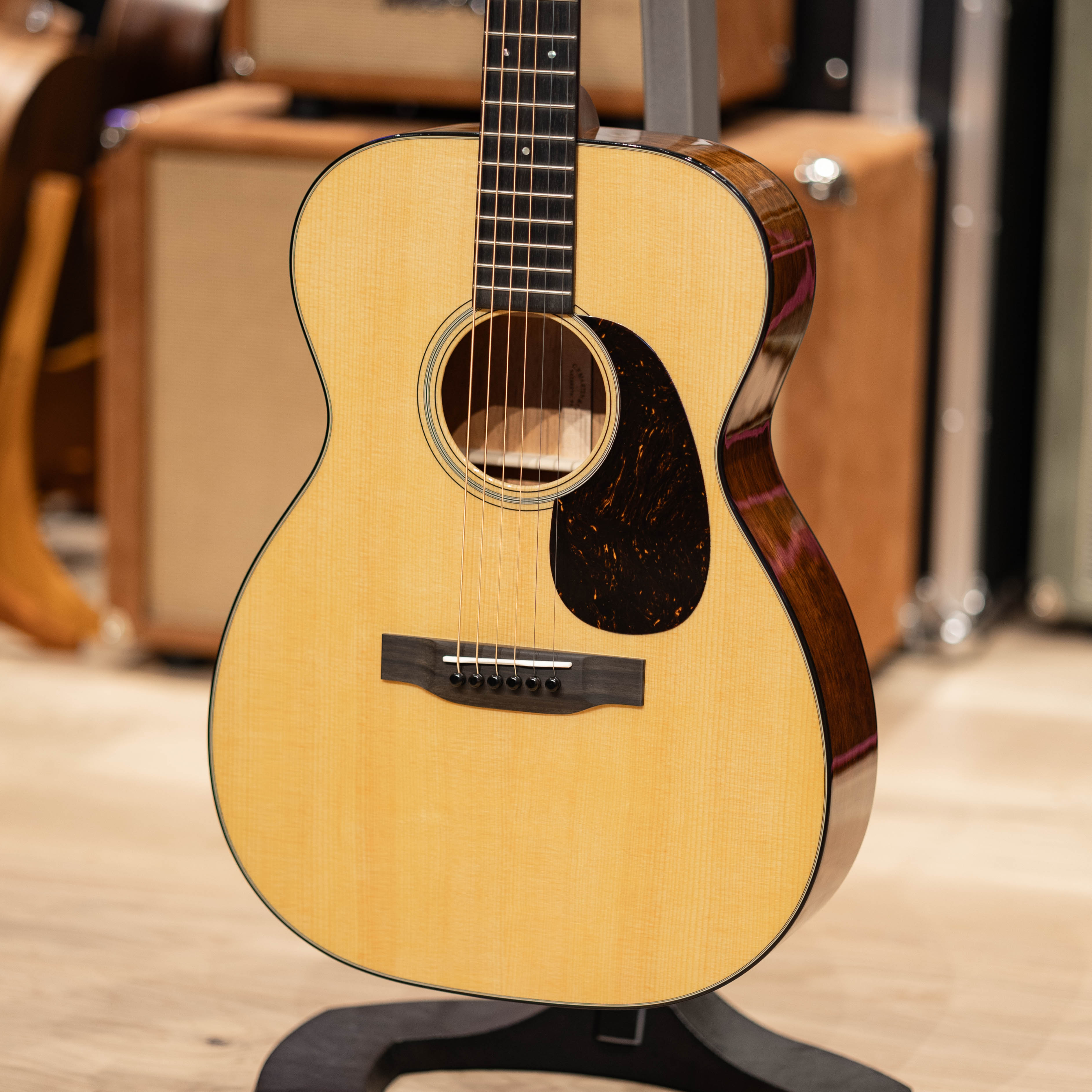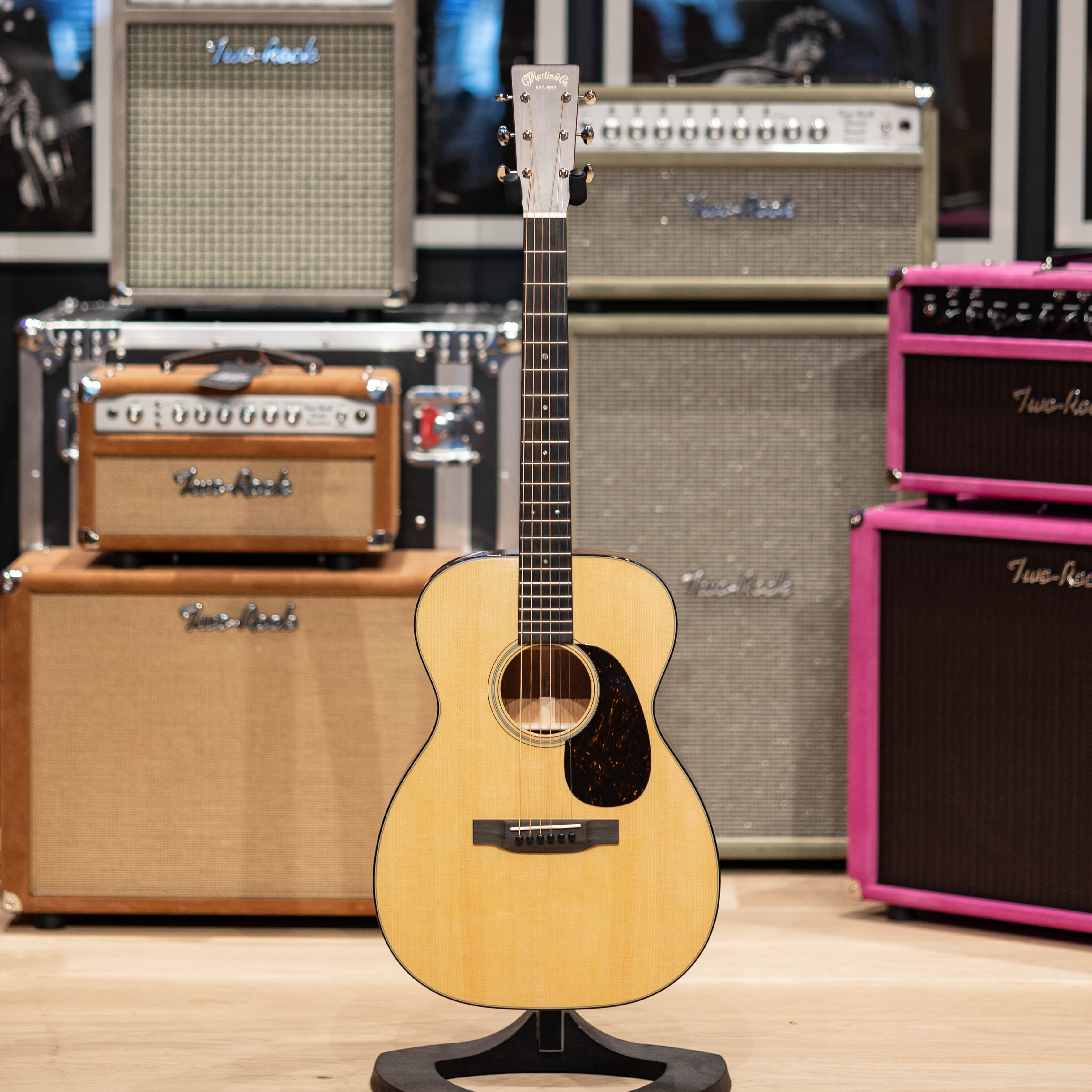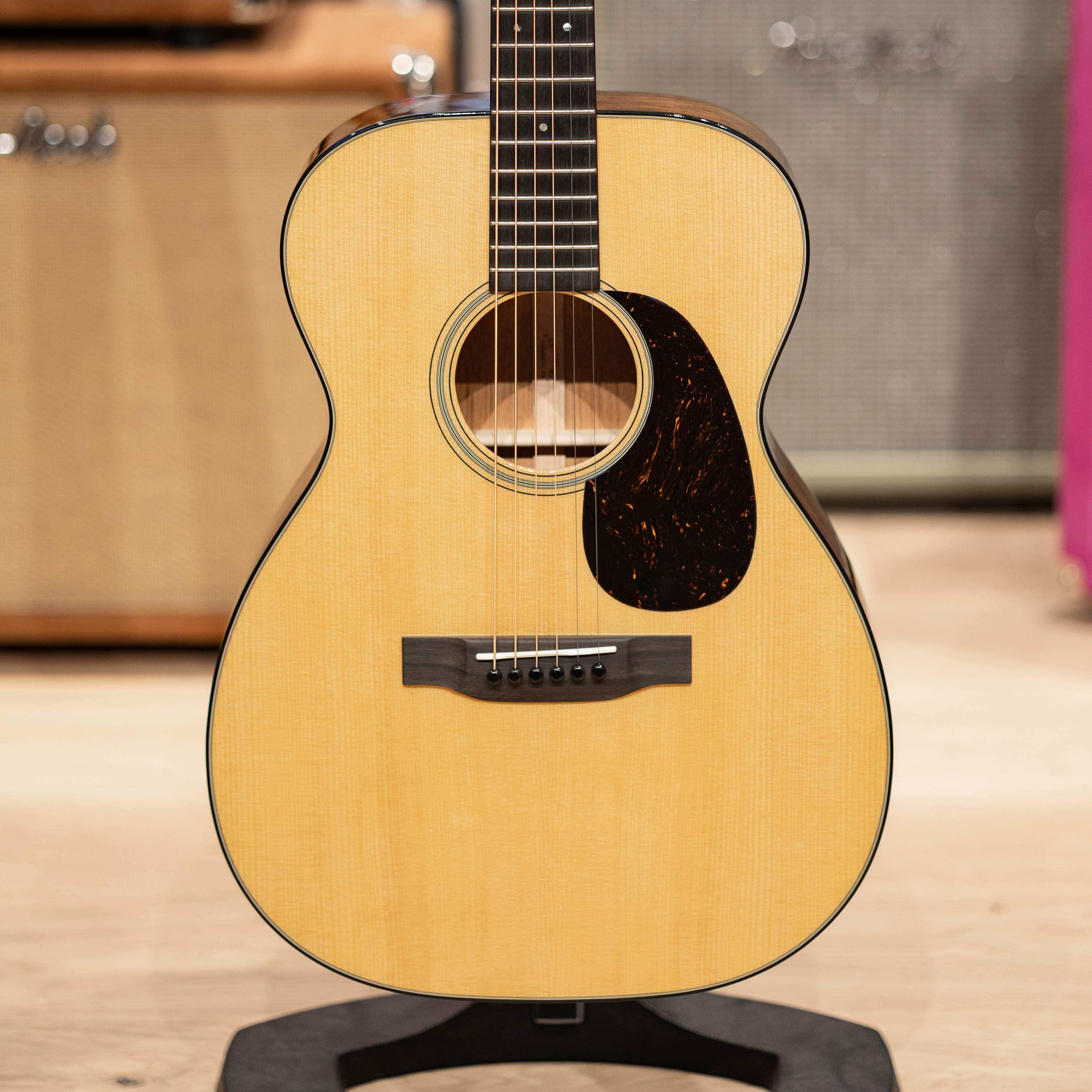 The Martin 00-18 is a trusted classic, beloved for its balanced and timeless tone. Its smaller, comfortable Grand Concert body size delivers a focused voice, with clear trebles and warm bass, making it perfect for intricate finger-style playing and dynamic, nuanced strumming. Handcrafted with a solid spruce top and solid mahogany back and sides, the 00-18 offers a bright treble response, punchy midrange, and the dependable projection players have relied on for generations. Its satin neck with a Golden Era (GE) Modified Low Oval profile, high-performance taper, and 24.9" scale length provides unmatched comfort, while ebony details, including the bridge, bridge pins, and fingerboard with abalone dot inlays, enhance its iconic design. Complete with aging toner on its top, black binding, and nickel open gear tuners, the 00-18 is a guitar you can trust.