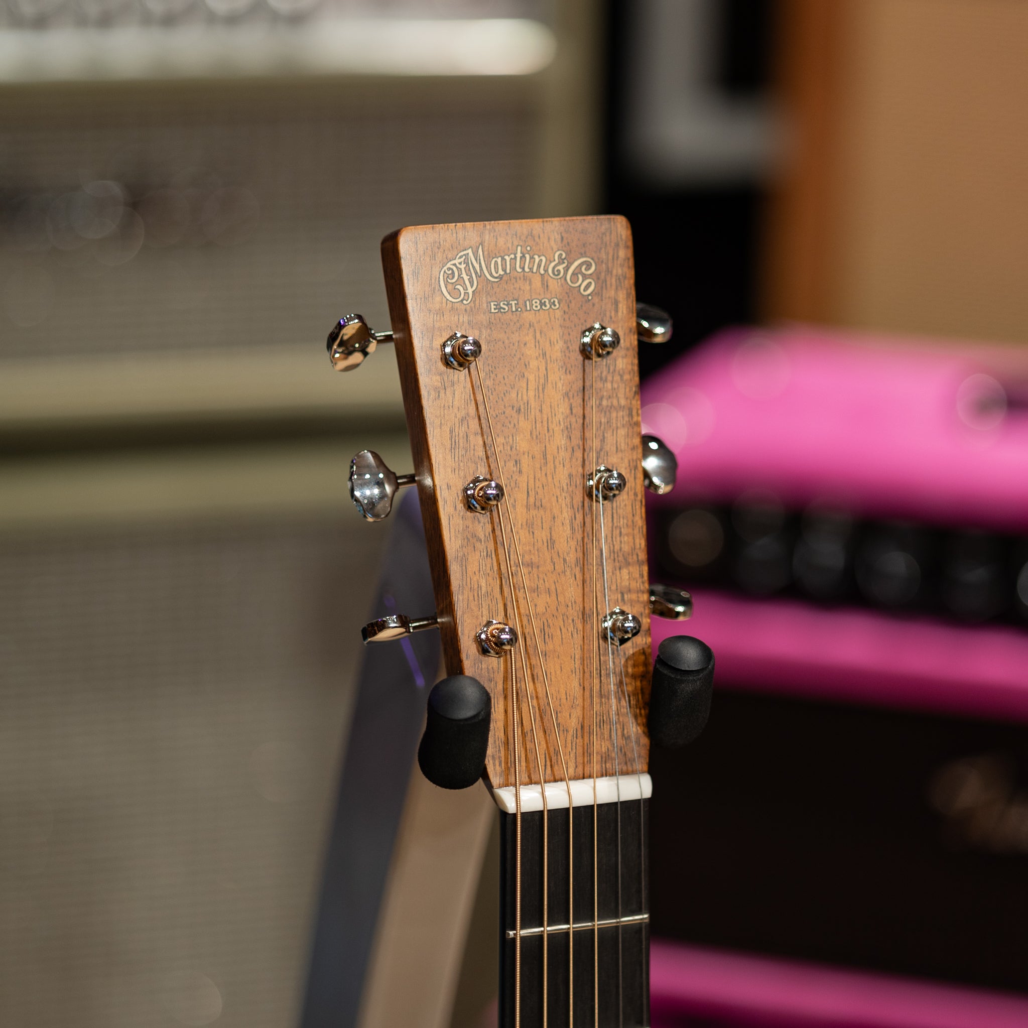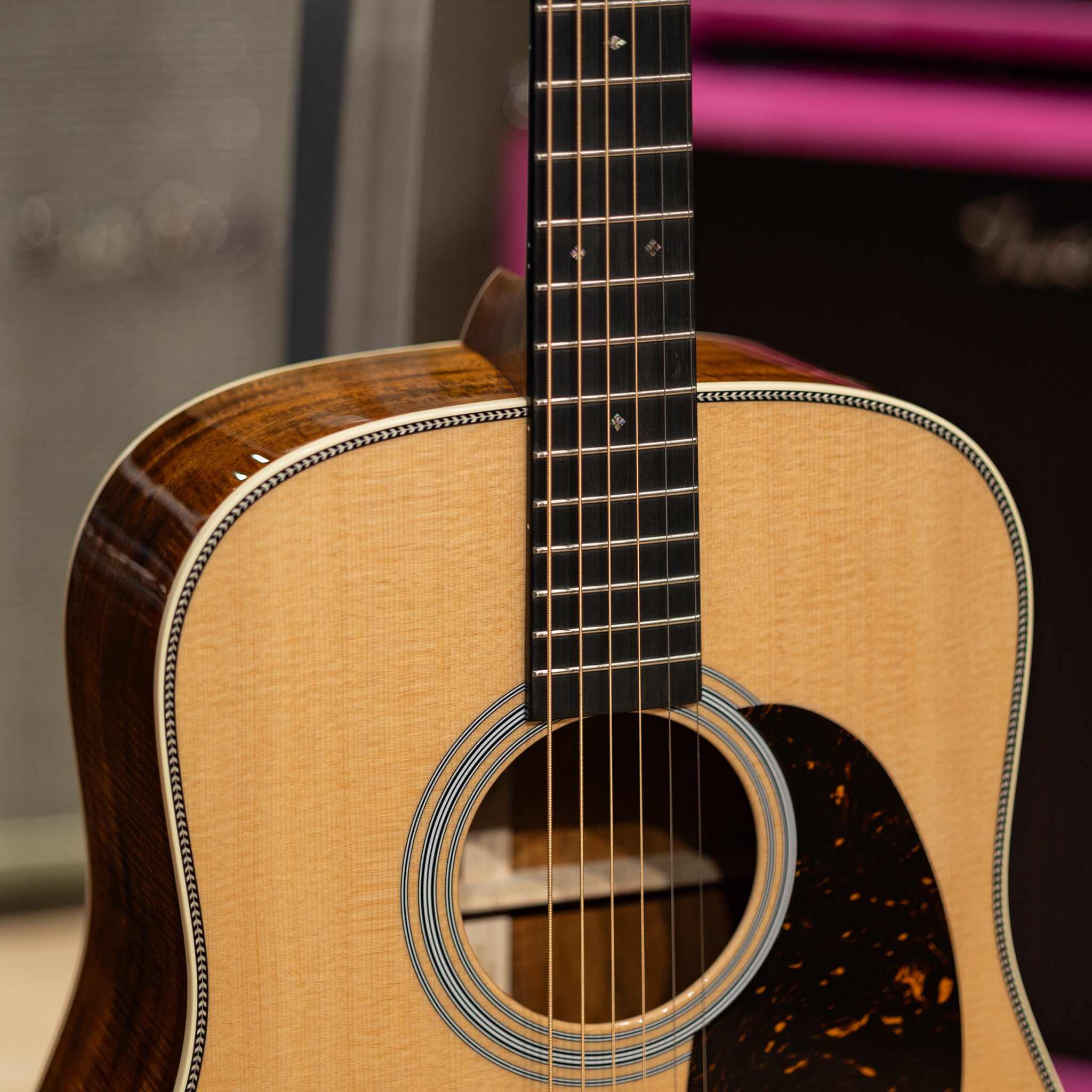 This Round Hill Music Co. spec'd Martin utilizes absolutely exceptional, hand-selected, broad figure koa for the back and sides creating not only a visually striking appearance, but also a balanced tone with a strong midrange, bright highs, and tight, controlled bass. Koa will become warmer, richer, and more complex over time as it ages is played more. We appointed the herringbone trim to celebrate Martin's traditional craftsmanship and classic aesthetics.