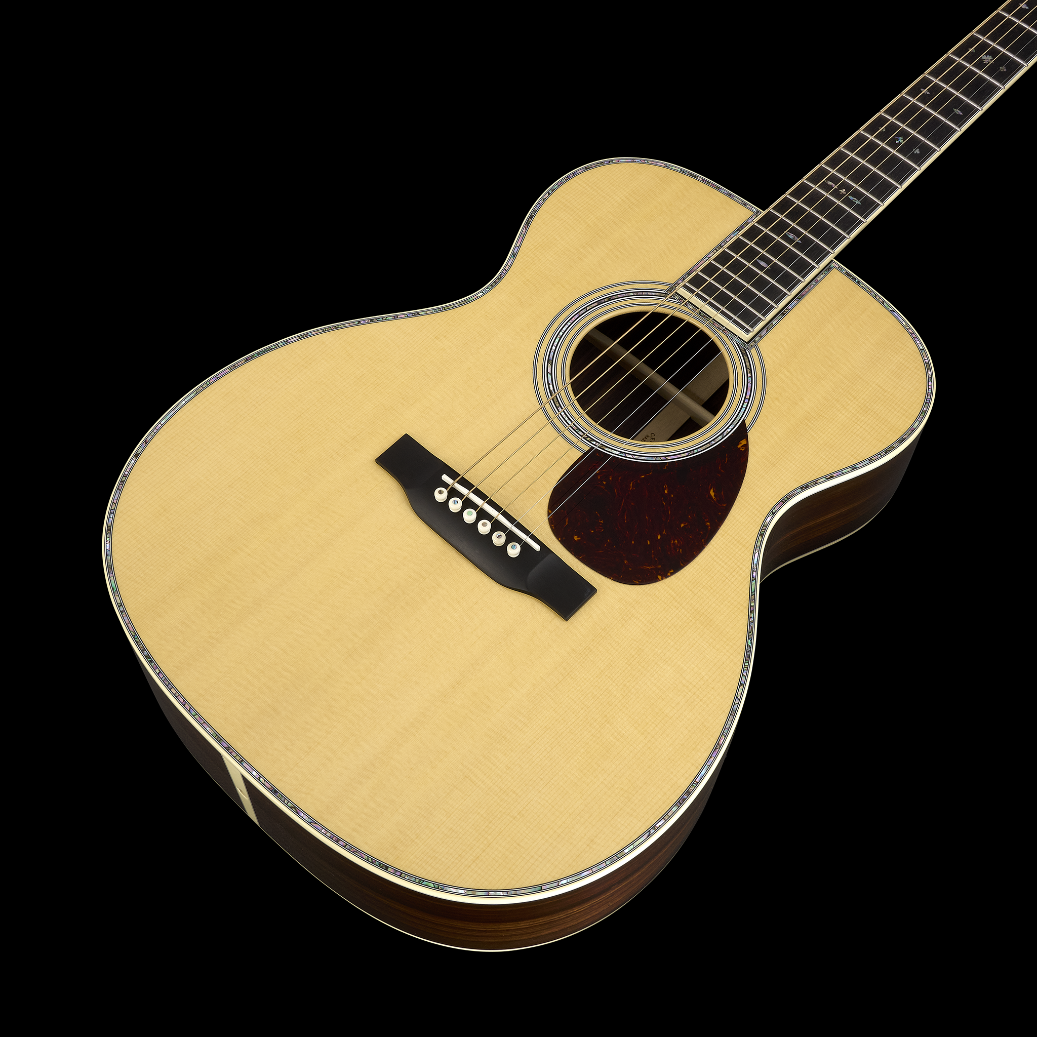 The Martin OM-42 is a trusted blend of tone and craftsmanship, designed for players who value exceptional sound and stunning visual details. Its Auditorium body size delivers balanced tone across all six strings, with deep bass, rich overtones, and clear trebles that suit any playing style. Handcrafted with a solid spruce top and solid East Indian rosewood back and sides, the OM-42 offers a resonant voice with enhanced projection and sustain, thanks to its longer 25.4" scale length. The gloss genuine mahogany neck, featuring a Golden Era (GE) Modified Low Oval profile and high-performance taper, ensures effortless playability and precision. Adorned with exquisite abalone details, the OM-42 features snowflake inlays on the bound ebony fingerboard, a shimmering rosette, and pearl trim on the top that wraps elegantly around the fingerboard.