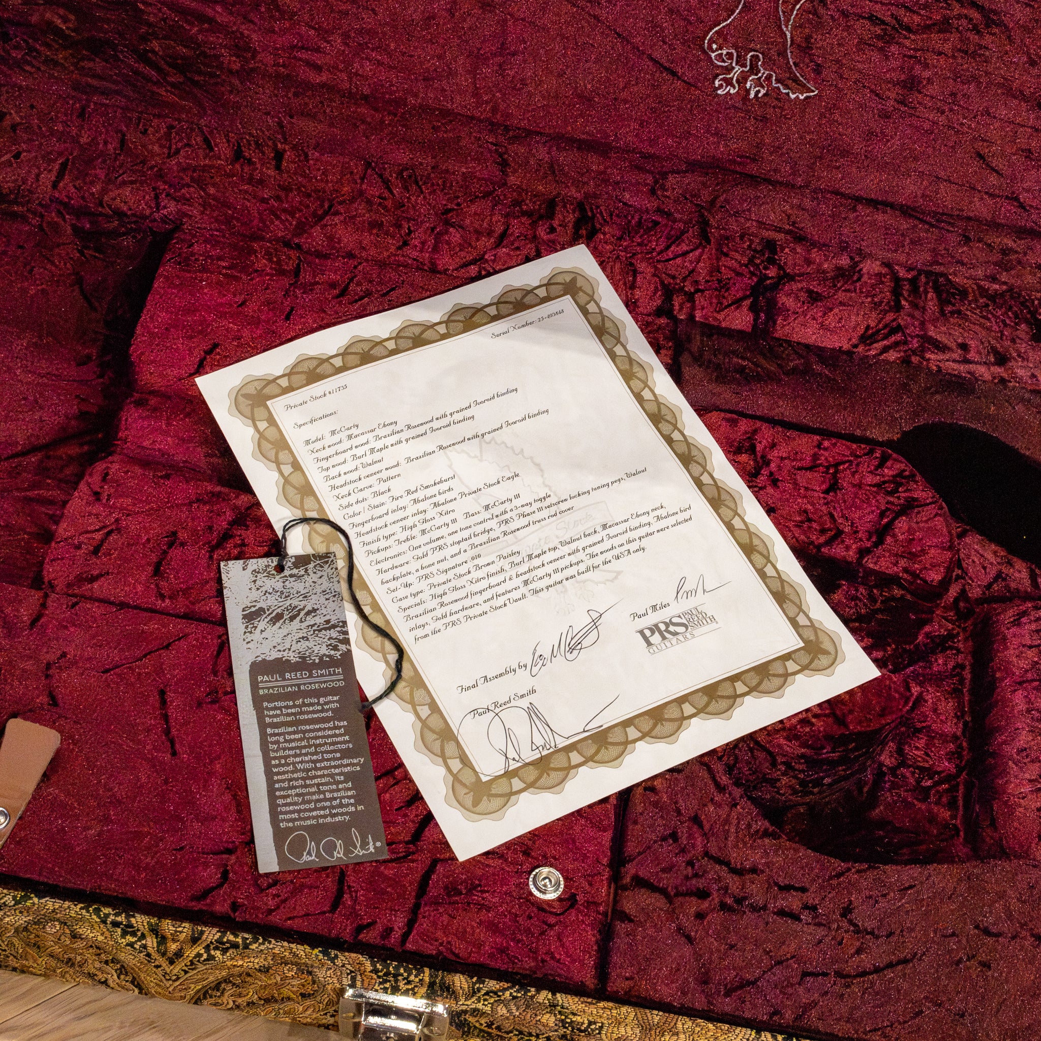 This Guitar Private Stock #11735 is a version of the famous PRS McCarty model in Fire Red Burst finish. The Macassar ebony neck paired with a Brazilian rosewood fretboard is a stunning combination. The body is a nicely figured walnut that adds depth to the Burl Maple top for a great tone combination A great addition to any serious guitar collection.