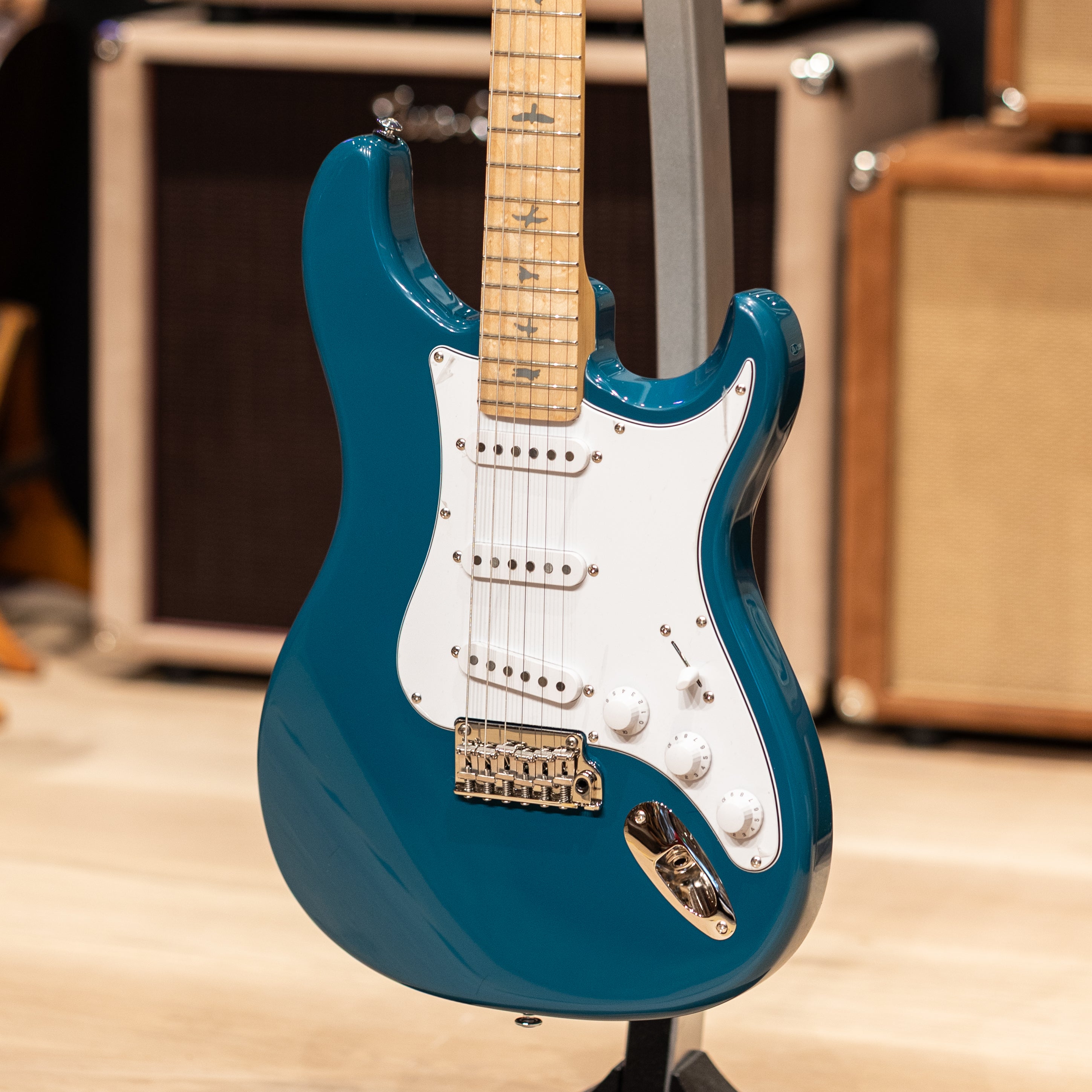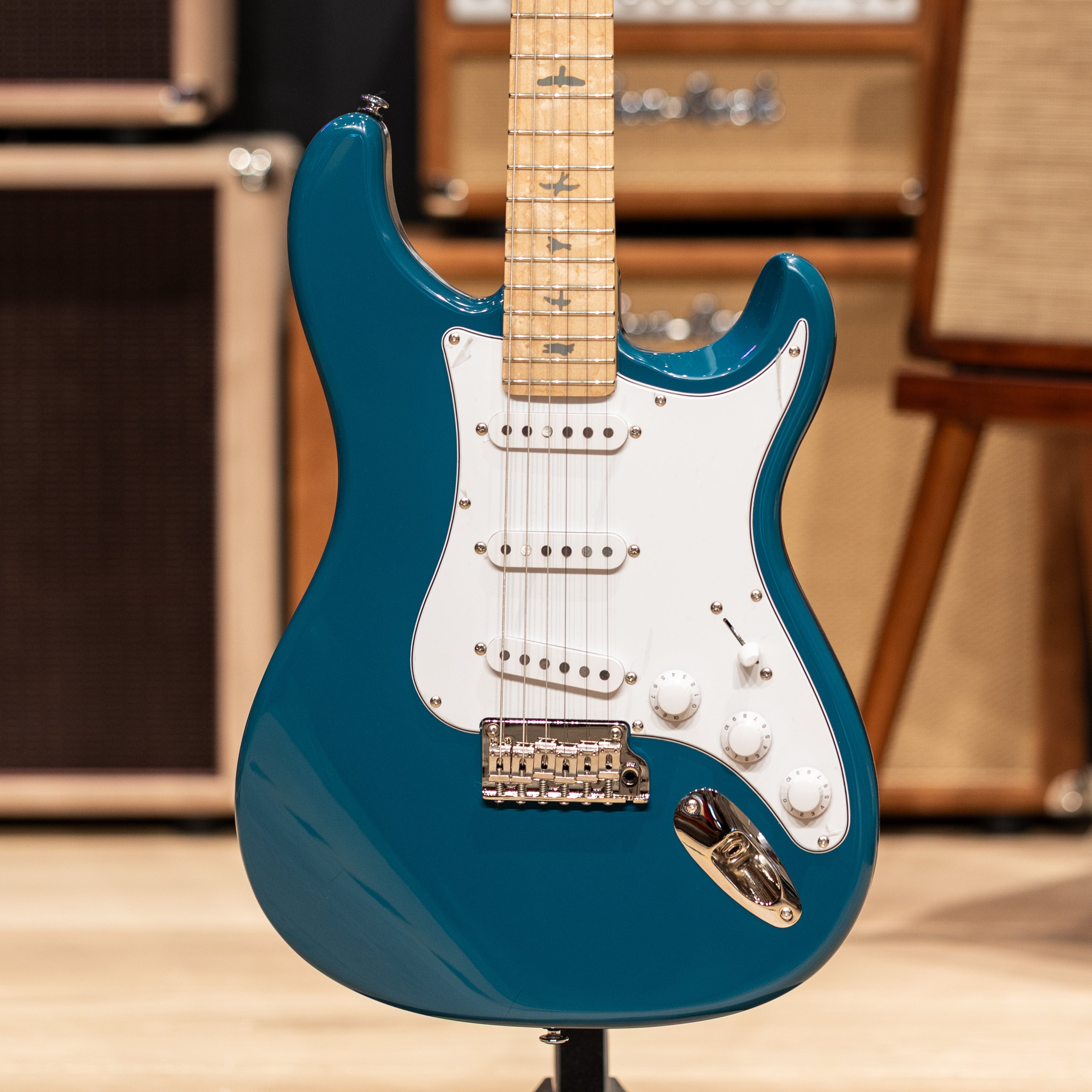 The PRS SE Silver Sky starts with a poplar body and bolt-on maple neck with PRS trademark bird inlays. The 22-fret, 25.5” scale length neck features the original 635JM carve and an 8.5” fretboard radius, so the PRS SE Silver Sky will feel right at home. Plug it in, and the three single-coil 635JM “S” pickups will bark and sing. This guitar is anchored by a two-point steel tremolo, synthetic bone nut, and vintage-style tuners. Other design features include the PRS Silver Sky inverted headstock shape and the PRS double-acting truss rod (accessible from the front of the headstock for ease of use).
