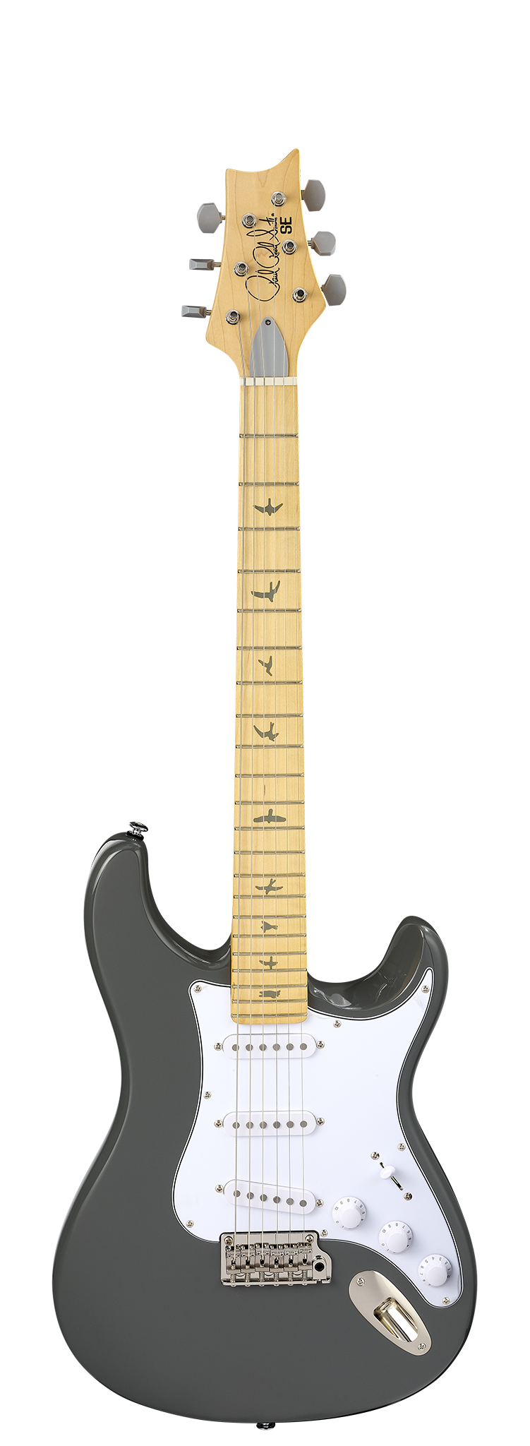 The PRS SE Silver Sky starts with a poplar body, bolt-on maple neck, and rosewood fretboard with PRS trademark bird inlays. The 22-fret, 25.5” scale length neck features the original 635JM carve and an 8.5” fretboard radius, so the PRS SE Silver Sky will feel right at home. Plug it in, and the three single-coil 635JM “S” pickups will bark and sing. This guitar is anchored by a two-point steel tremolo, synthetic bone nut, and vintage-style tuners. Other design features include the PRS Silver Sky inverted headstock shape and the PRS double-acting truss rod (accessible from the front of the headstock for ease of use).