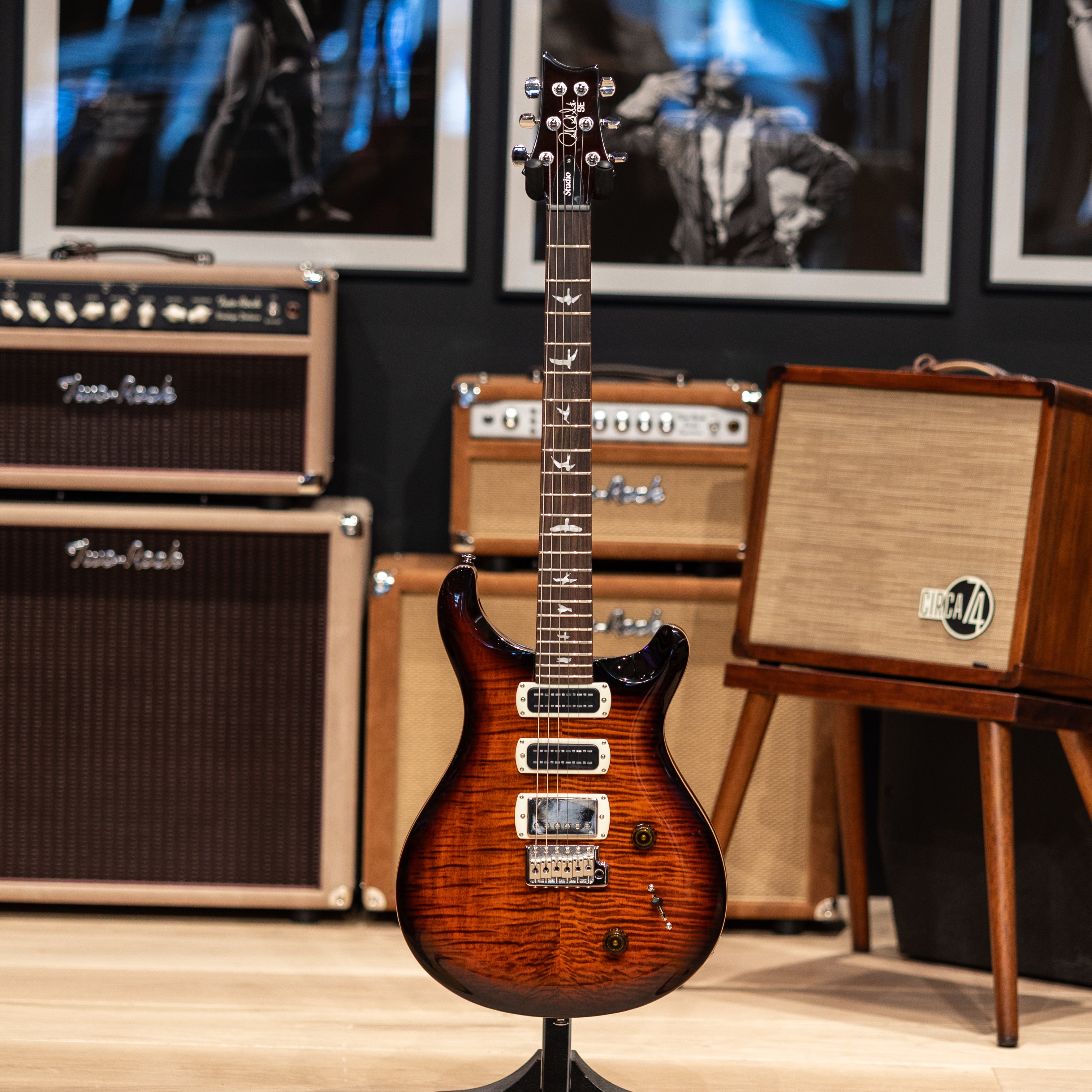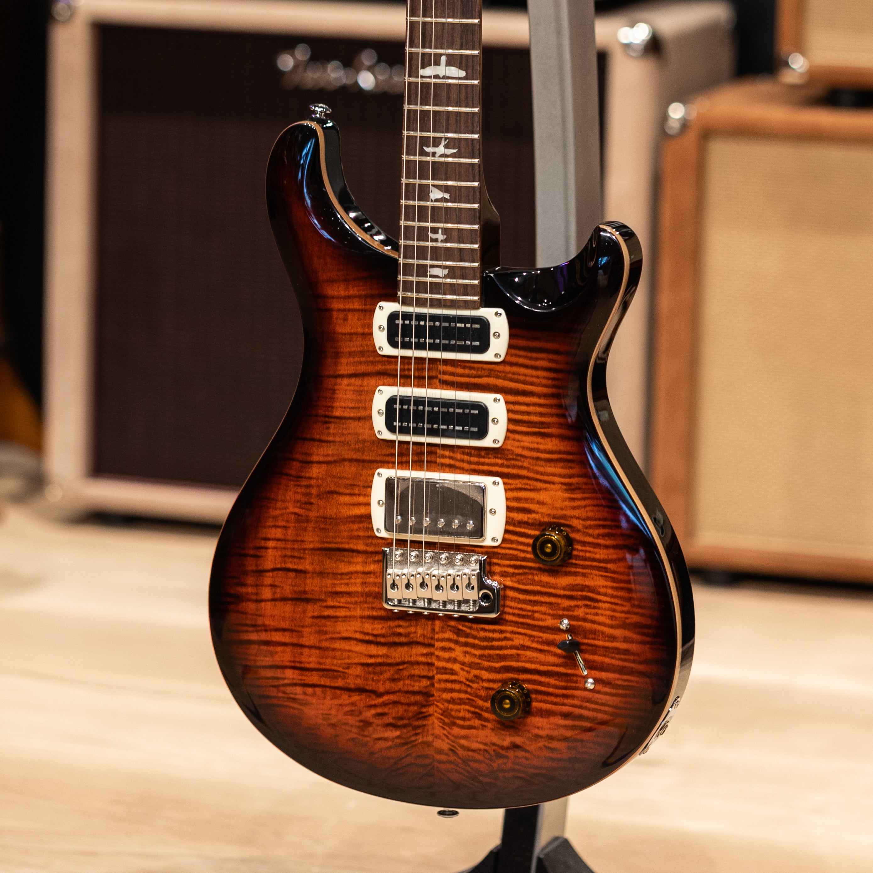 The SE Studio has an inviting feel the moment we sit down with it. The gloss finish highlights the maple top in a way that feels bright and energetic. Orange Tiger Smokeburst adds a bold, lively presence that stands out without feeling over the top. The mahogany body brings a warm, steady resonance that you can sense even before plugging in, giving the guitar a grounded and confident character.