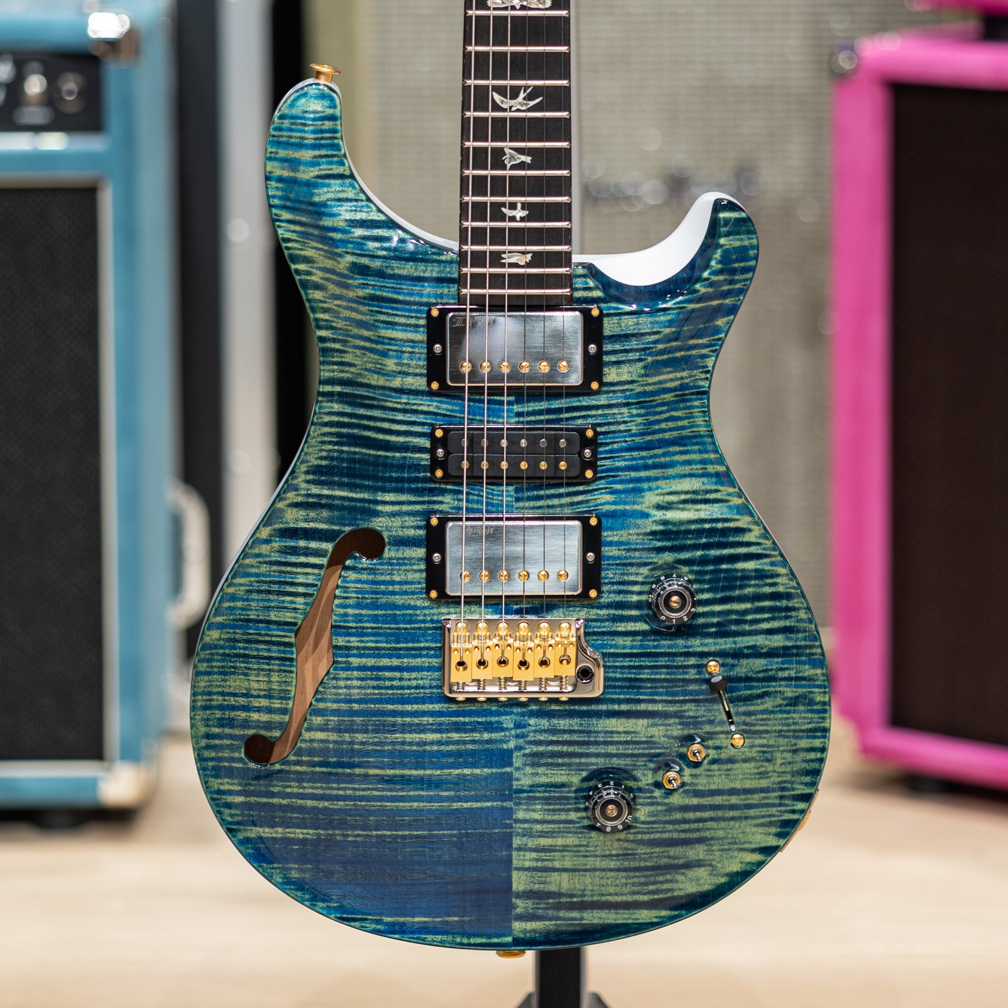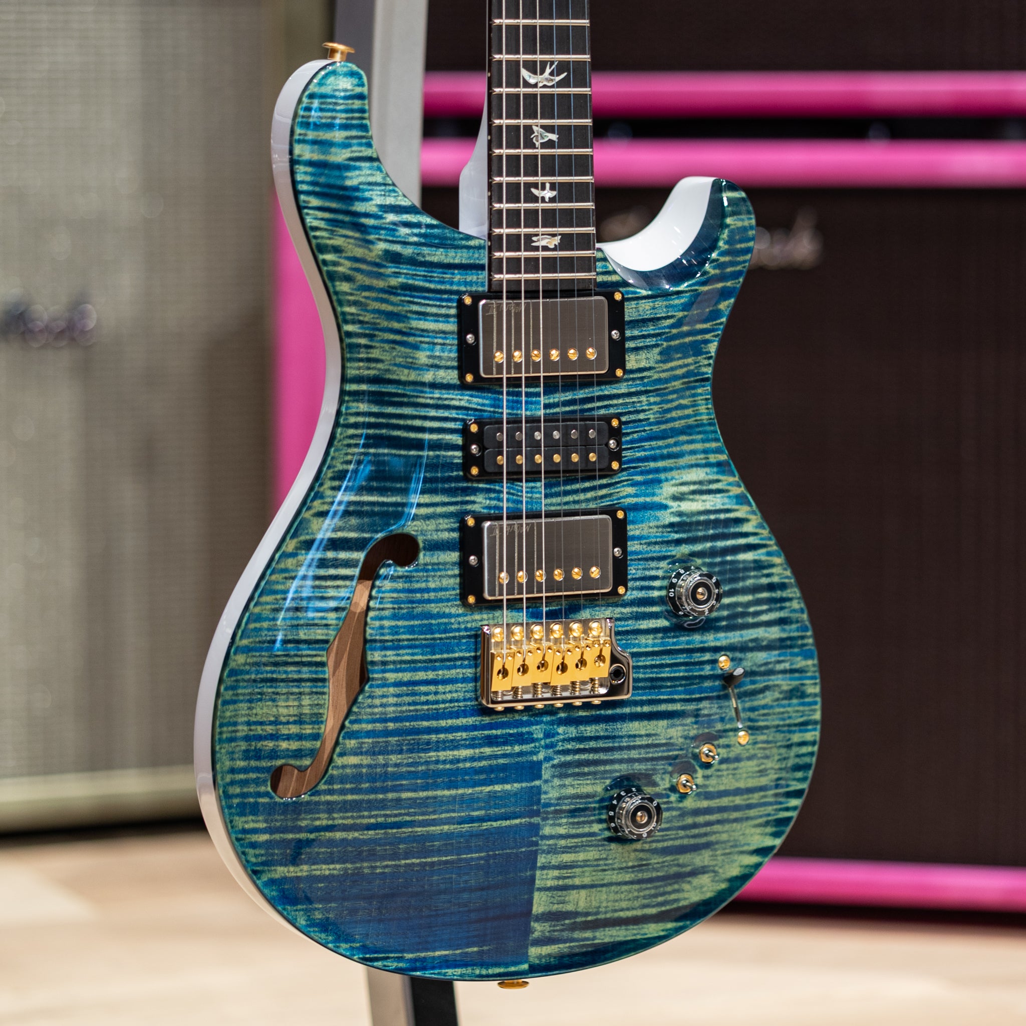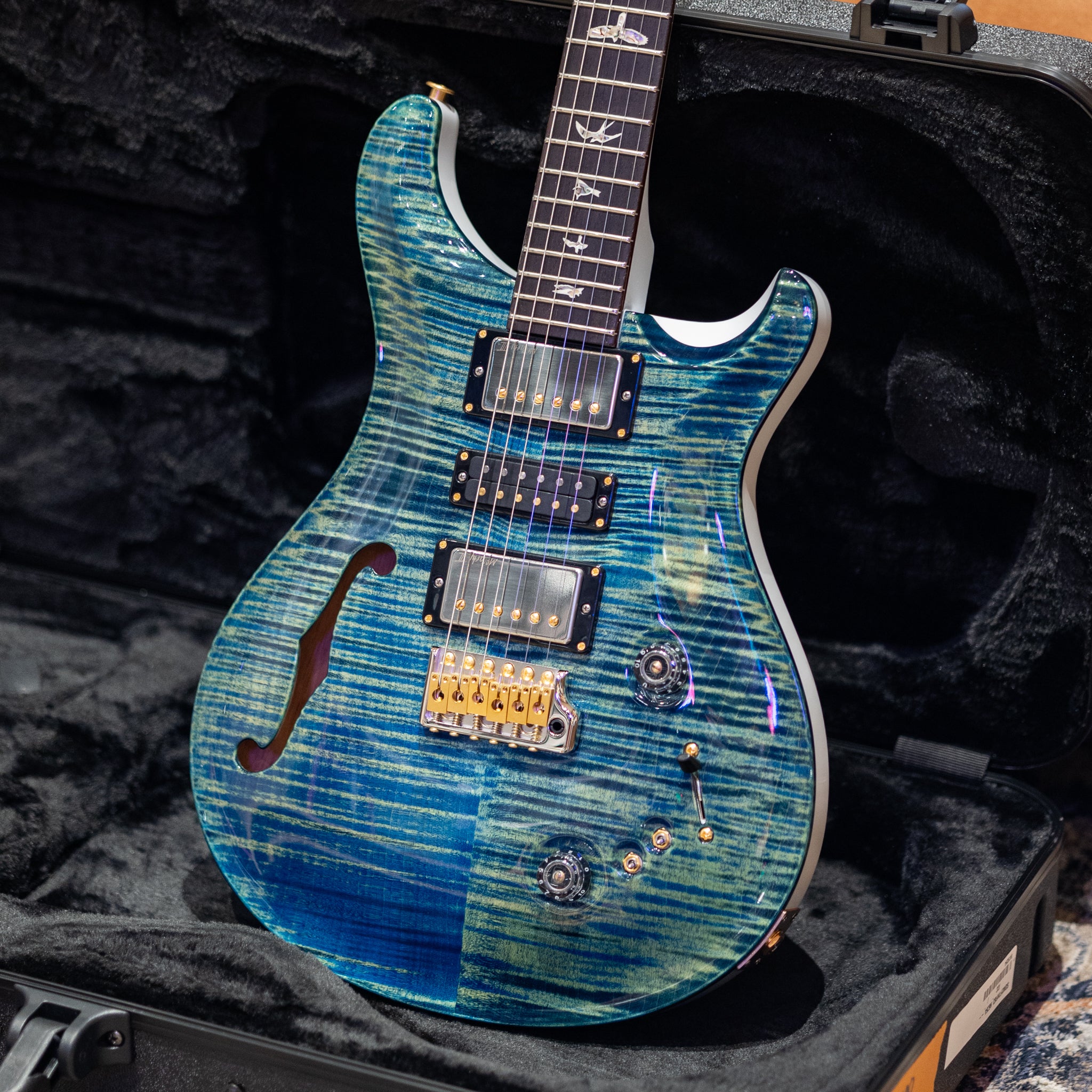 Featuring a beautifully carved 10-Top maple over a resonant mahogany back, the semi-hollow body construction adds airy depth and harmonic richness while maintaining the focused attack PRS is known for. The elegant F-hole not only enhances resonance but gives the guitar a refined, classic aesthetic.