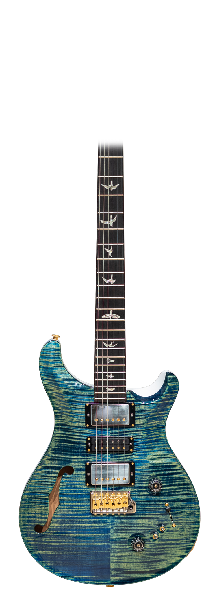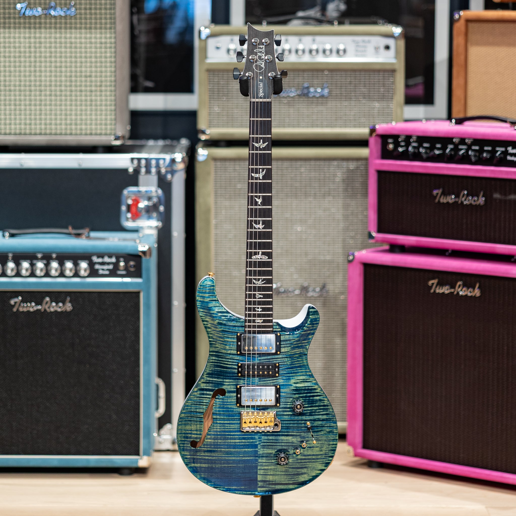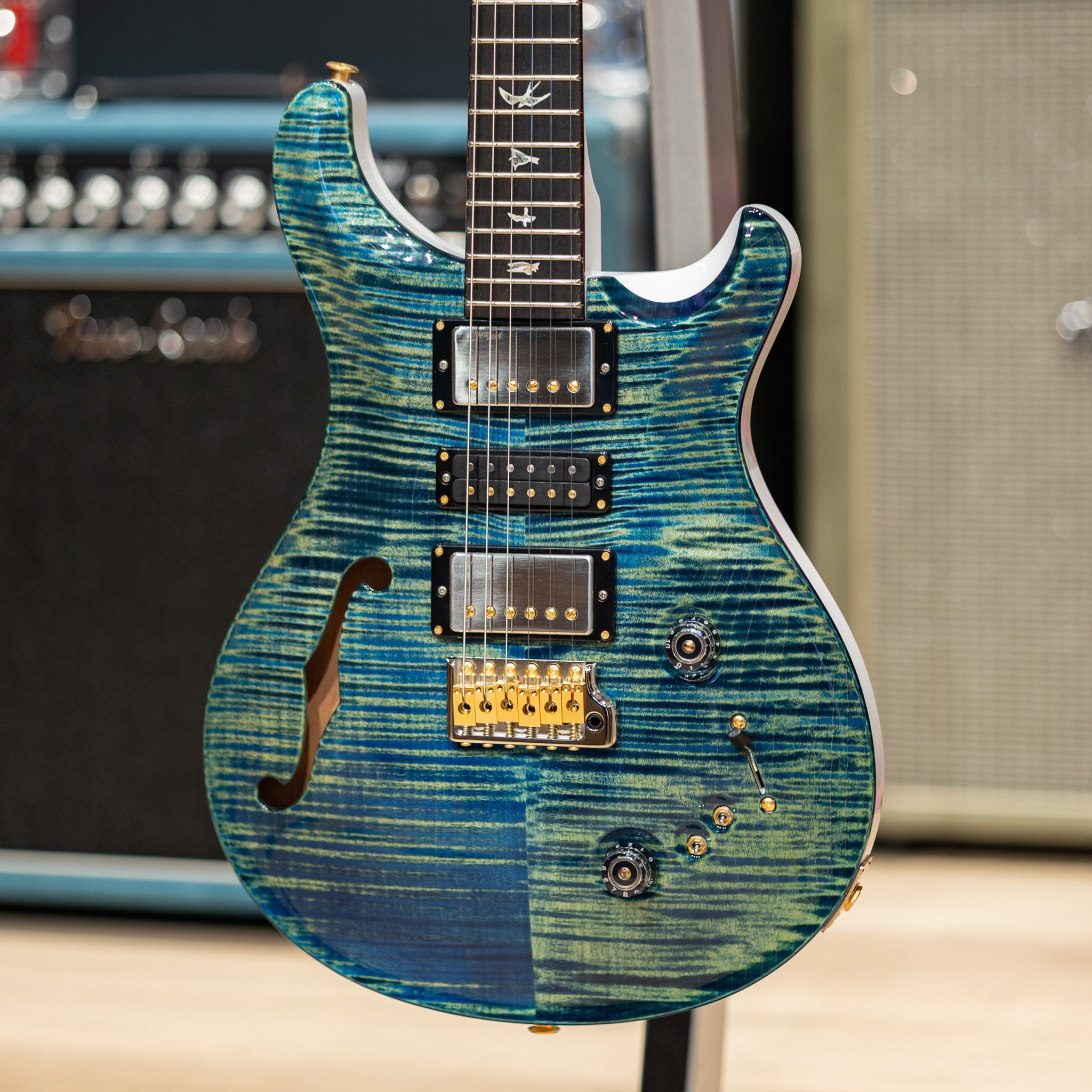 Featuring a beautifully carved 10-Top maple over a resonant mahogany back, the semi-hollow body construction adds airy depth and harmonic richness while maintaining the focused attack PRS is known for. The elegant F-hole not only enhances resonance but gives the guitar a refined, classic aesthetic.