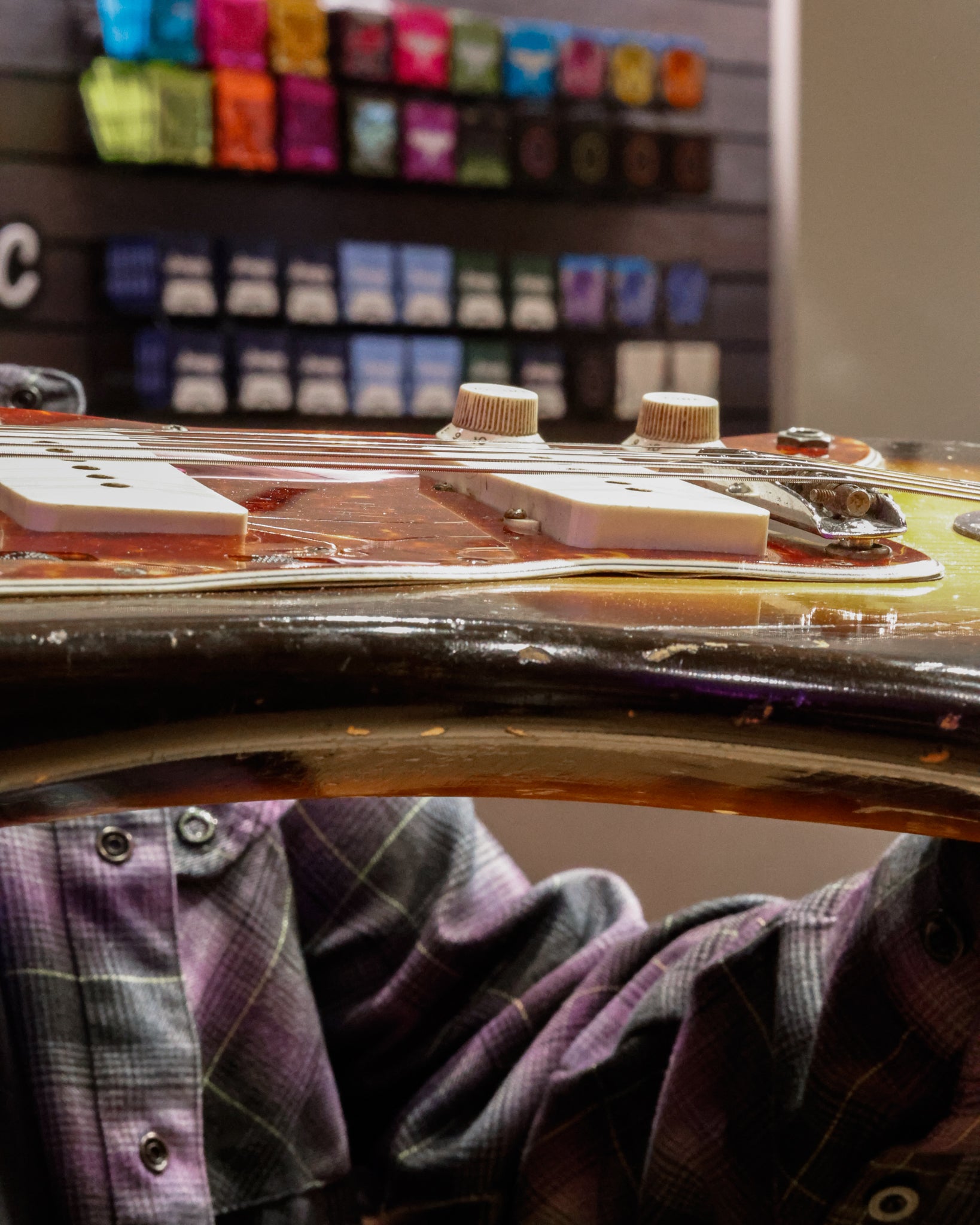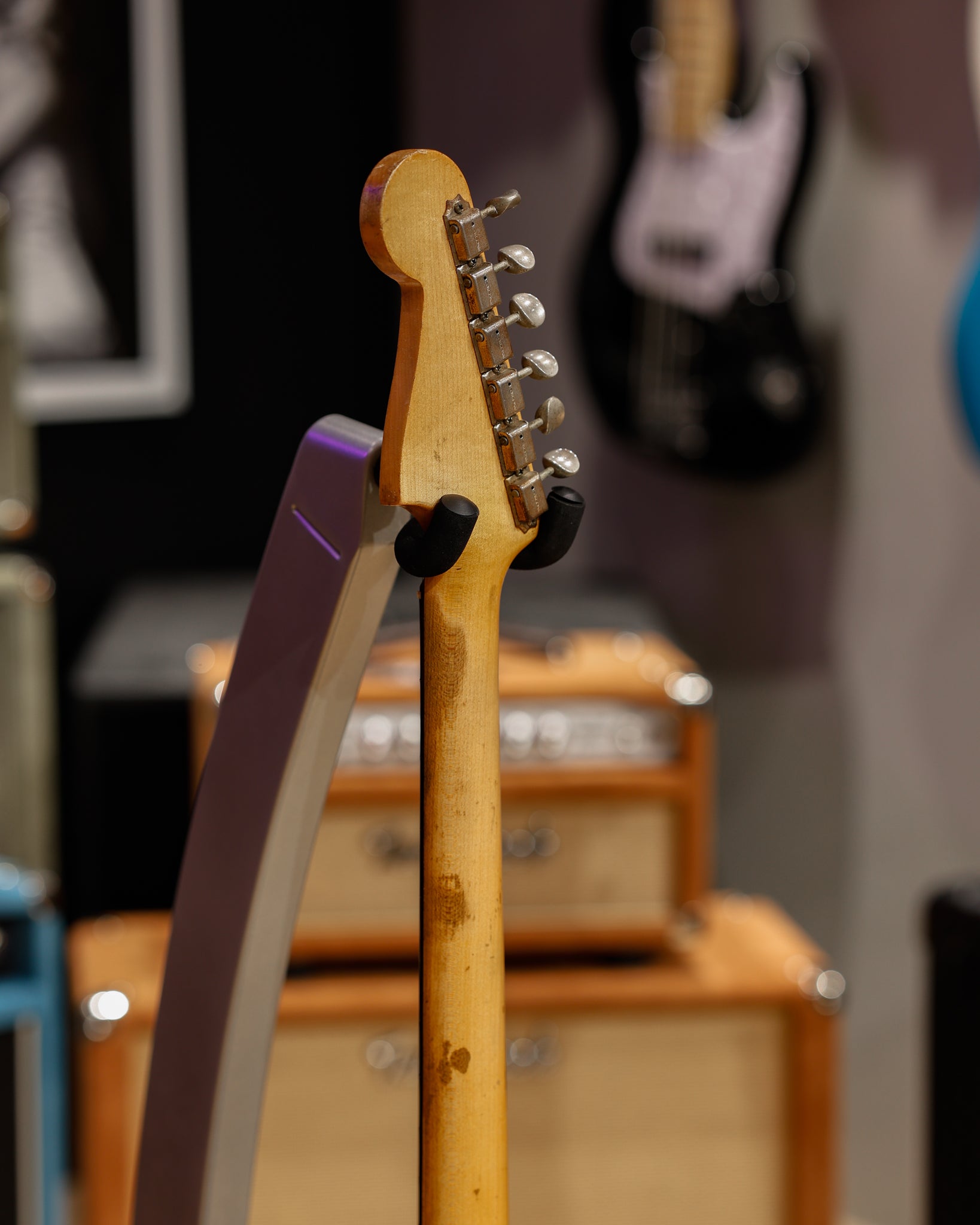 This example is in solid player-grade condition. The original frets remain intact and, while they were leveled at some point and now sit slightly lower, the guitar still plays smoothly with a low action and a fully functional truss rod. The pickguard shows noticeable warping and cannot be removed without risk of damage, though we were able to carefully access the electronics area and confirm that the pickups and pots are original. The toggle switch cap is not original. Included is the original case trem arm and bridge cover.