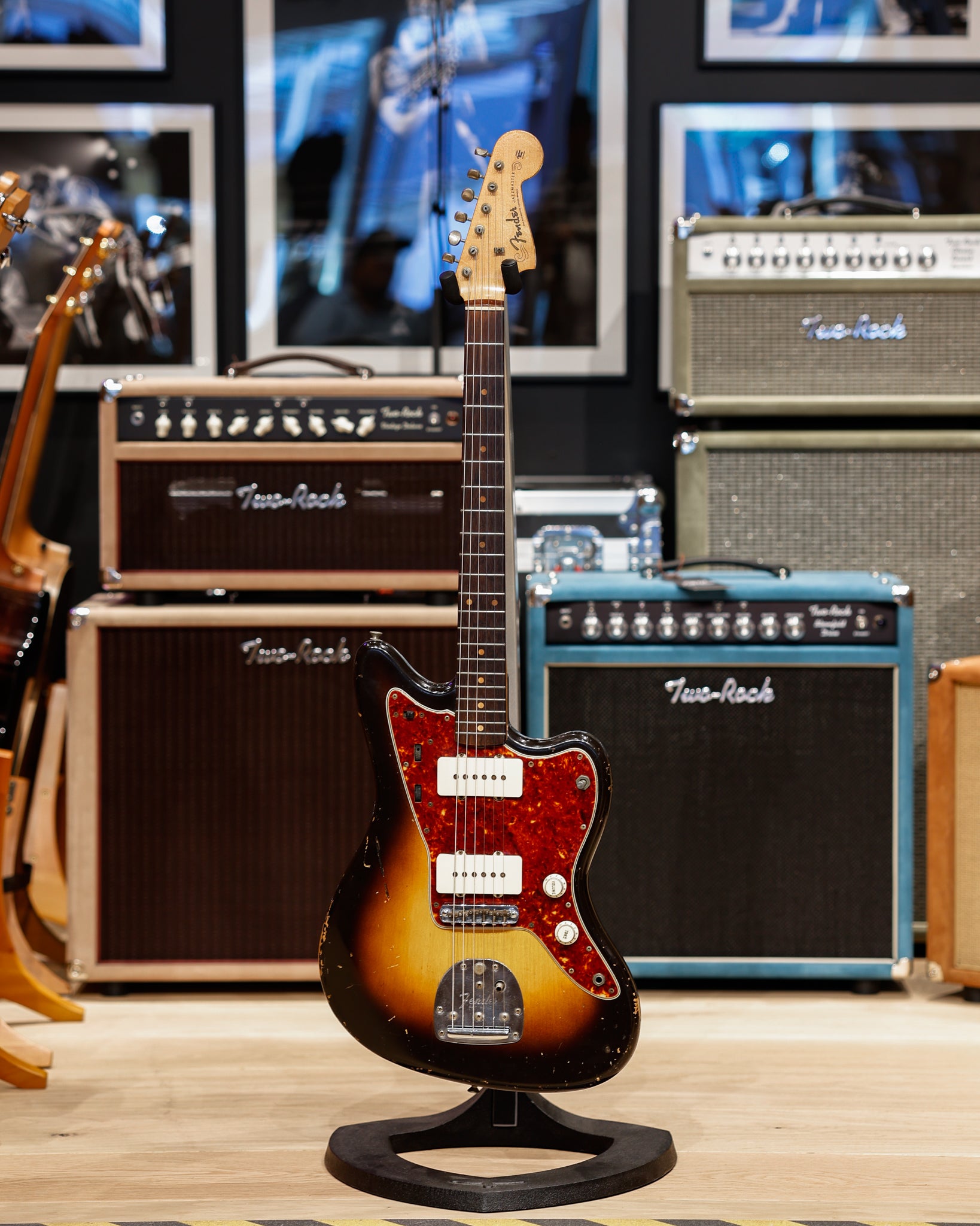 From the first full year of production, this 1960 Fender Jazzmaster embodies the golden era of Fender craftsmanship. Introduced in 1958 as the company’s top-of-the-line model, the Jazzmaster was aimed at professional players and quickly became an icon of offset design. This early model features the classic slab rosewood fingerboard, clay dot inlays, and wide single-coil pickups that deliver the warm, woody tones prized by collectors and players alike. The offset body provides exceptional comfort, while the floating tremolo and lead/rhythm circuit make it one of the most versatile instruments of its time.