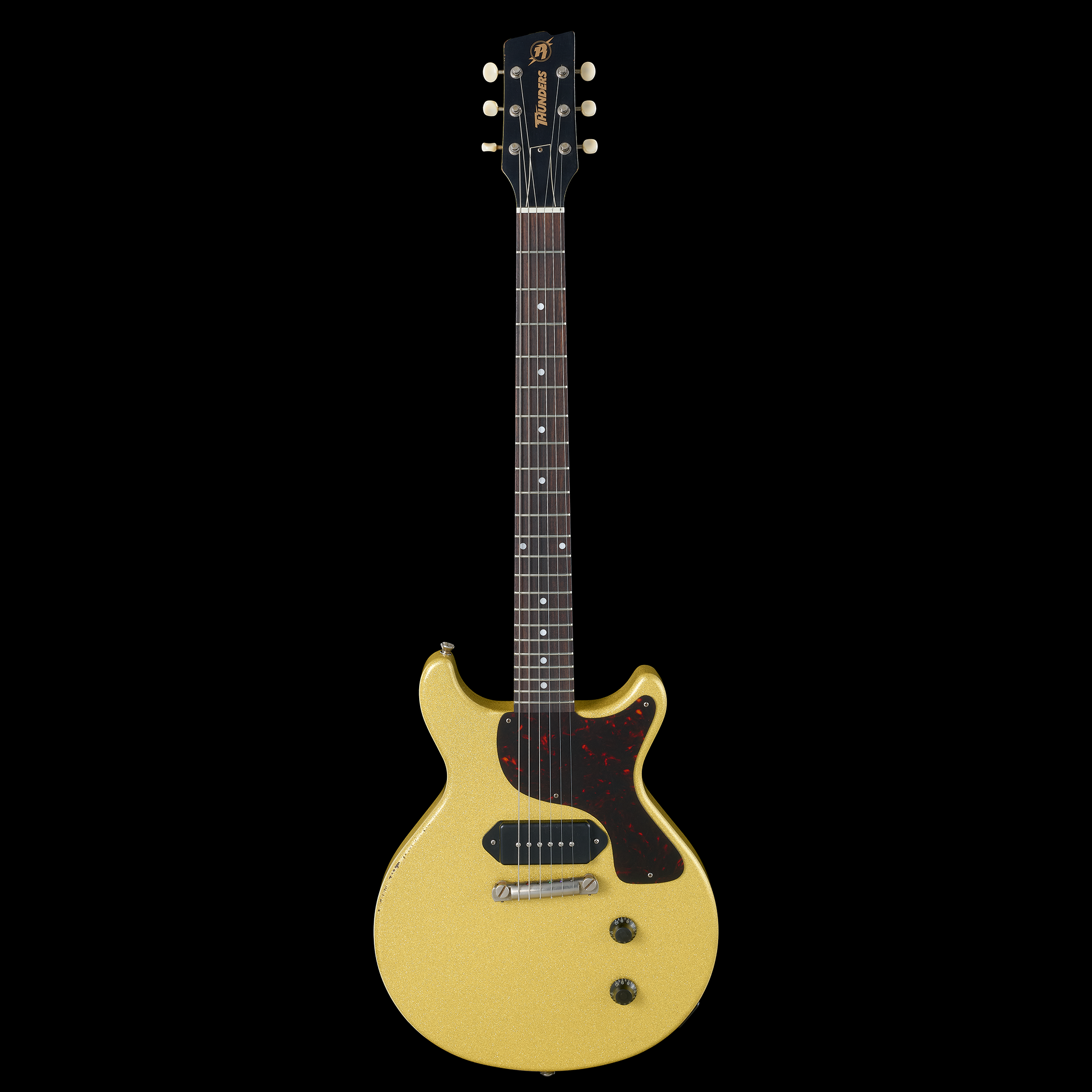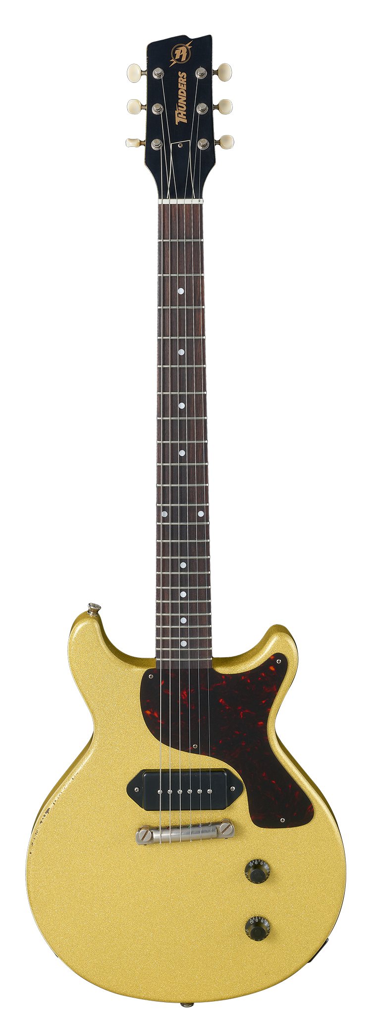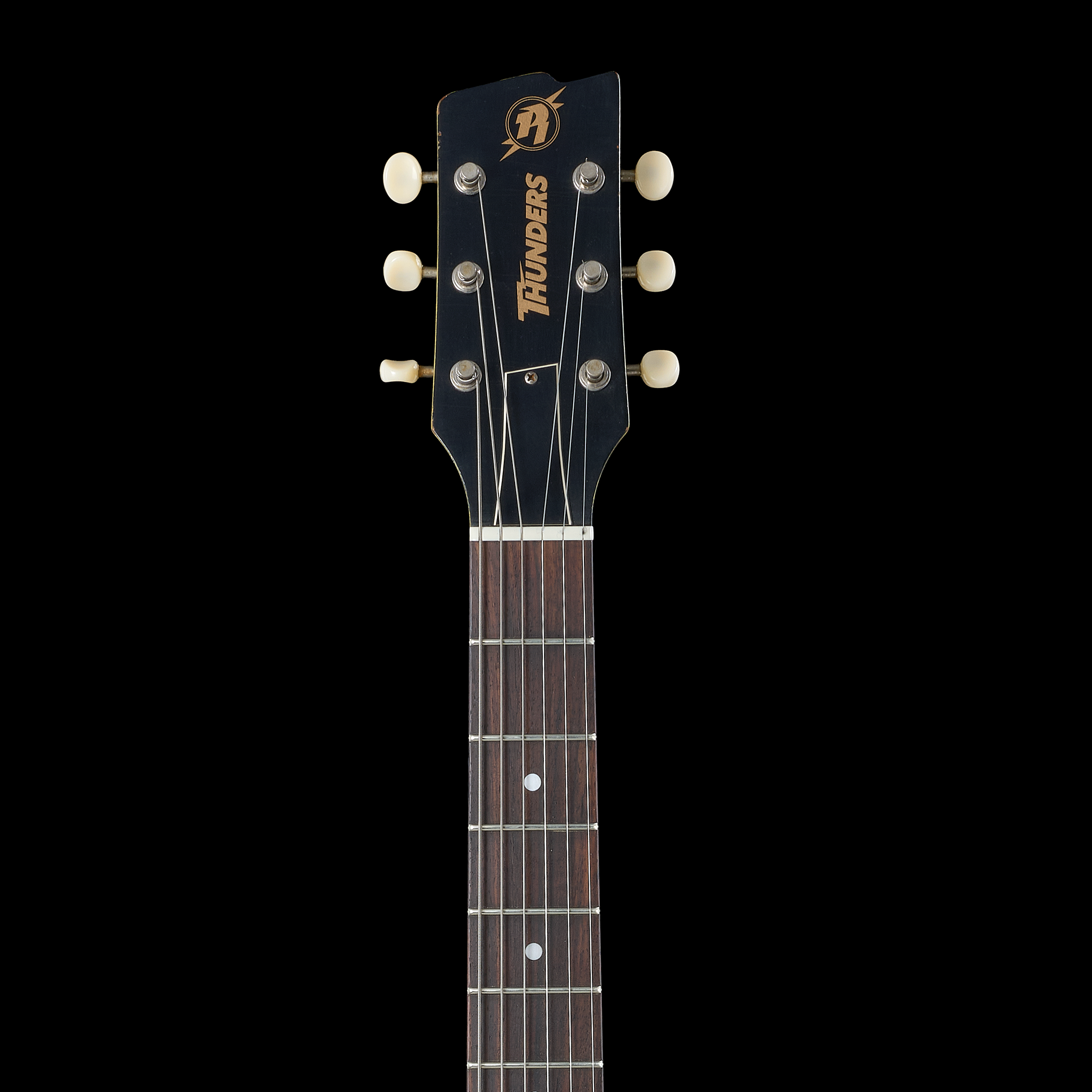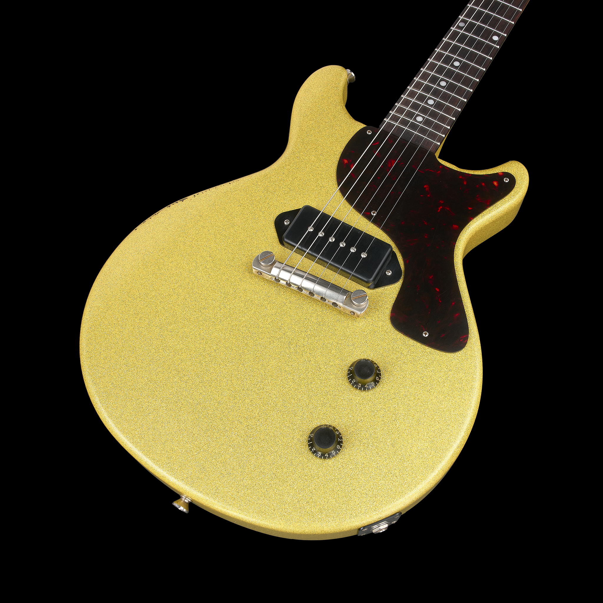 The Thunders DC in TV Yellow Sparkle is a stripped-down rocker with boutique bones. Built by Billy Rowe and his crew, this double-cut delivers vintage feel with modern guts. The 59 neck carve plays smooth and fast, while the Dirty Dog P-90s bark with clarity and punch. A Tone Pros Vintage bridge anchors the setup with solid intonation and classic styling. From the NOS finish to the Kluson tuners, every detail is dialed for tone, vibe, and stage-ready reliability.
