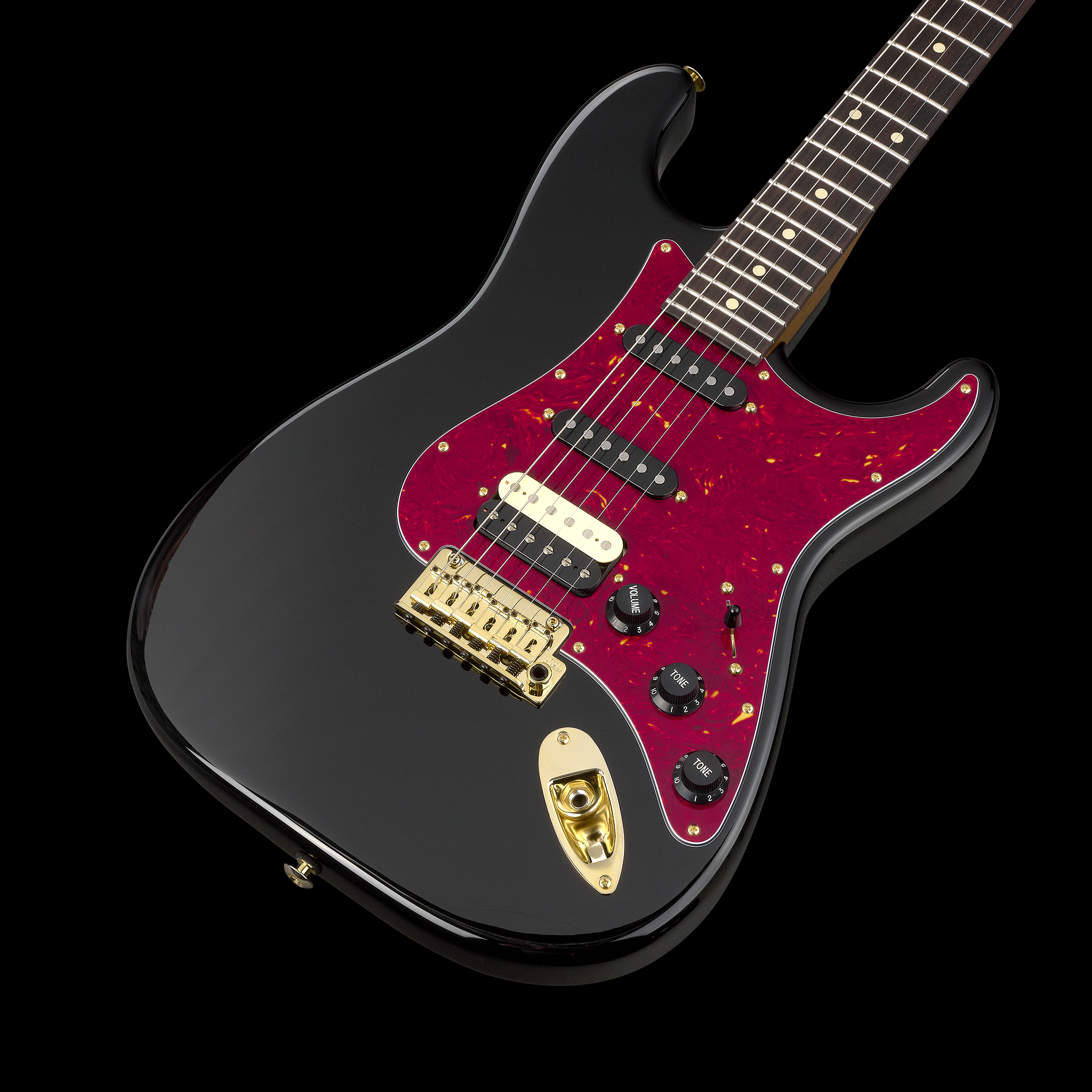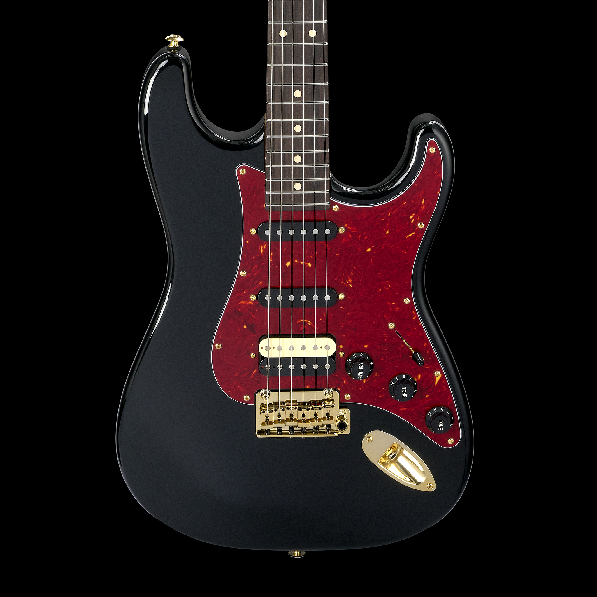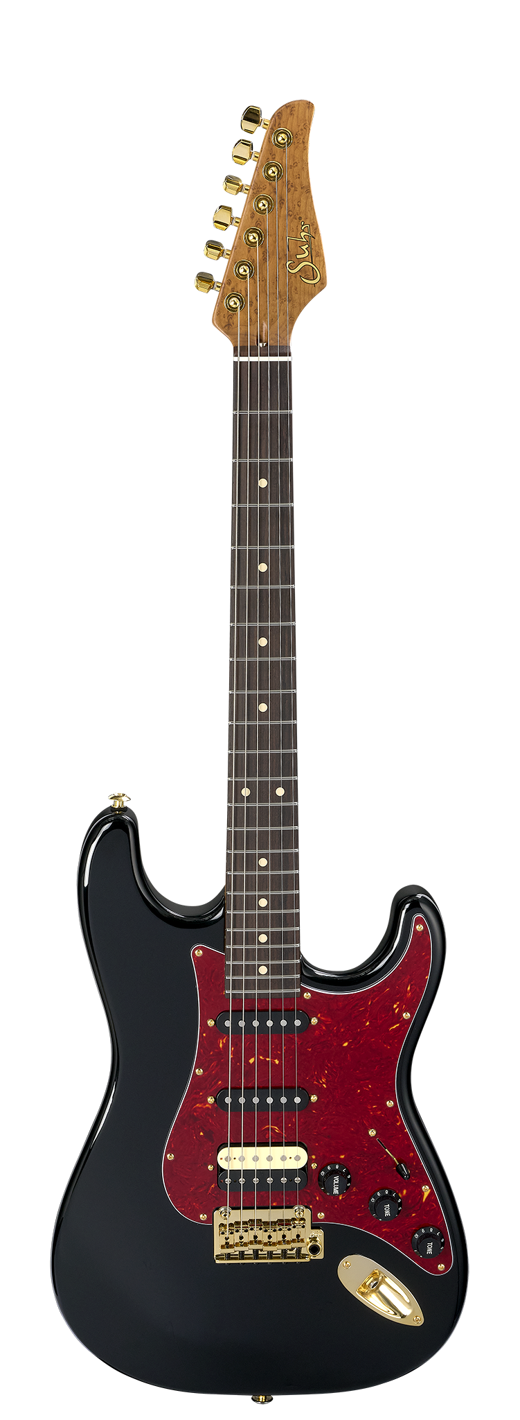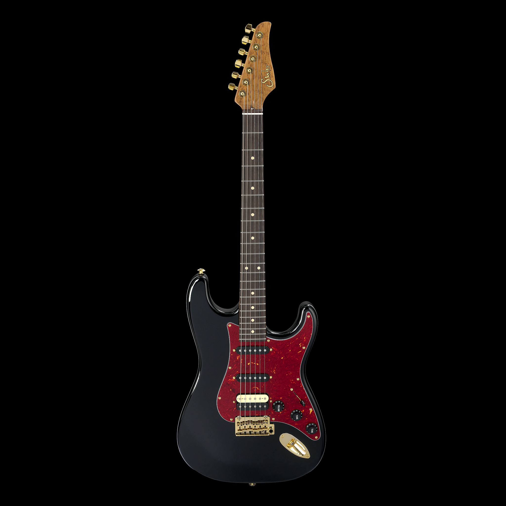 Built from a 2-piece alder body in gloss black, this guitar pairs sleek looks with gold hardware for a bold, stage-ready presence. The tortoise shell pickguard adds warmth and contrast, while the Suhr 2-post bridge with bent saddles and steel block ensures smooth tremolo action and reliable tuning.