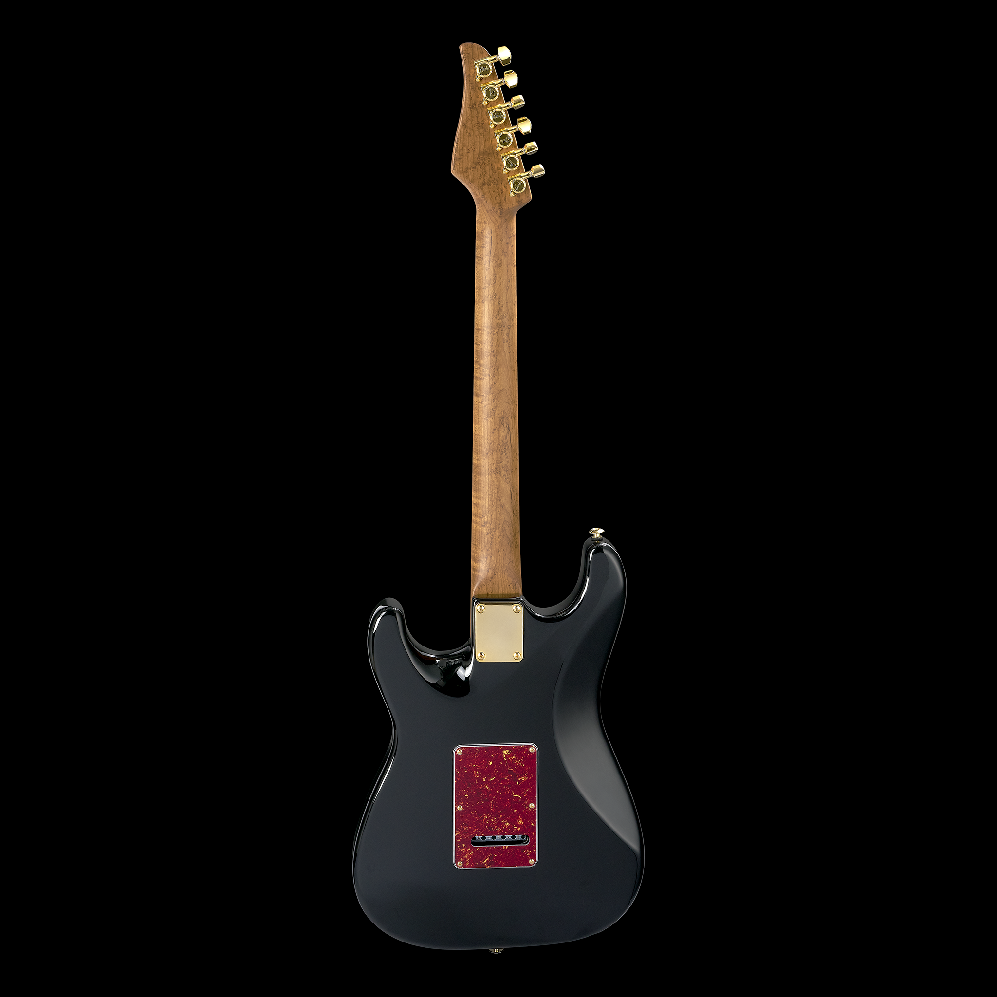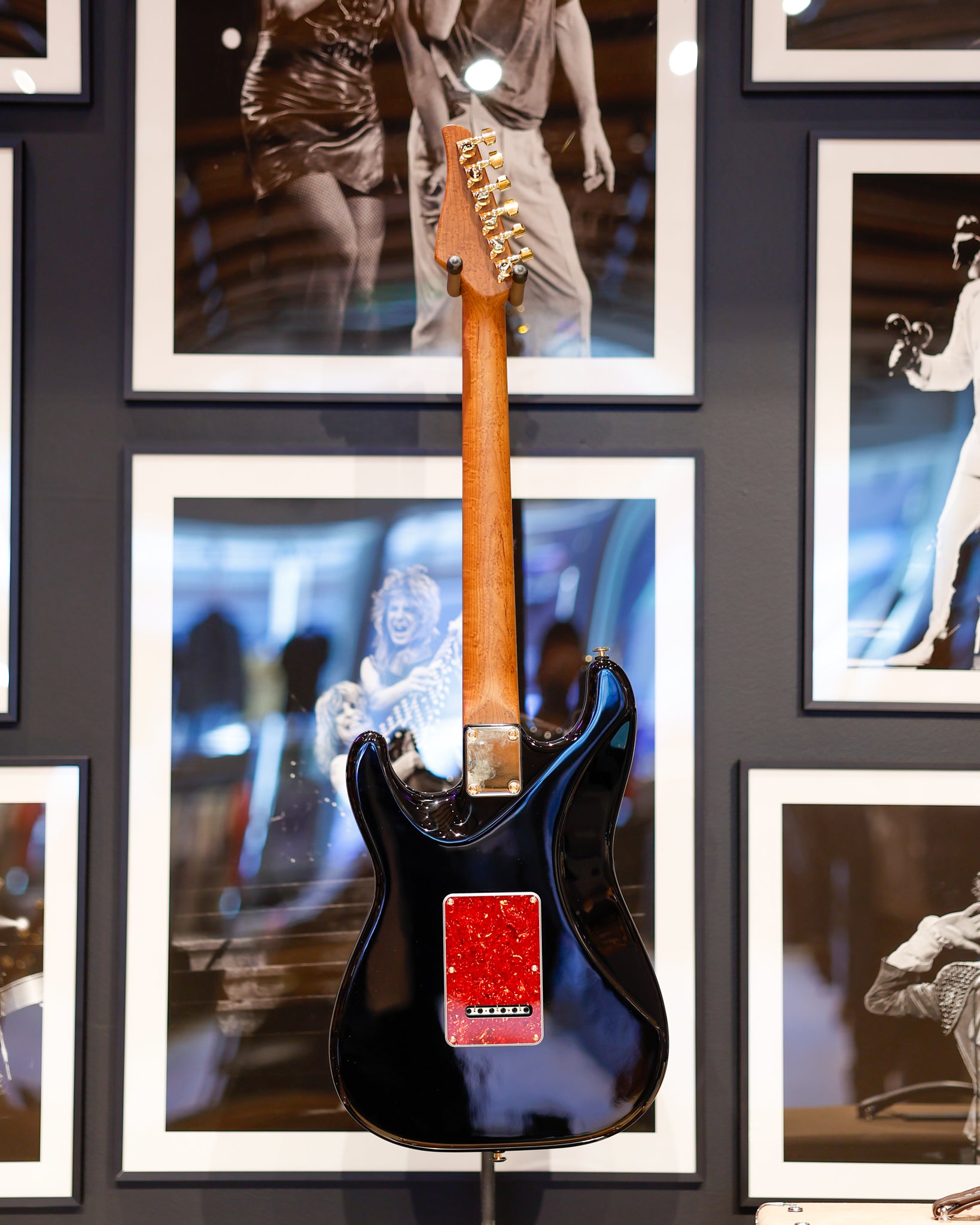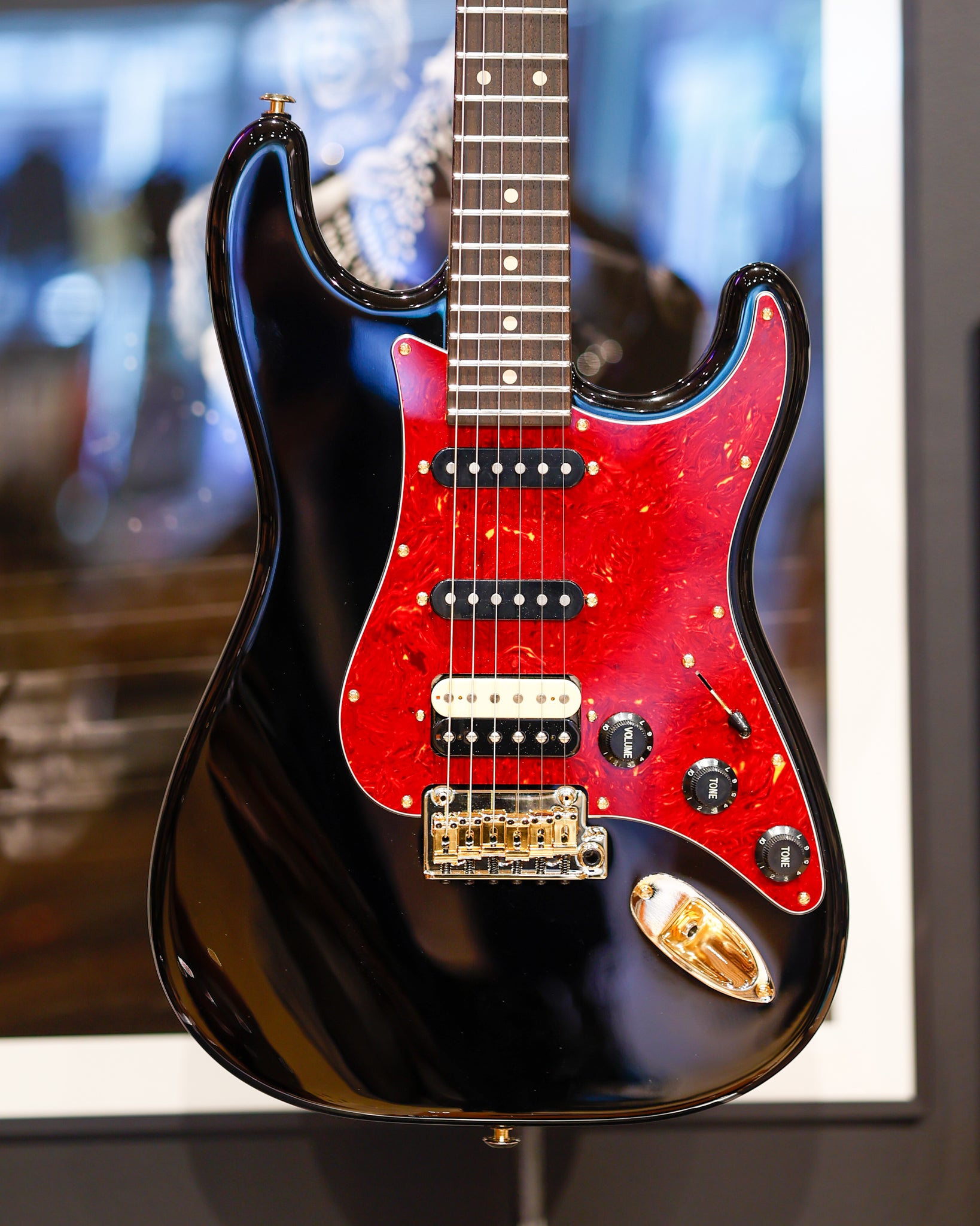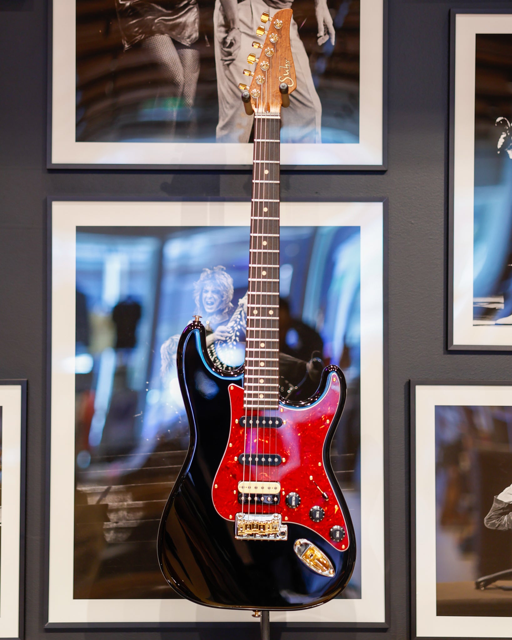 Built from a 2-piece alder body in gloss black, this guitar pairs sleek looks with gold hardware for a bold, stage-ready presence. The tortoise shell pickguard adds warmth and contrast, while the Suhr 2-post bridge with bent saddles and steel block ensures smooth tremolo action and reliable tuning.