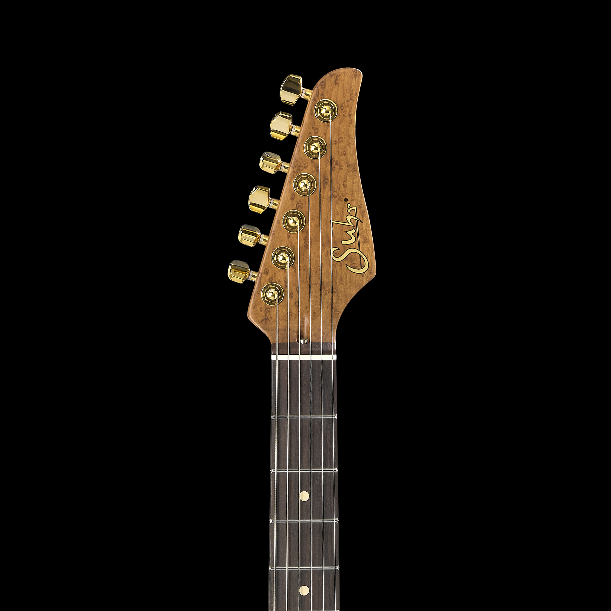 Electronics include ML Standard single coils in the neck and middle positions for glassy cleans and punchy rhythm tones. The bridge houses a Doug Aldrich Signature humbucker, delivering aggressive output with tight lows and singing highs. A 5-way blade switch and dual tone controls offer versatile shaping across genres. Finished with Suhr locking tuners and gold accents throughout, this build balances elegance, attitude, and precision.