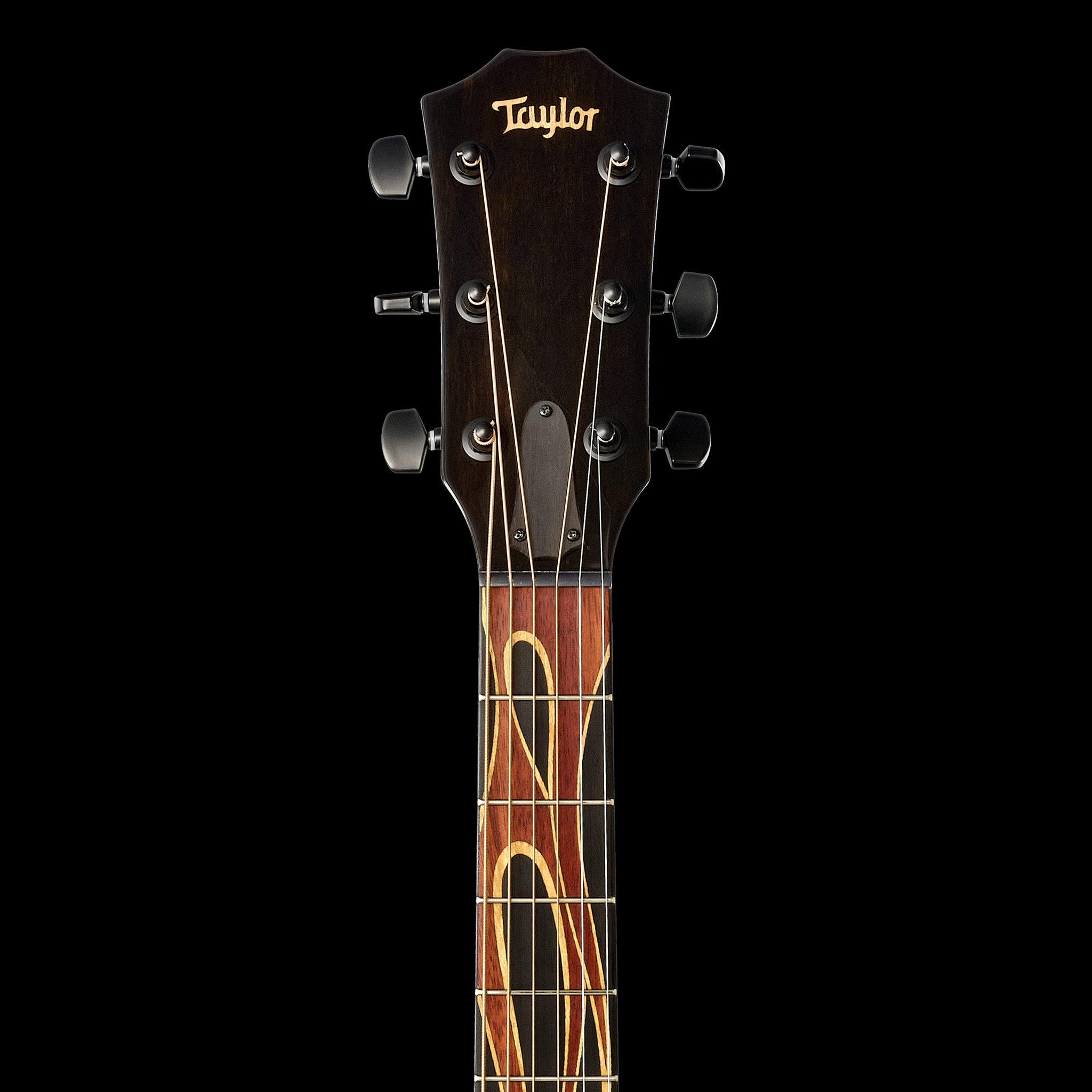 Bold, fiery, and built to perform, the Custom Shop C14ce Catch Event #34 “Hot Rod” Grand Auditorium is a standout tribute to Taylor’s 2003 Hot Rod Guitar, now reimagined with modern tone and playability upgrades. Its bearclaw Sitka spruce top and figured Big Leaf maple back and sides offer bright, articulate tone with rich dynamics, enhanced by V-Class bracing for improved sustain and clarity. The iconic red and yellow flame motif returns, brought to life with vivid satinwood and bloodwood inlays across the ebony fretboard and rosette.