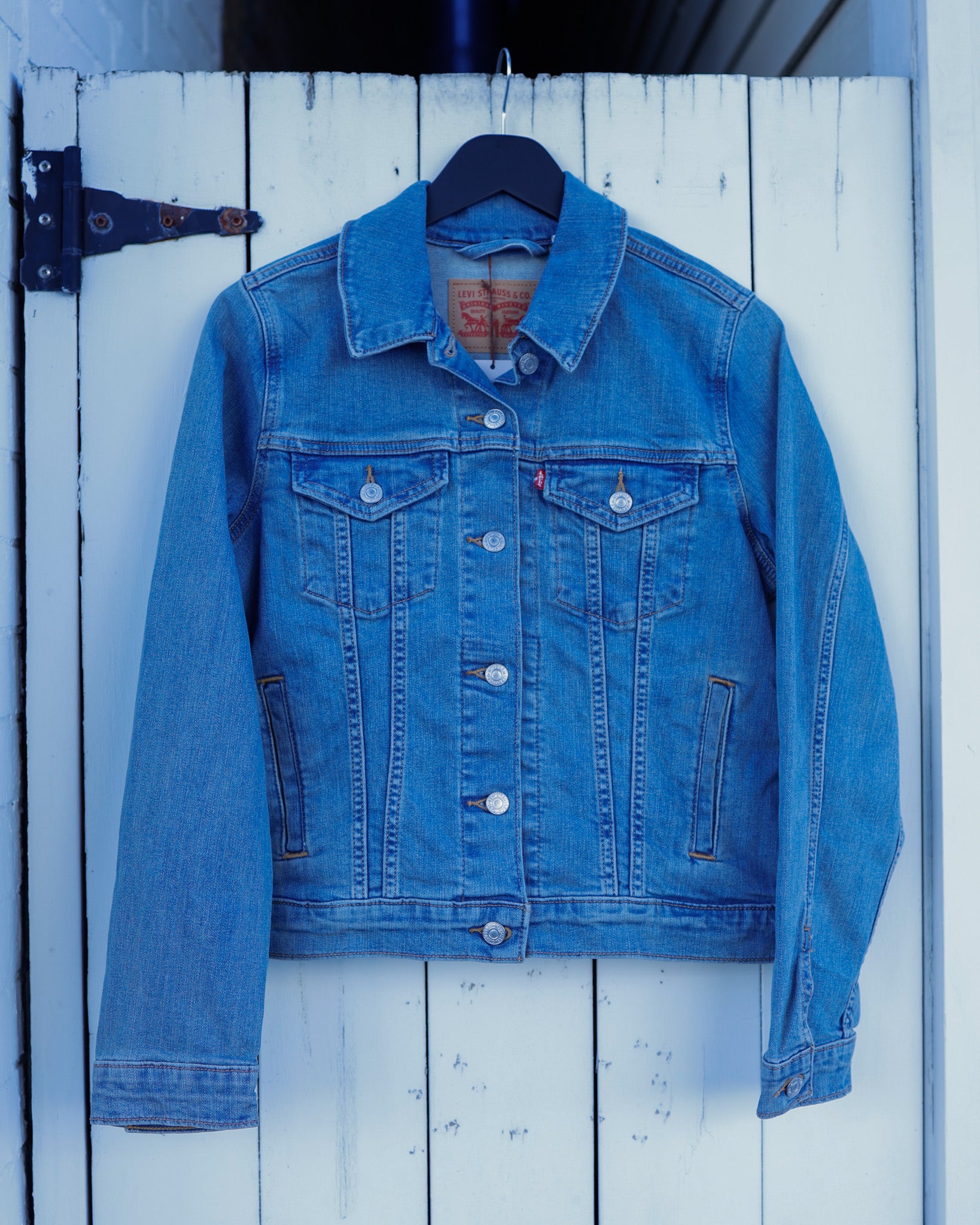 Show your love for Taylor Swift with this one-of-a-kind hand-painted denim jacket. Featuring a vibrant portrait of Taylor Swift on the back and her initials “T.S.” above, this piece transforms a classic blue Levi’s women’s medium jacket into wearable art.